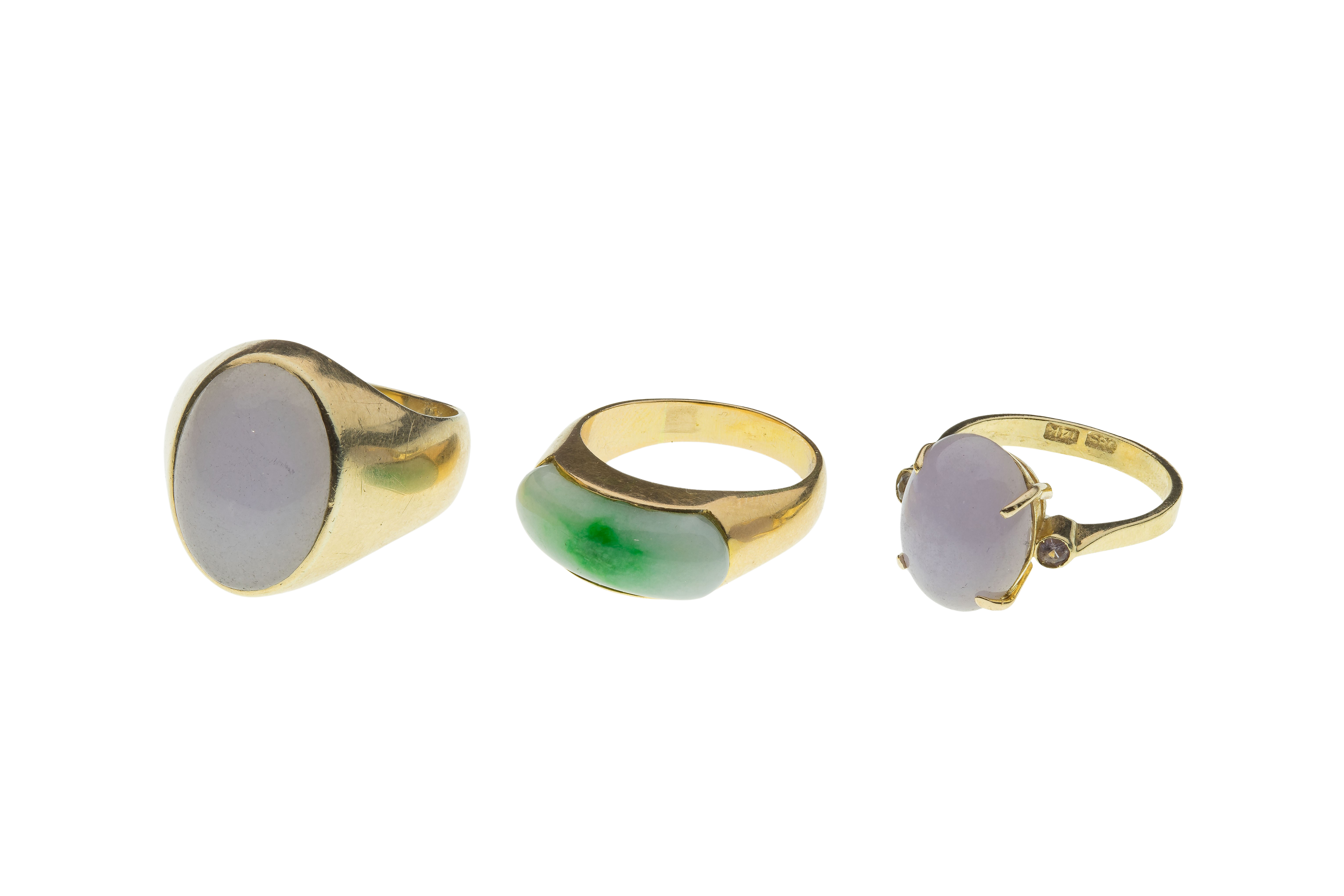 (3) rings including (2) oval lilac jadeite jade and a green to white jadeite jade bar style (all marked ’14k’)