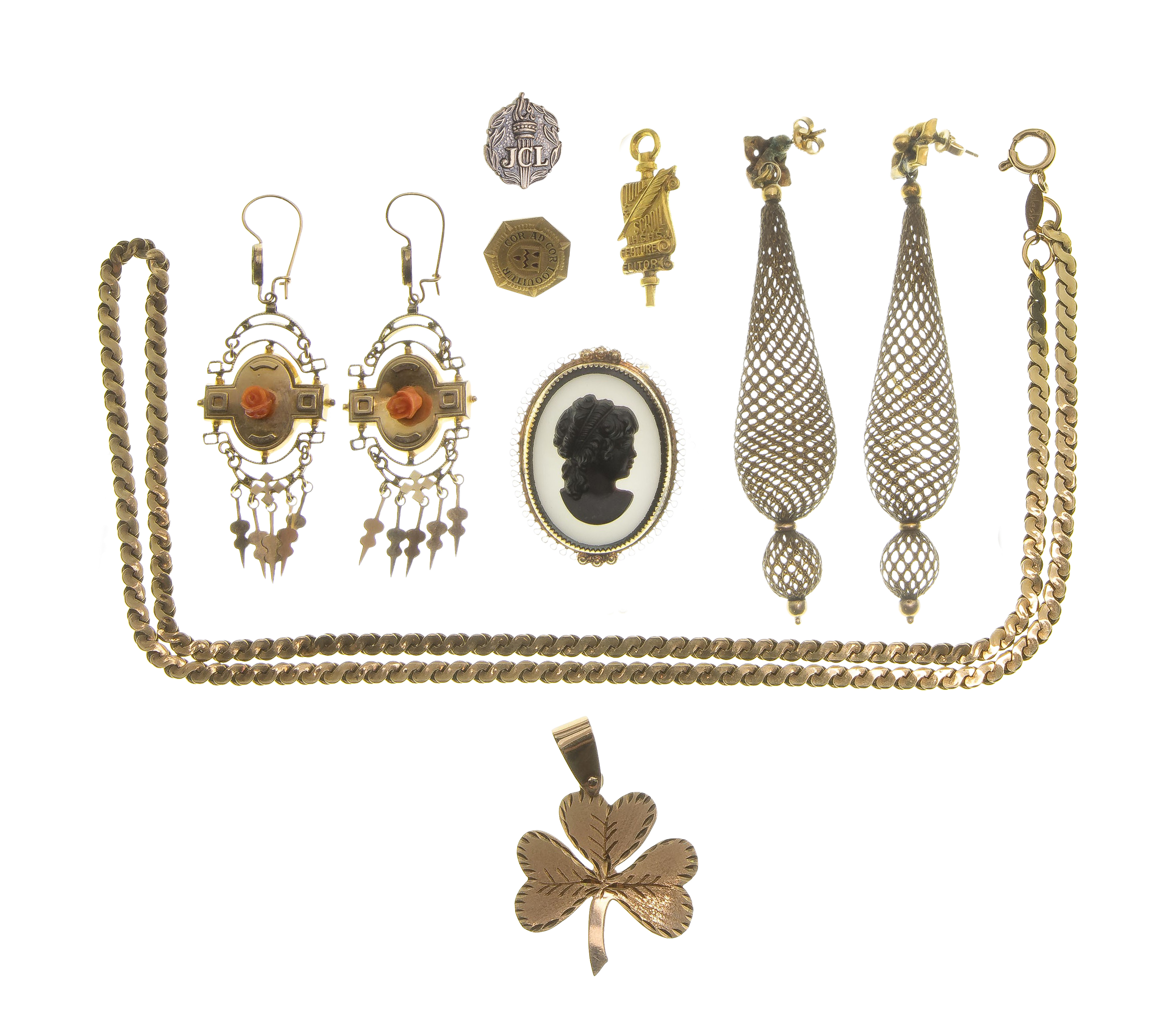 (7) items including a necklace and a pendant (marked ’10k’), a lapel pin (marked ‘925’) as well as pins and a pair of mourning braided hair earrings