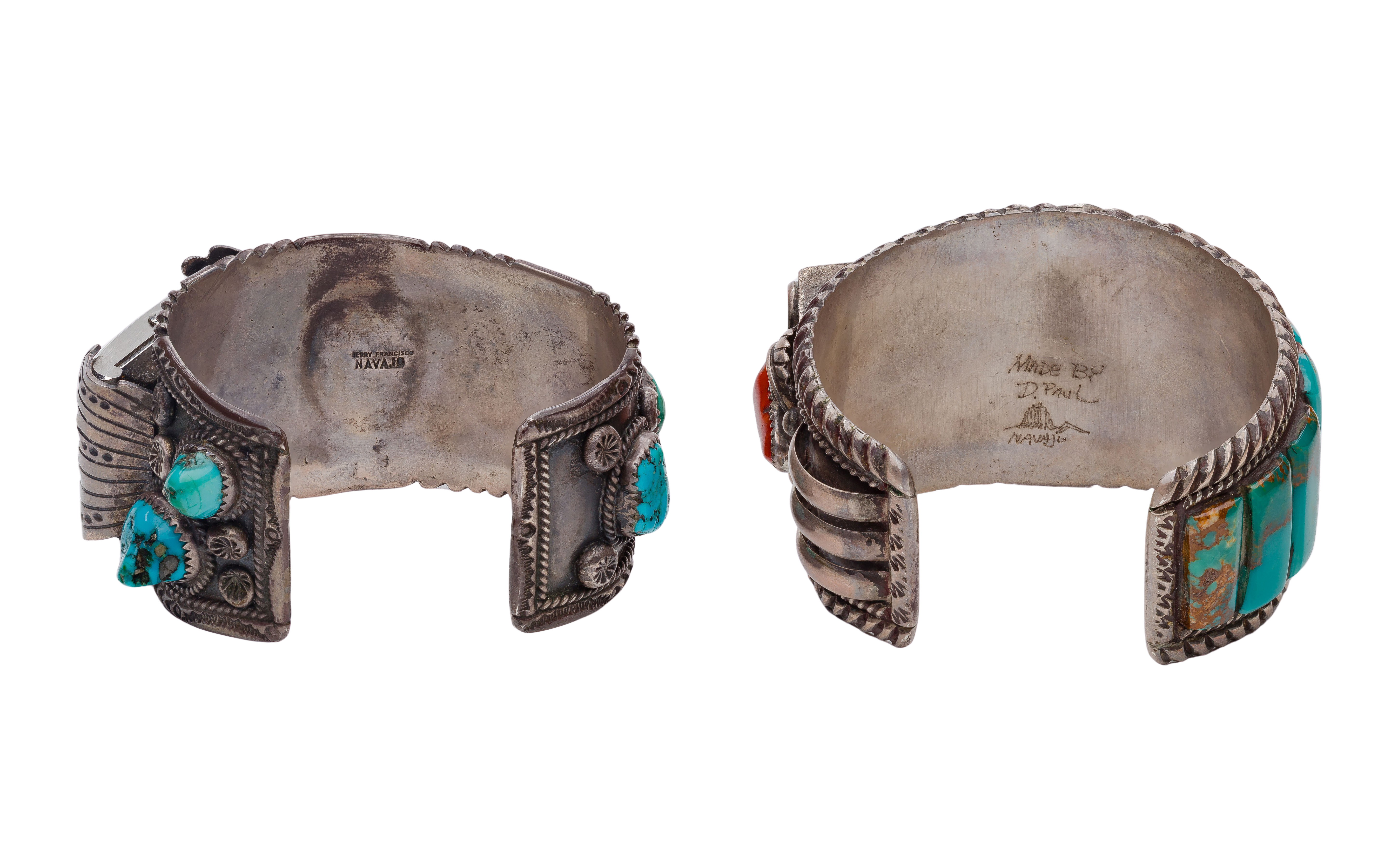 (2) items including a cuff bracelet having green turquoise and coral by Delores Paul (signed on interior) and a Universal Automatic wristwatch set on a cuff bracelet having green turquoise by Jerry Francisco (marked ‘Jerry Francisco’ on interior)