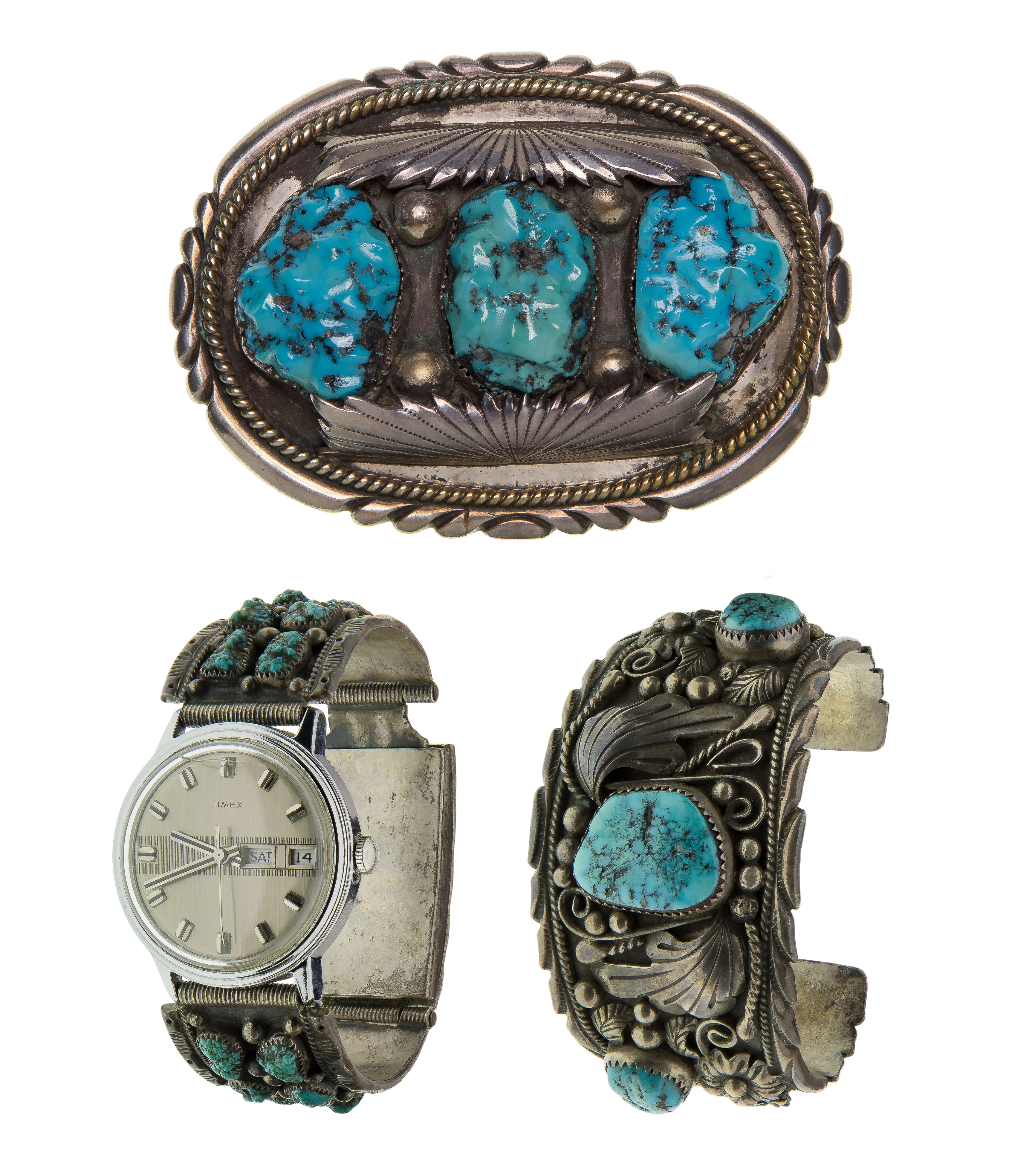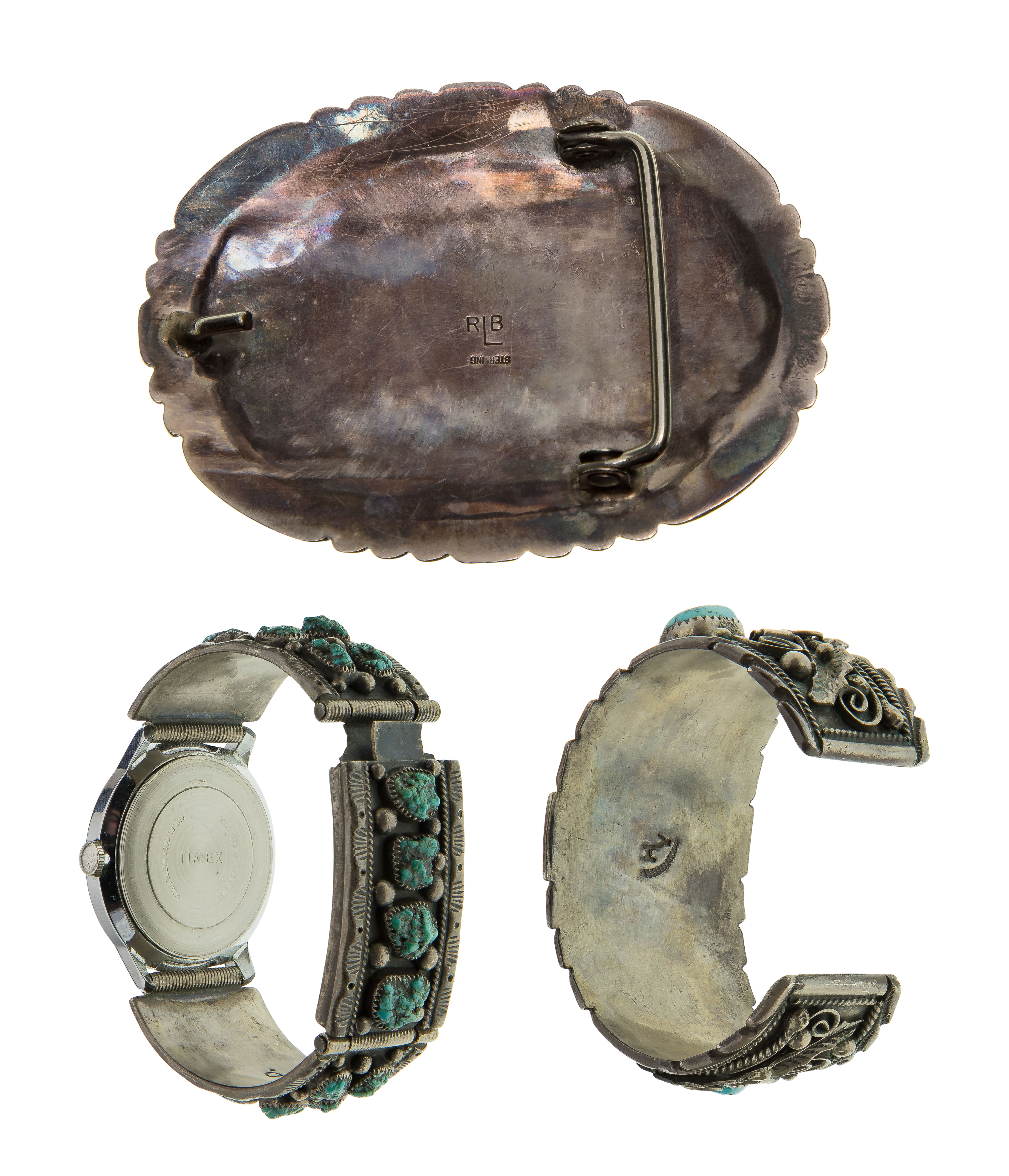 (3) items including a belt buckle (3.25 by 2.375-inches) by Robert & Bernice Leekya (Zuni) (marked ‘sterling’ and ‘RLB’), a cuff bracelet (marked ‘HY’) and a Timex wristwatch on band (marked ‘L.D.’)