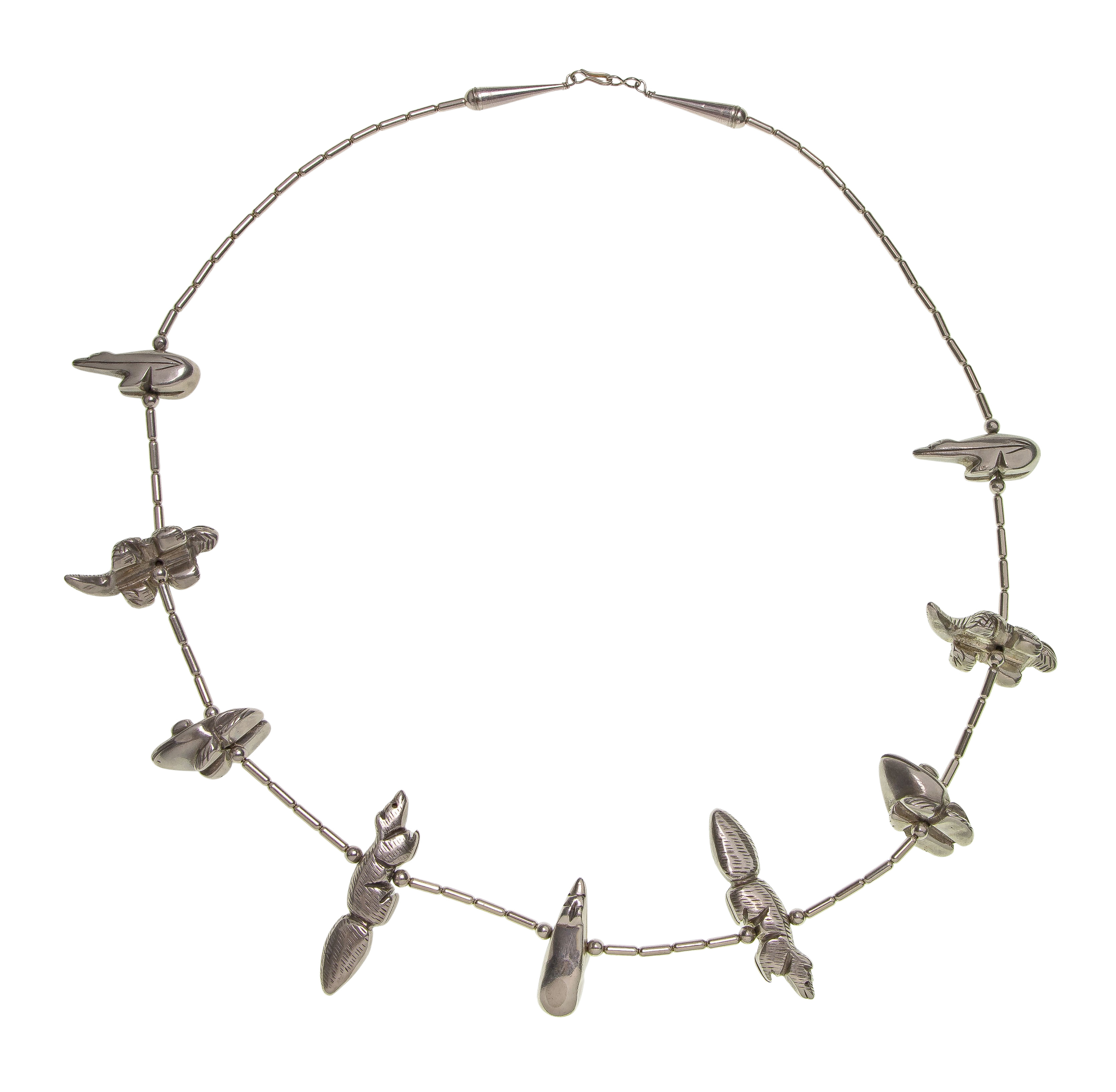 A fetish necklace having animal charms including beavers, frogs, bears and lizards (marked ‘sterling’)