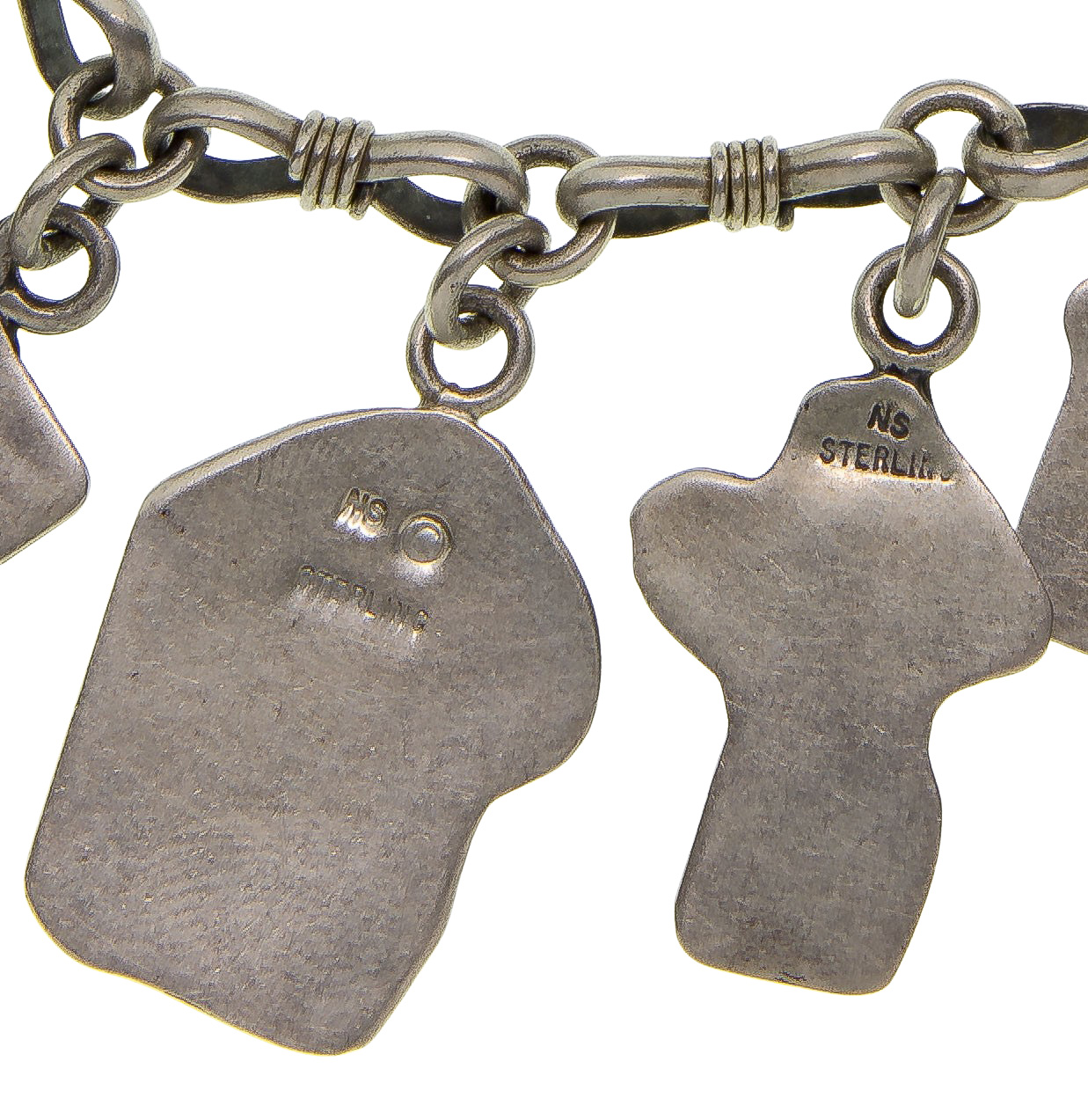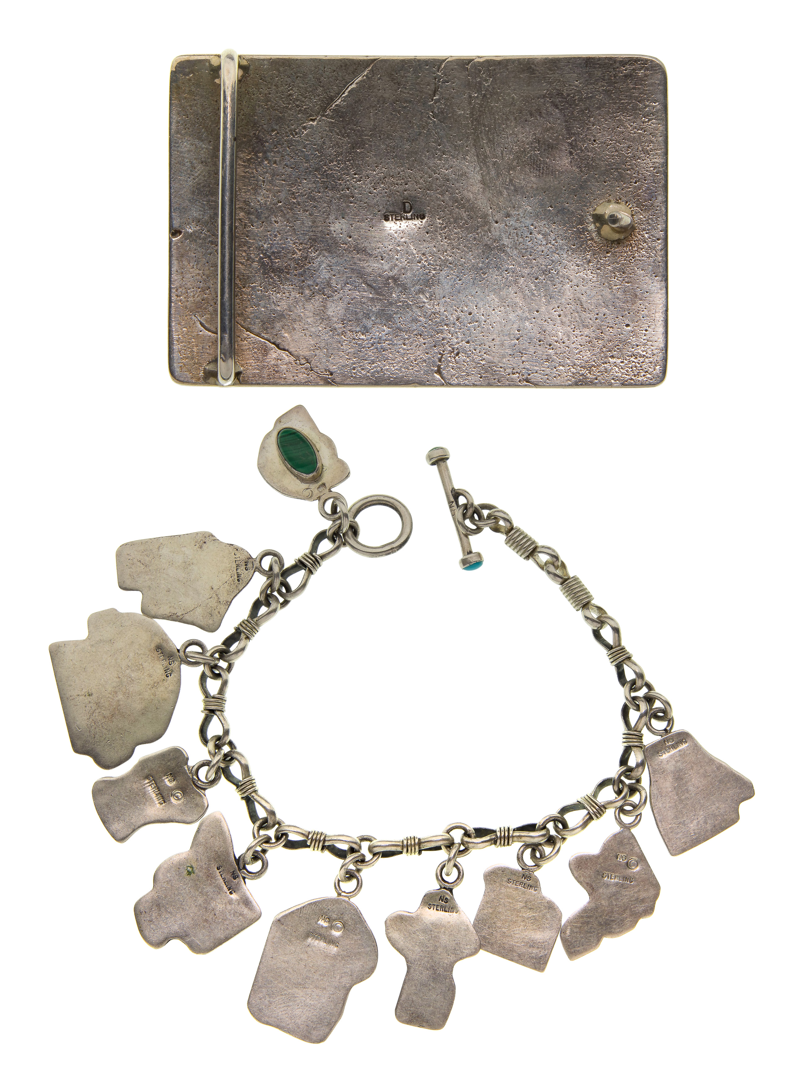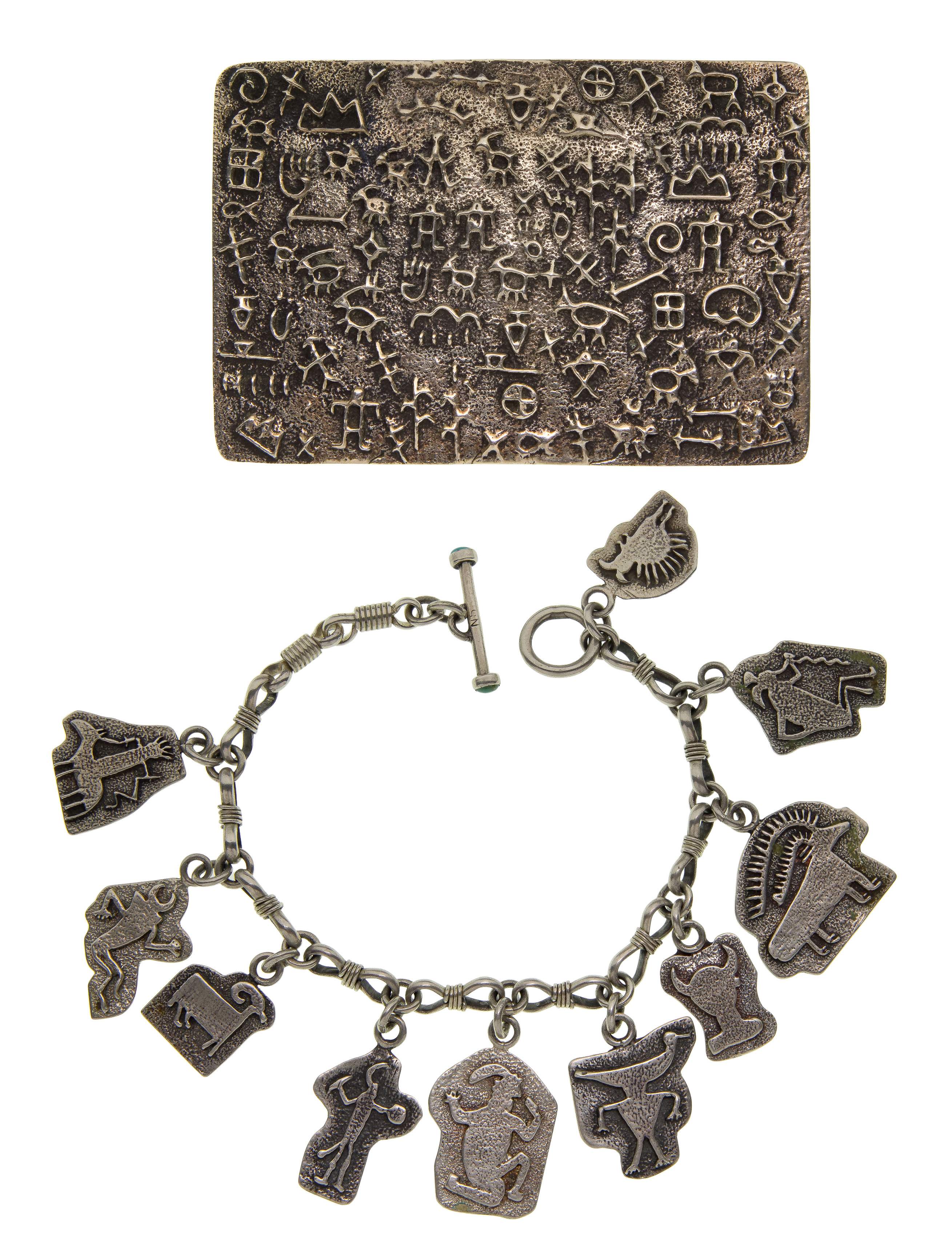 (2) items including a charm bracelet signed ‘NS’ having ten raised figure charms and a belt buckle signed ‘D’ having raised figures of mountains, clouds, corn, deer, people and more (both marked ‘sterling’)