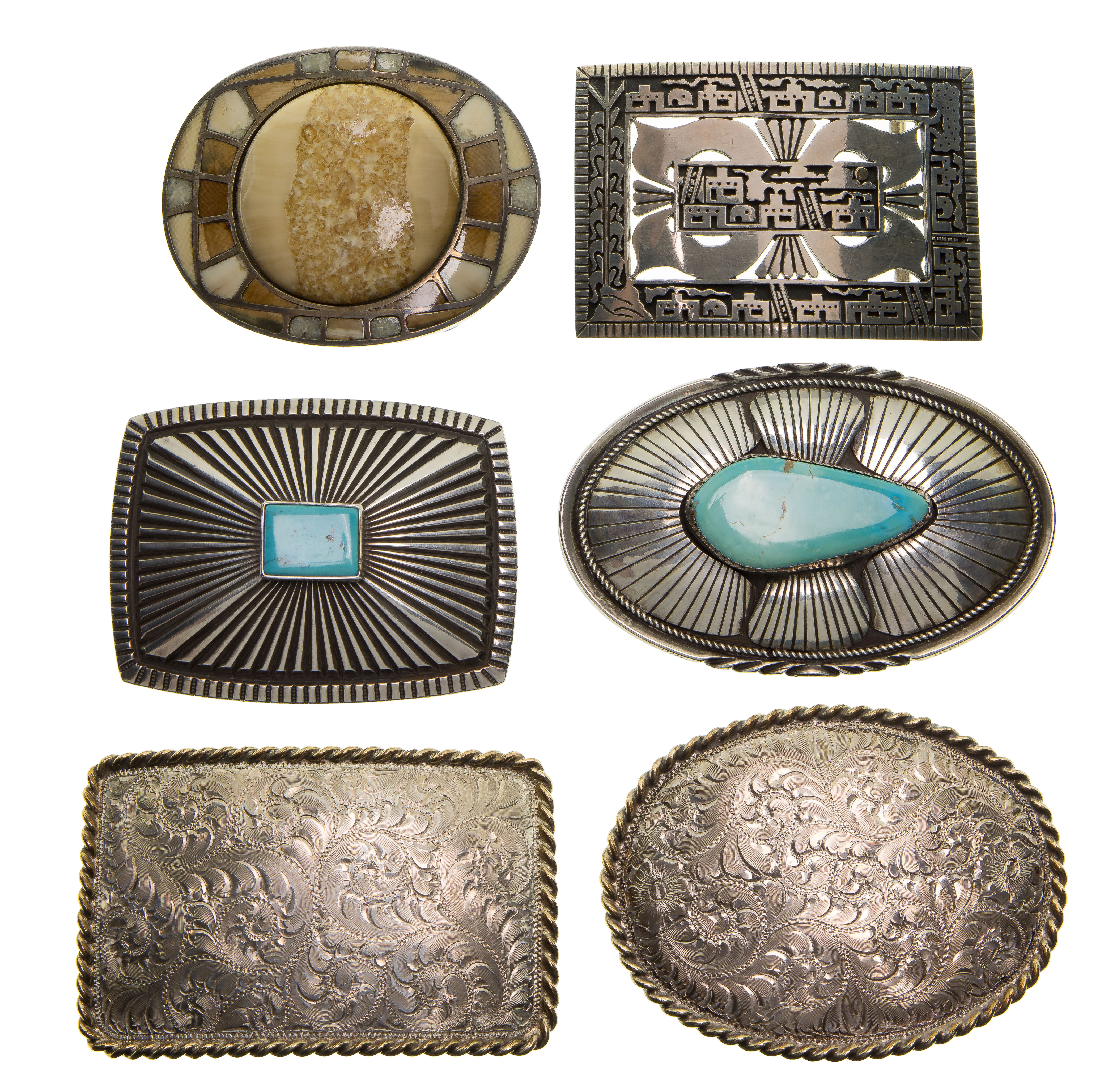 (6) total items including an openwork buckle by Joseph De Vern Coriz, a brown polished agate by ‘WB’ and (2) having blue turquoise; together with (2) belt buckles by Treasure Reno Chest (most items marked ‘sterling’)