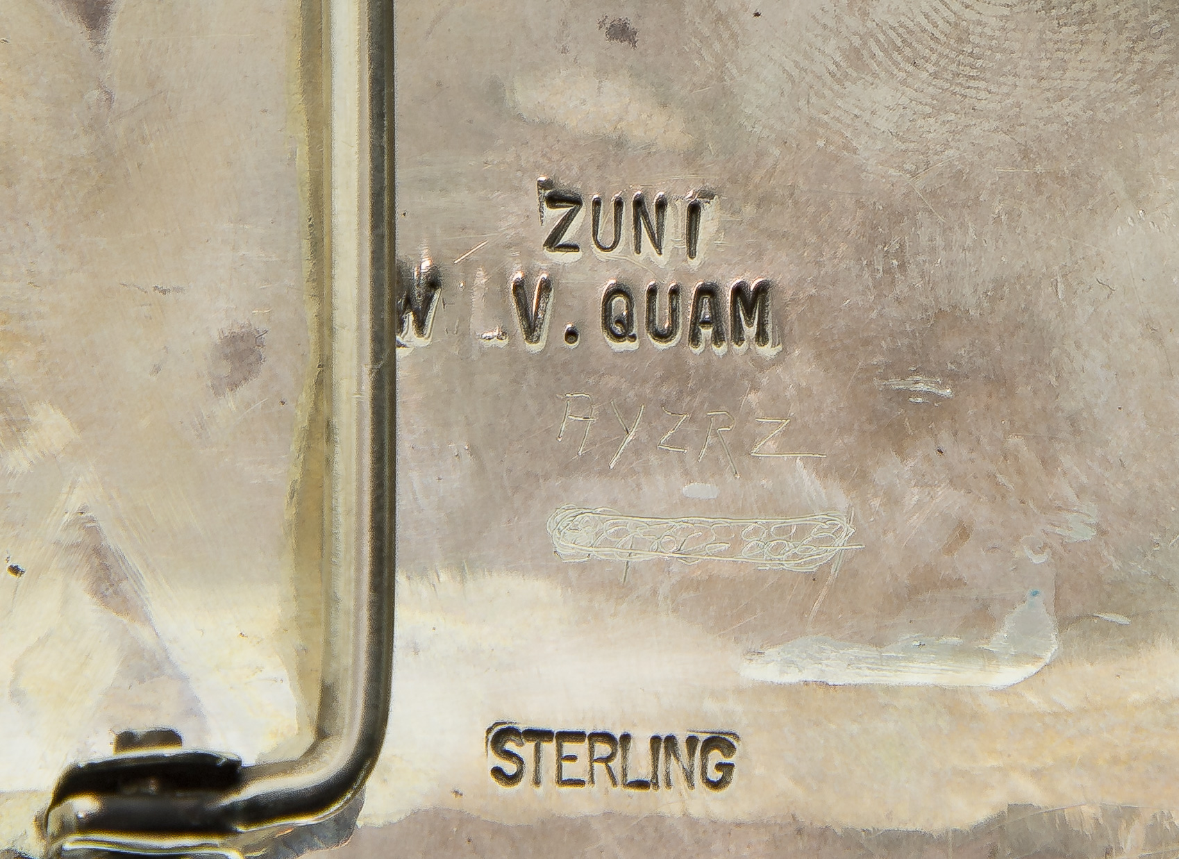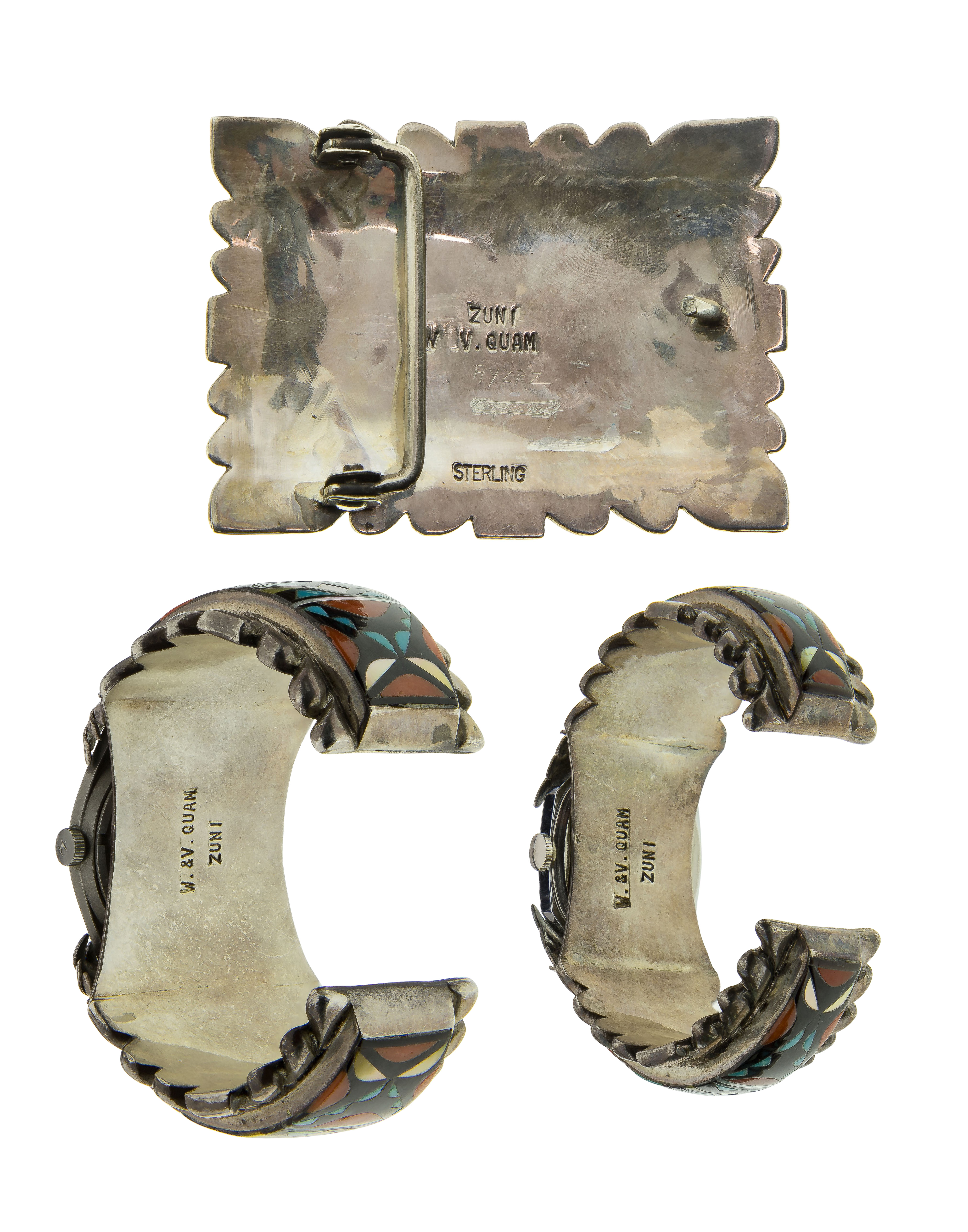 (3) items signed with variations of ‘W. & V. Quam’ (Zuni) including a rectangular belt buckle, a Hamilton Khaki automatic wristwatch on a band having silver shoulders and a Timex battery operated wristwatch on a band having silver shoulders, all adorned with mother-of-pearl, turquoise, coral and onyx (all marked ‘sterling’)