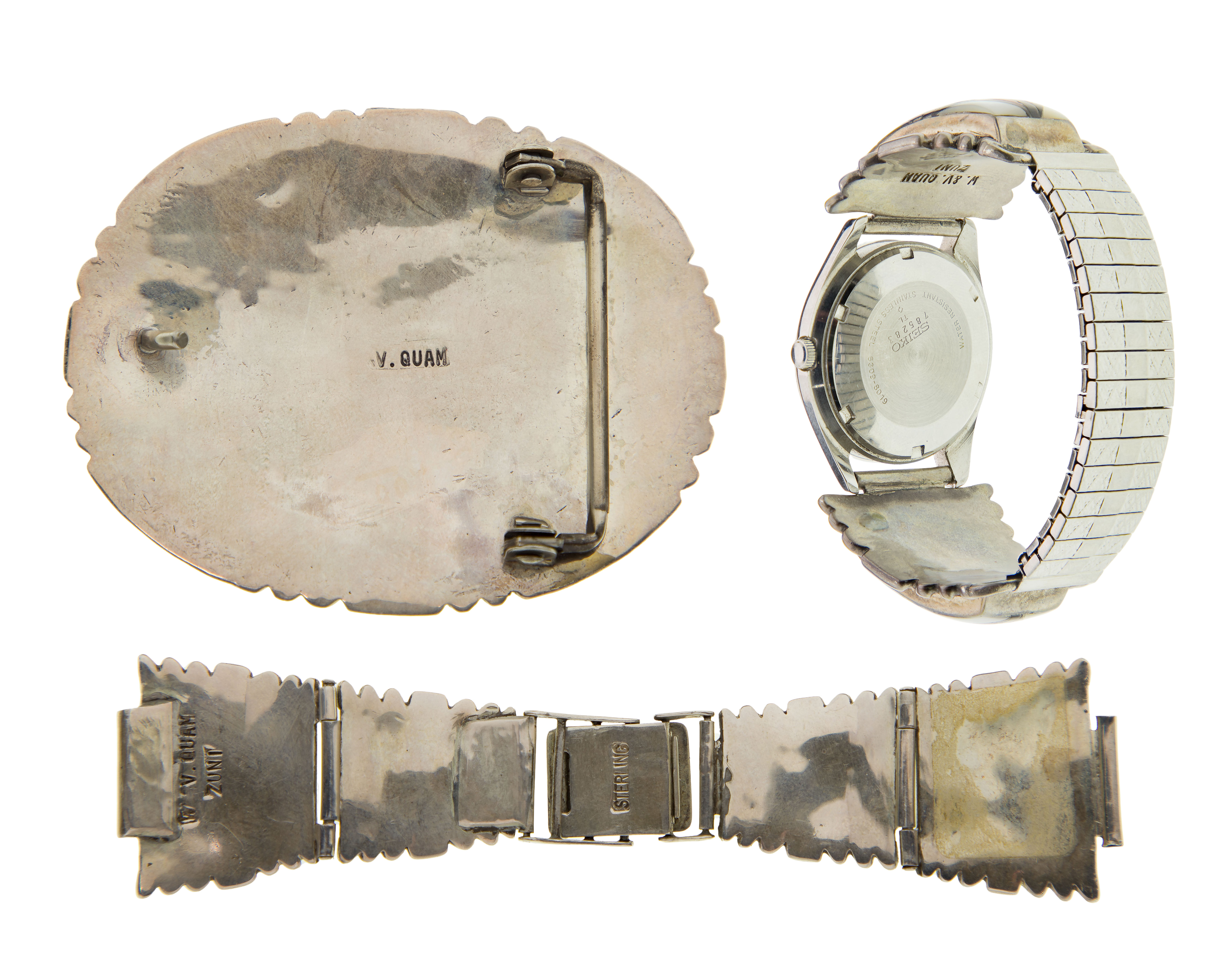 Native American W. & V. Quam Sterling Silver Wristwatch, Watch Band and Belt Buckle