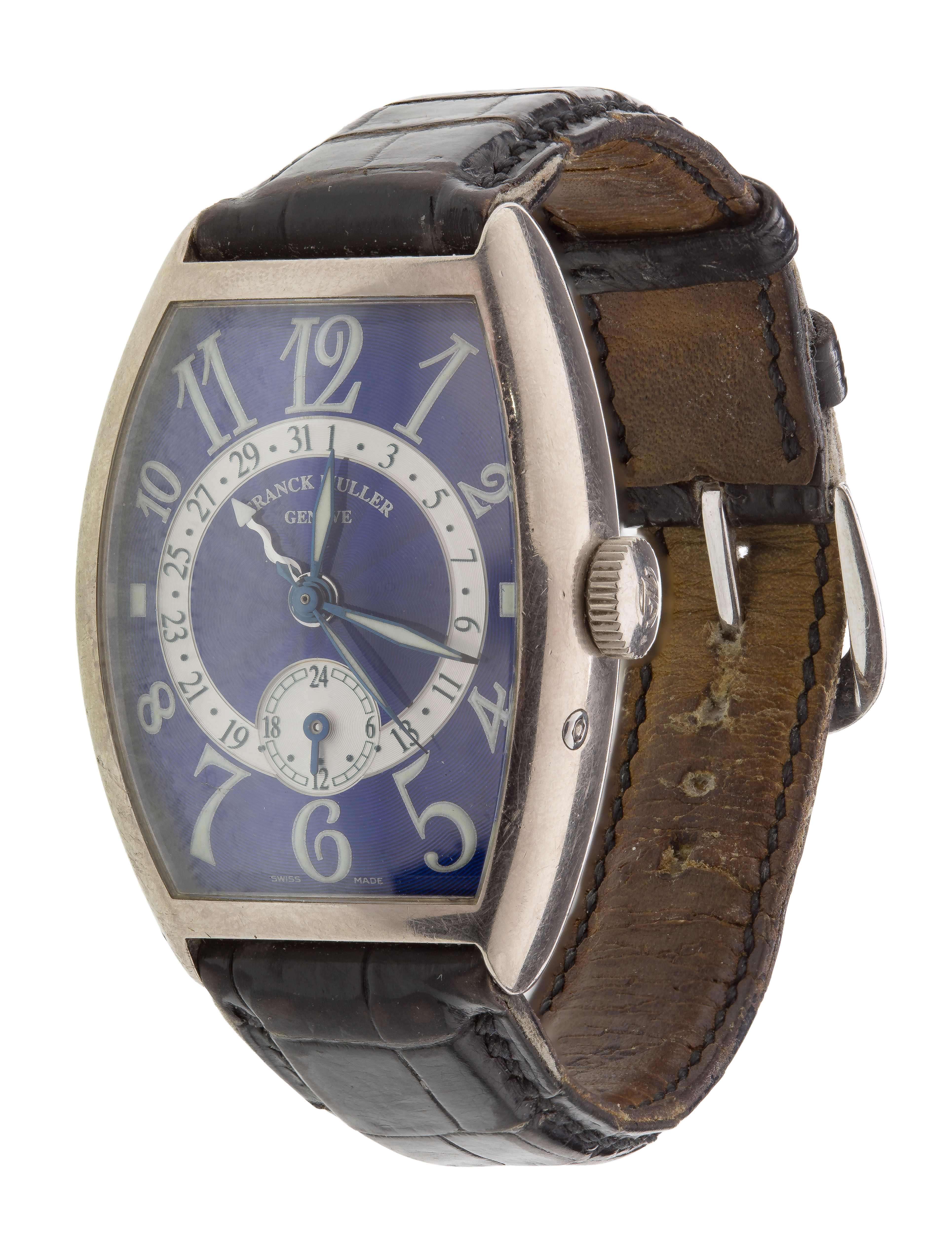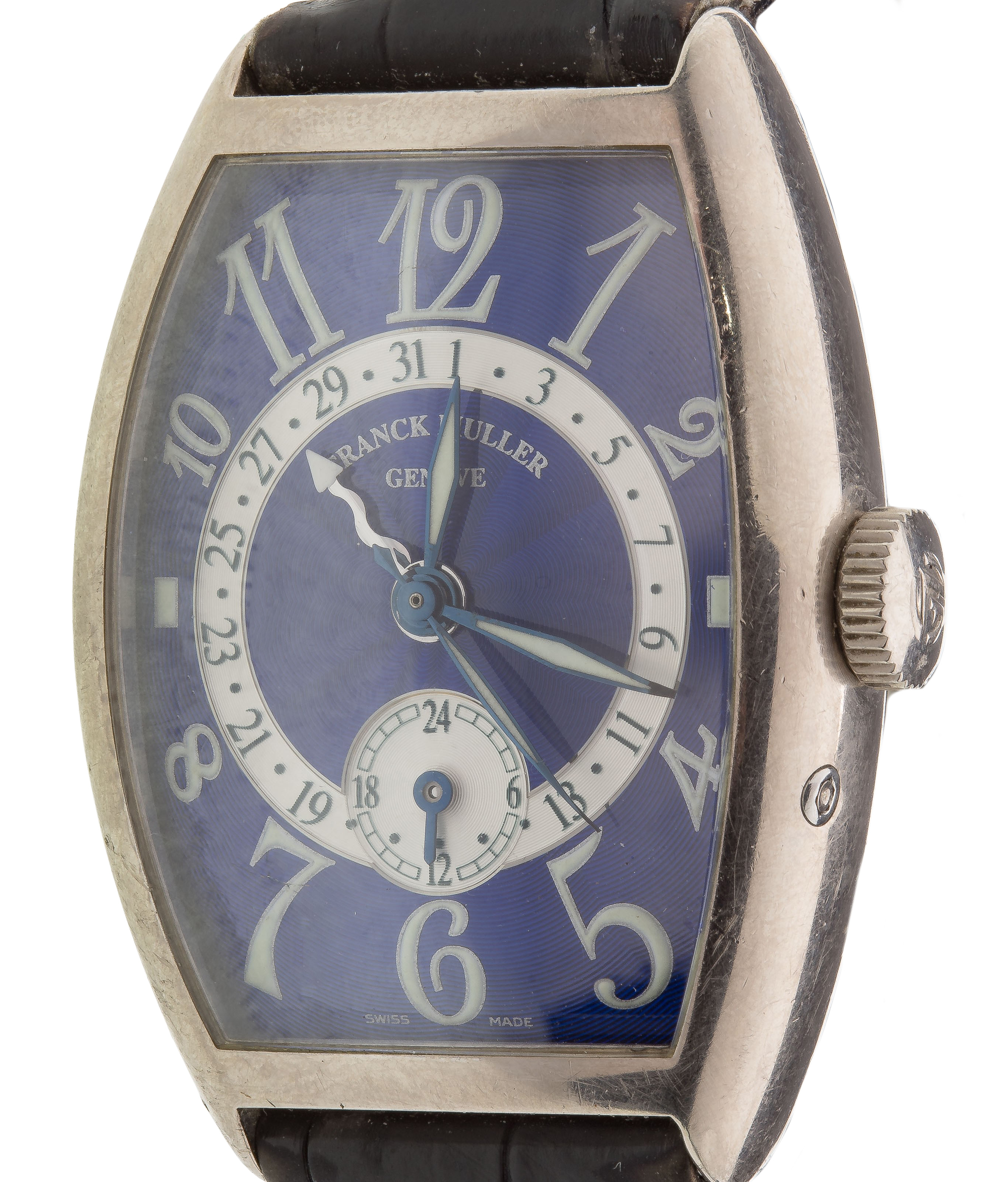 #74, serial #5850 Q 24, manual wind, sunburst guilloche engraved blue dial, luminous Arabic numerals, seconds sub-dial at 6, steel dagger hands with luminous inserts, brushed and polished tonneau form, crocodile leather strap having buckle (marked ‘750’ on case and buckle)