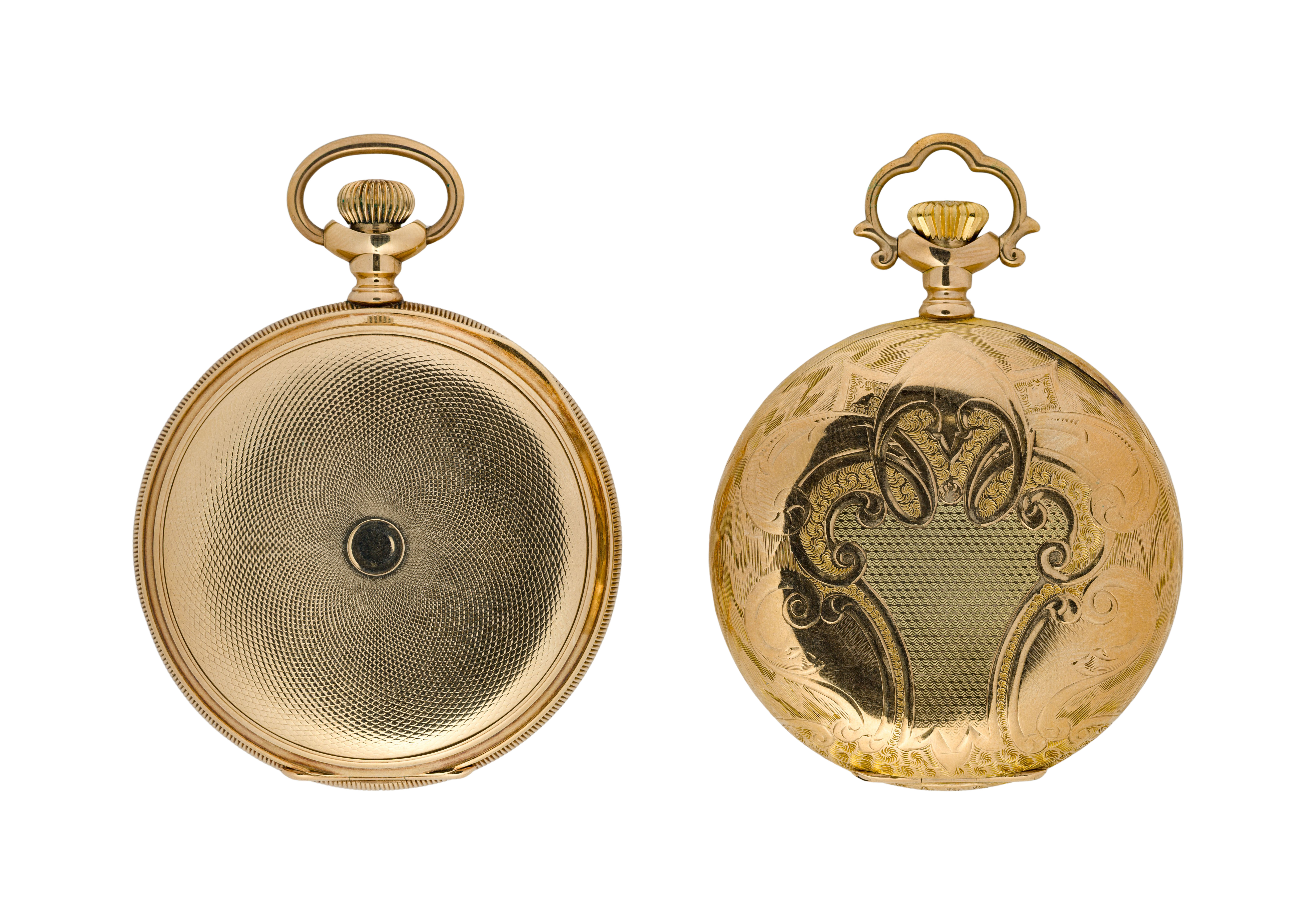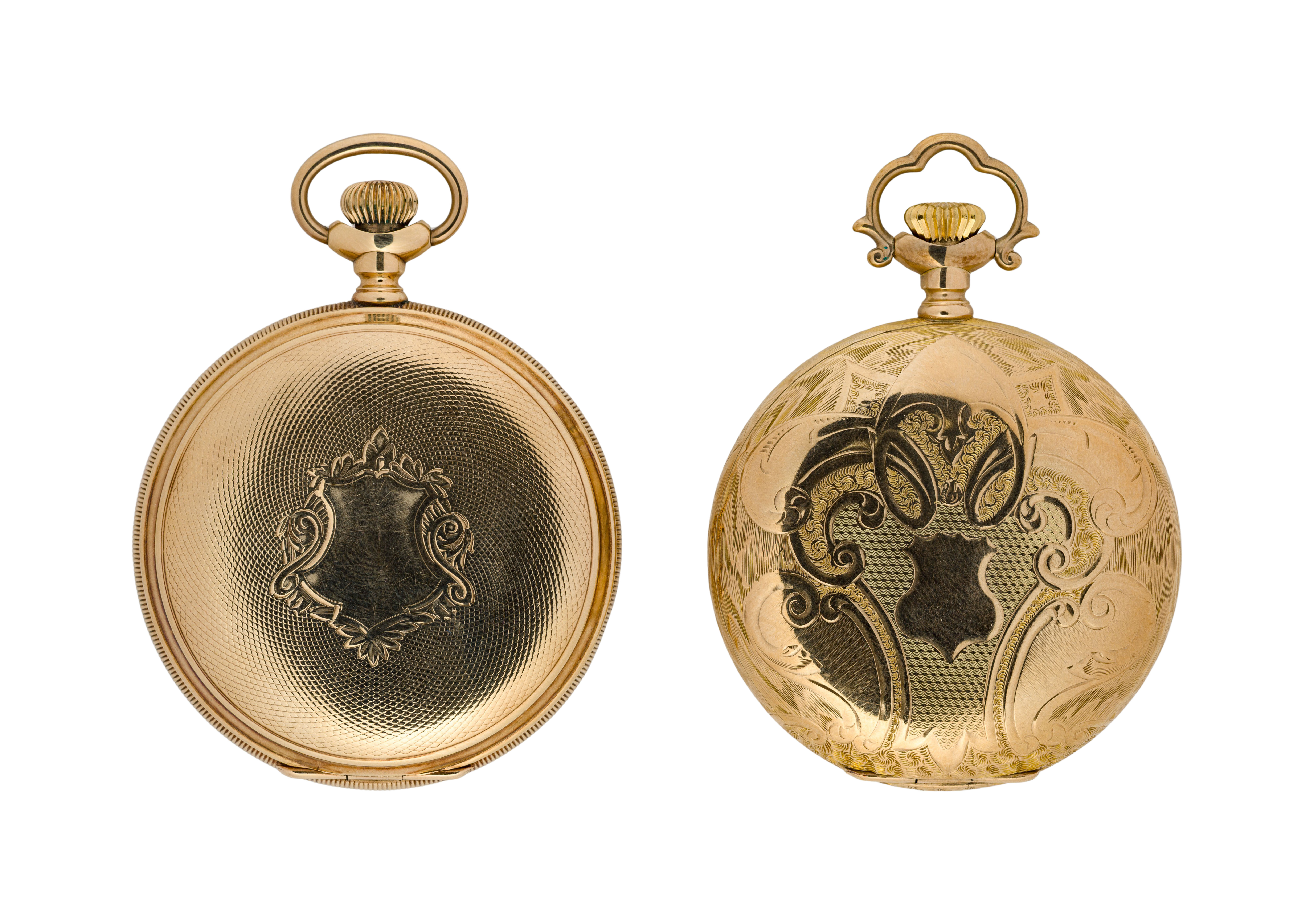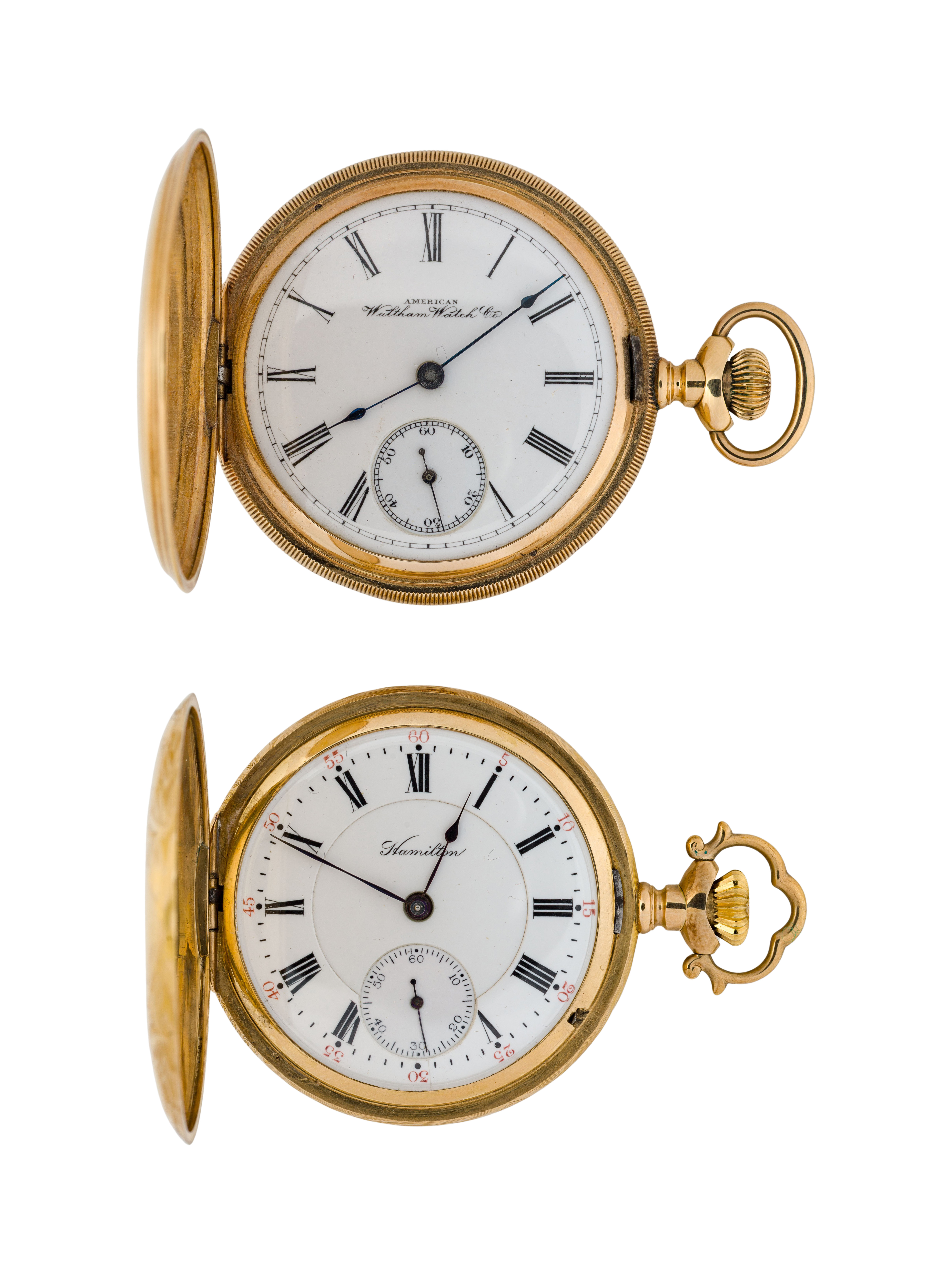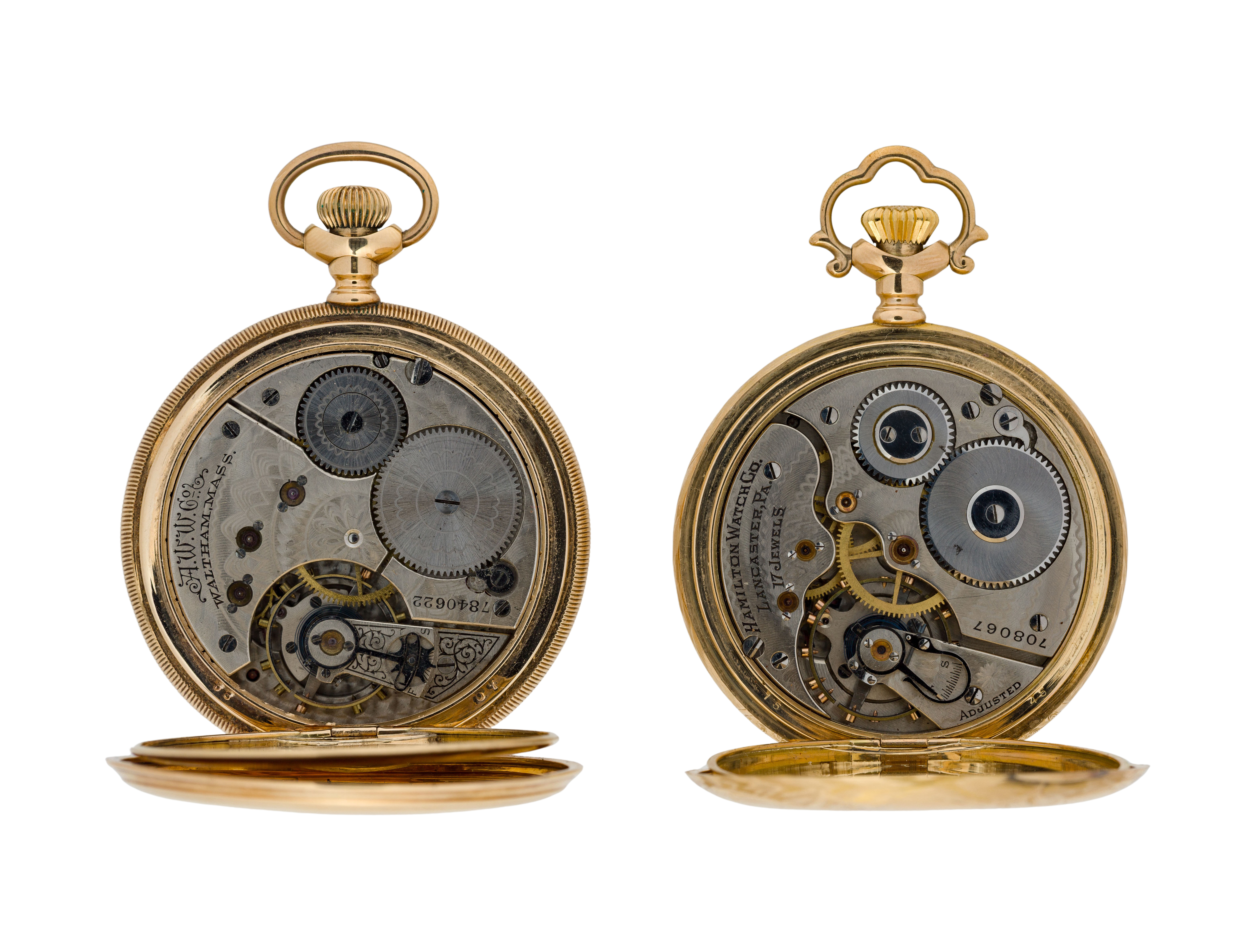 (2) items including a Hamilton serial #708067 dating to c.1903, 17-jewel movement, No.975 grade, white dial having Roman numerals, blue hands, subsidiary dial for seconds, stem wind, lever set (marked ‘Warranted 14k To Assay’ inside case) and an American Waltham Watch Co. serial #7840622 dating to c.1896, 16-jewel movement, special grade, white dial having Roman numerals, blue hands, subsidiary dial for seconds, stem wind, stem set (marked ‘Warranted 14k U.S. Assay’ inside case)