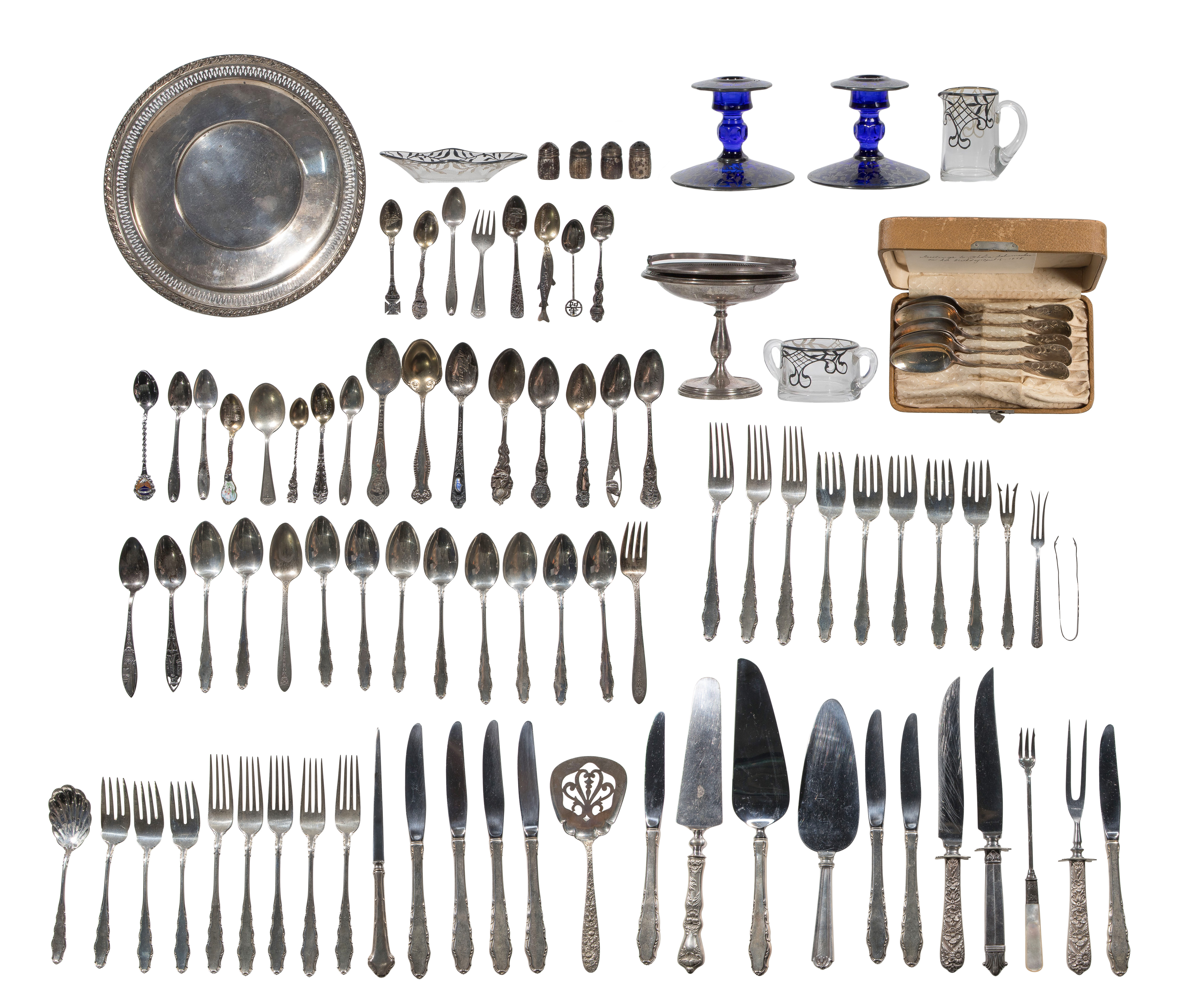 Including a set of Reed & Barton English Provincial flatware having (8) 9-inch dinner knives, (8) 7 5/8-inch dinner forks, (8) 6 3/4-inch salad forks, (10) 6-inch teaspoons, (2) serving utensils as well as a set of (6) teaspoons in a fitted box, a compote, a tray, a handled basket, (2) sets of salt and pepper shakers, an assortment of spoons, forks and serving utensils, sterling handled including knives, forks, pie server and letter opener; together with silver over glass including a pair of blue glass candle holders, a set of creamer, sugar and oval bowl