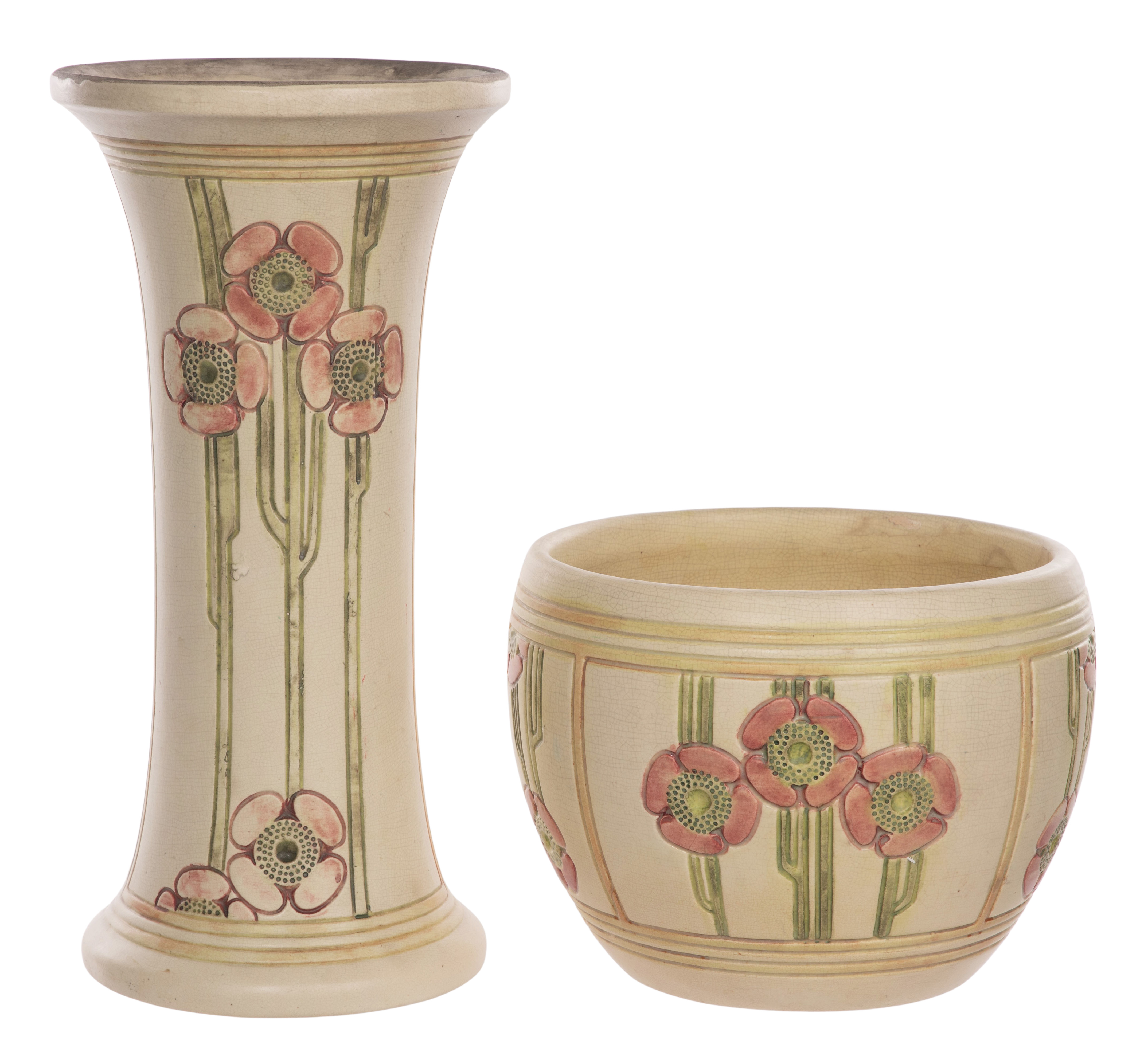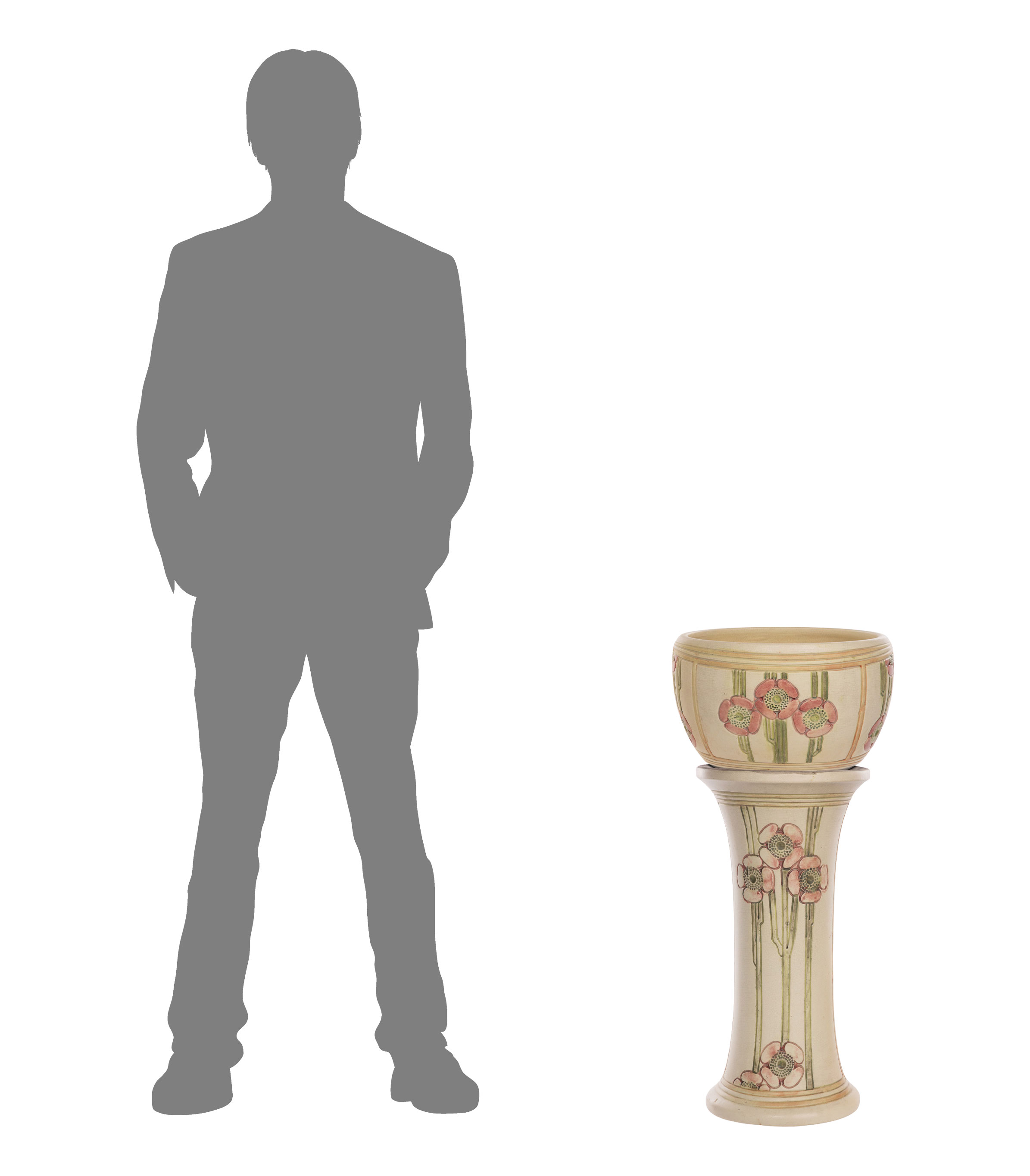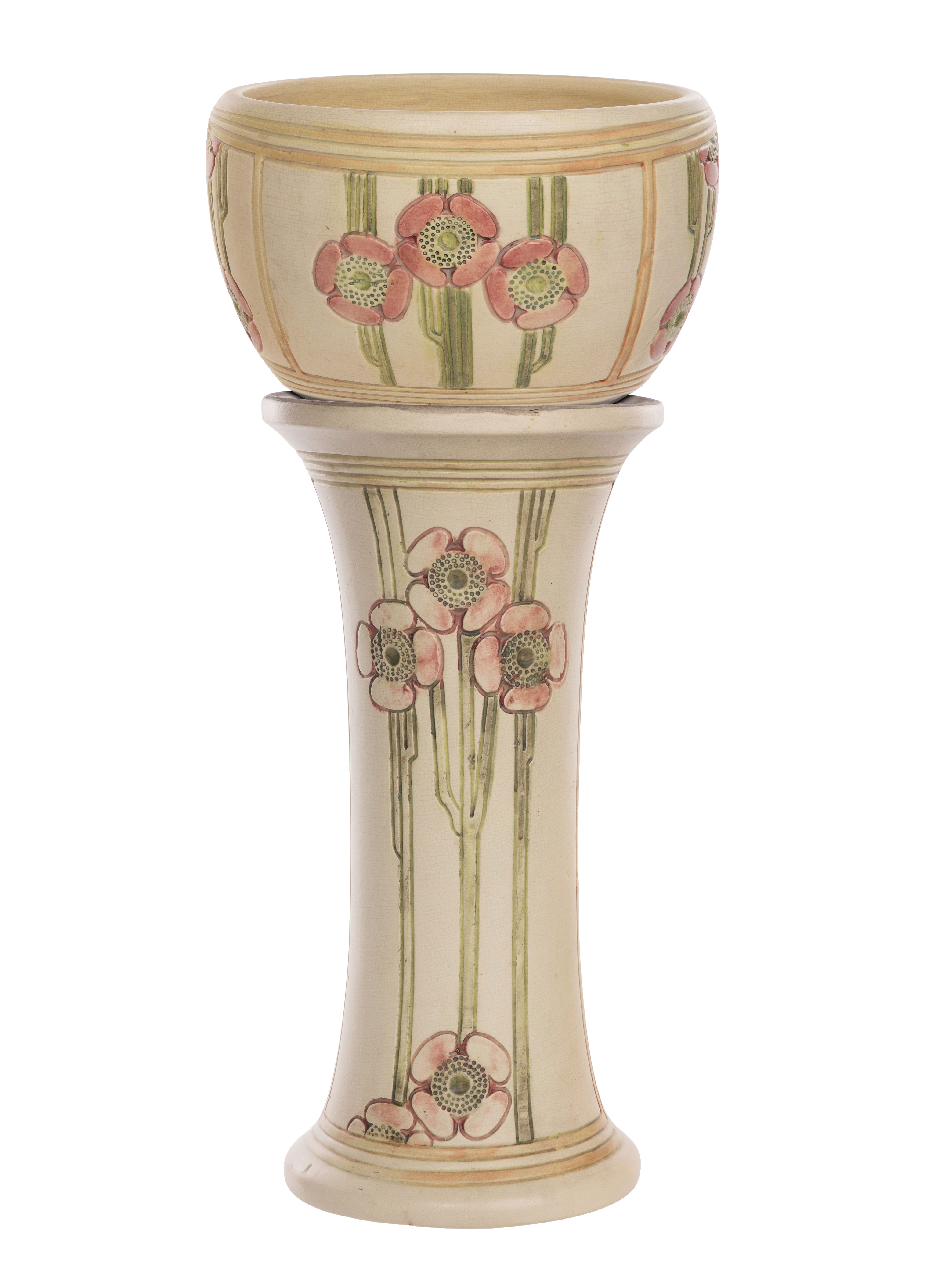 c.1925, designed by Rudolph Lorber (1873-1952) in the Flemish motif, a cream-colored pedestal and jardiniere having incised, stylized pink flowers on long green stems, unmarked
