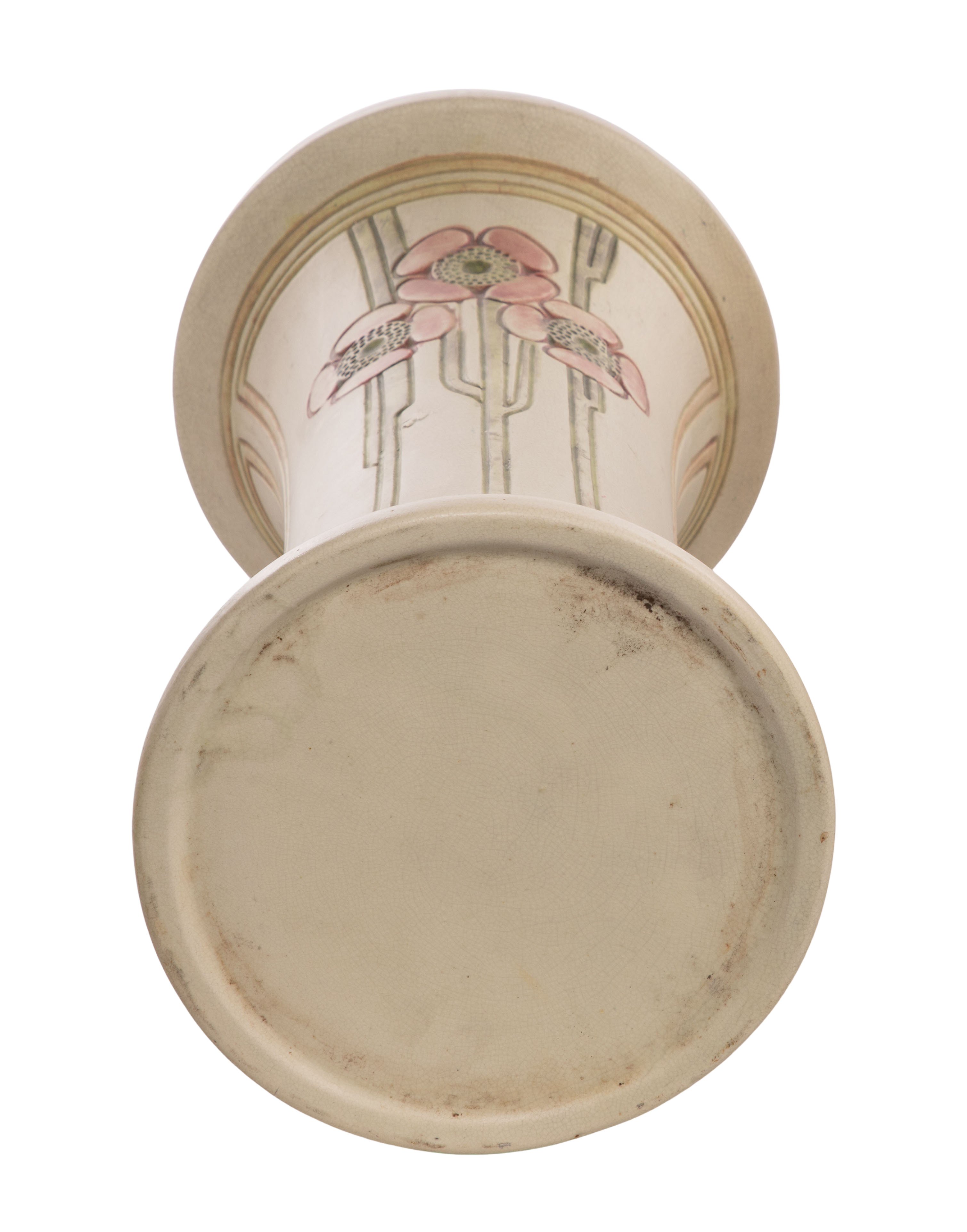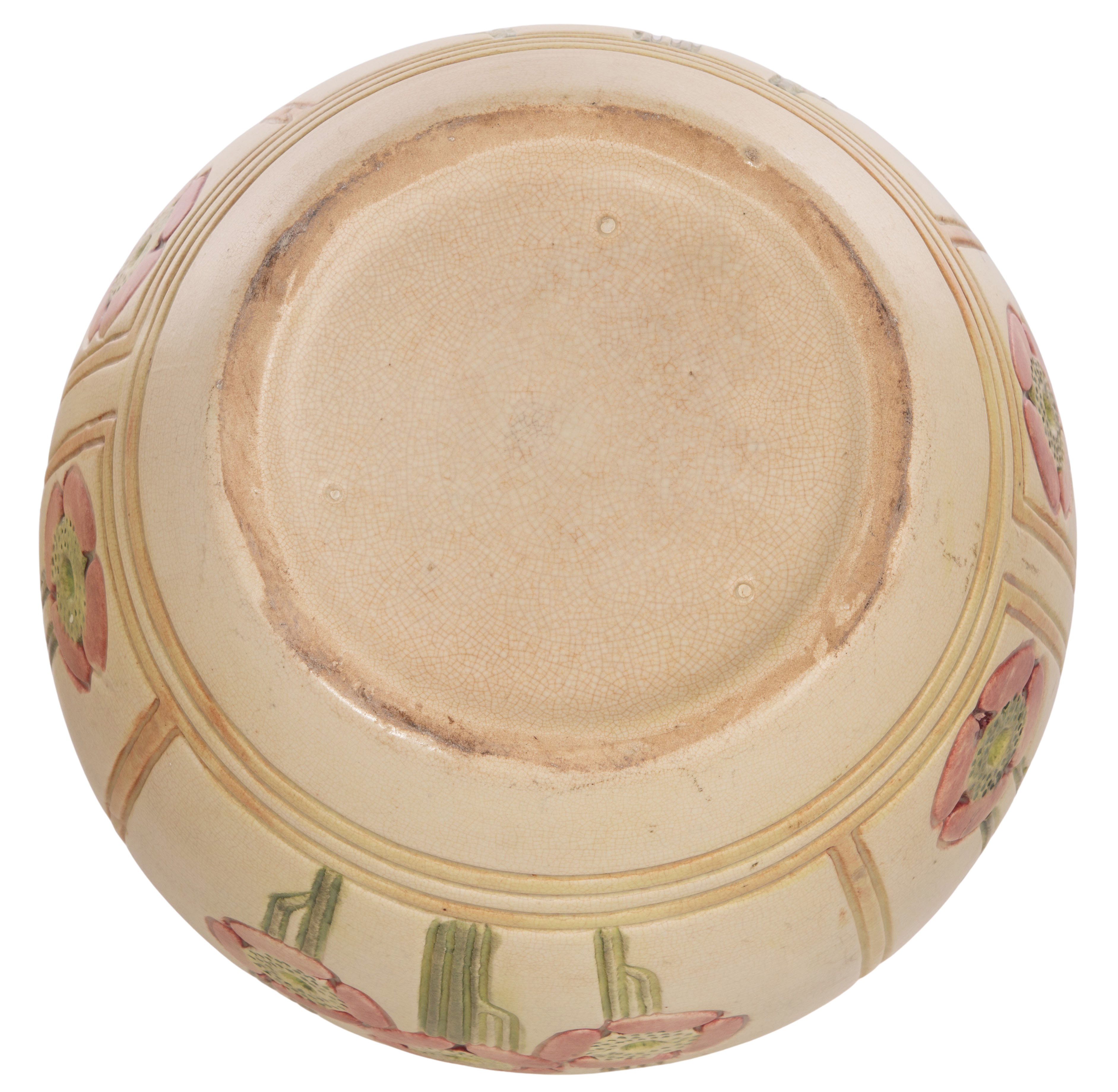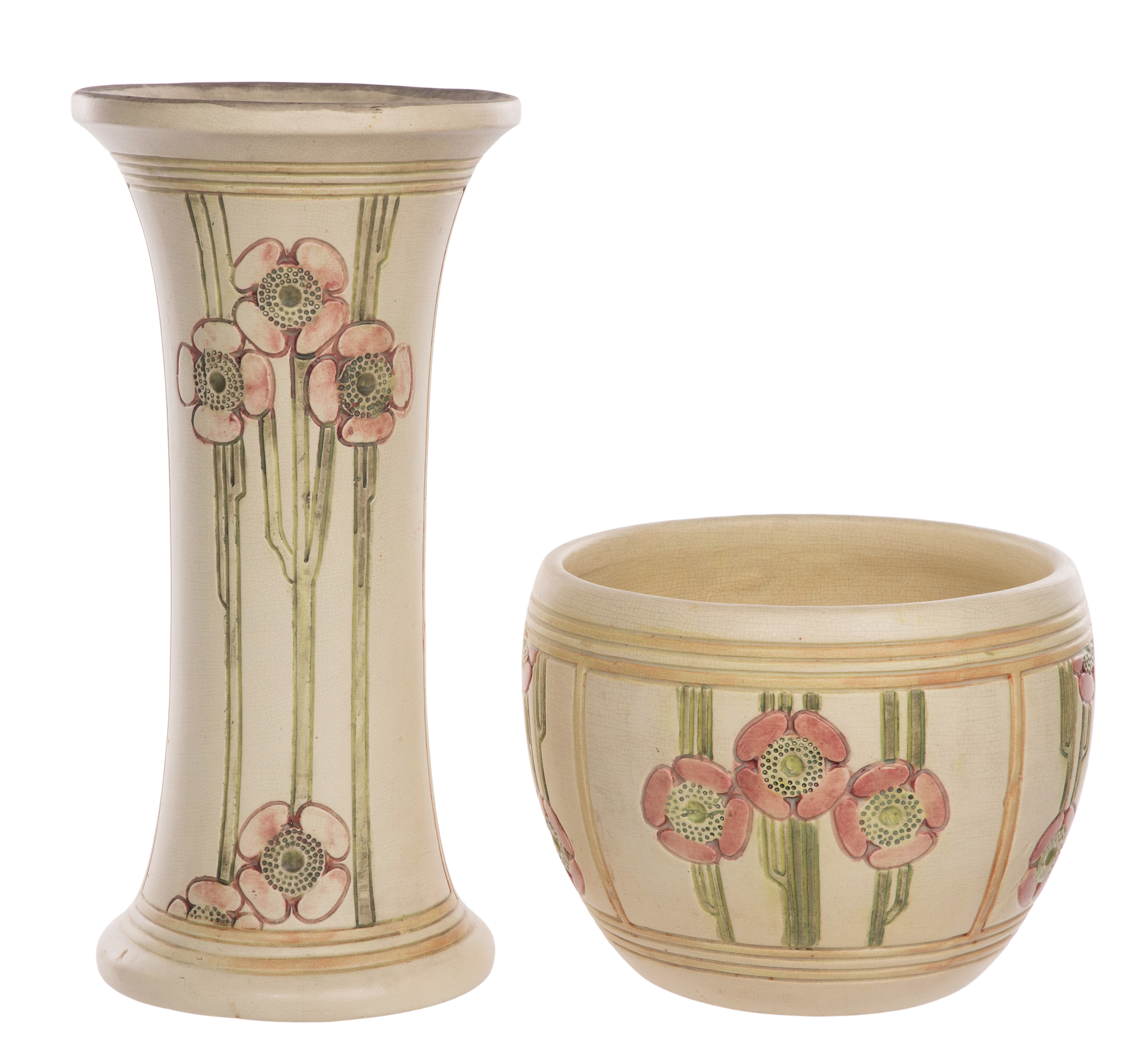 c.1925, designed by Rudolph Lorber (1873-1952) in the Flemish motif, a cream-colored pedestal and jardiniere having incised, stylized pink flowers on long green stems, unmarked