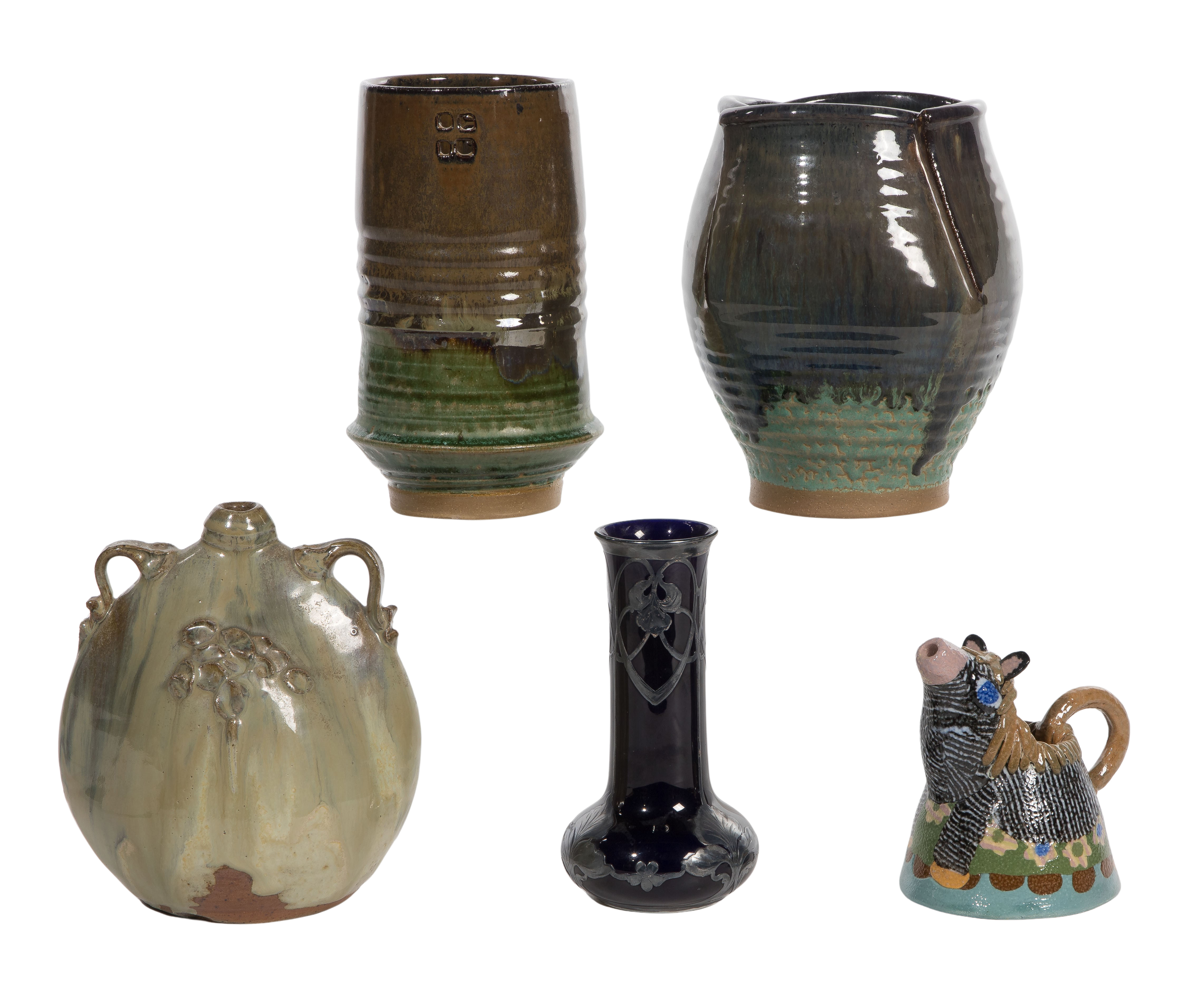 (5) items including a Jane Peiser (American, 1933-2022) hand formed creamer, signed to underside, as well as (3) illegibly hand thrown vases and a cobalt vase having silver overlay