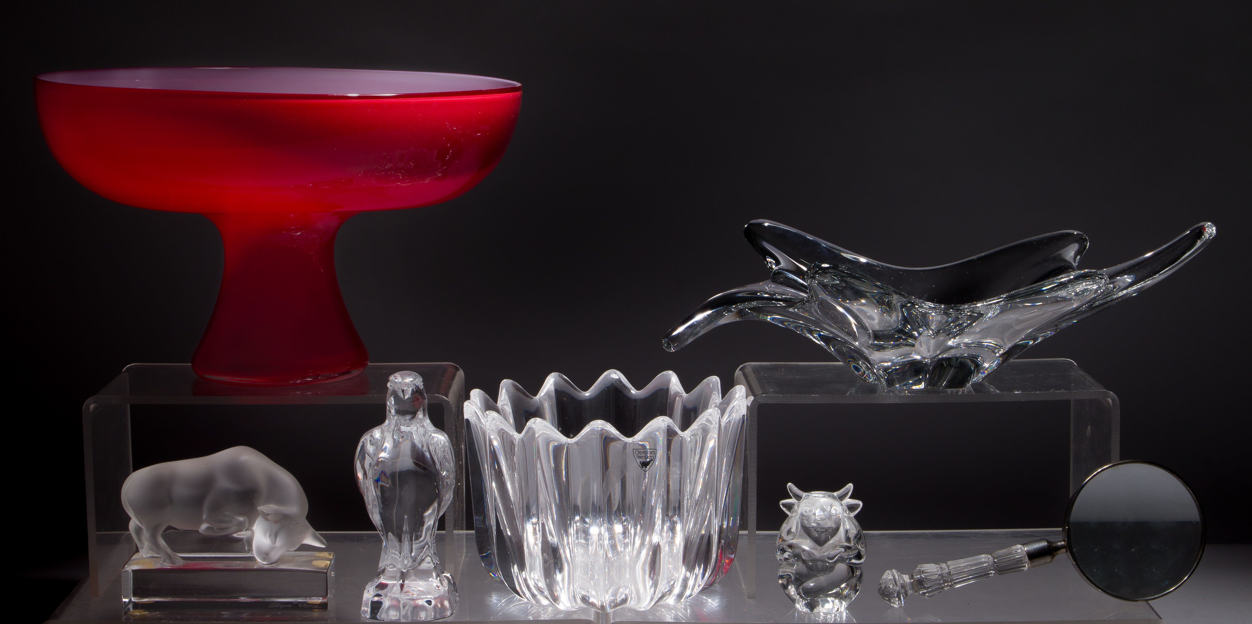 (7) total items including a lobed Baccarat candy bowl, an Orrefors fluted bowl having a sawtooth rim, a Lalique bull, a Steuben bull, a Daum bird and a Waterford crystal handled magnifying glass, all marked; together with an unmarked red and white cased art glass centerpiece bowl
