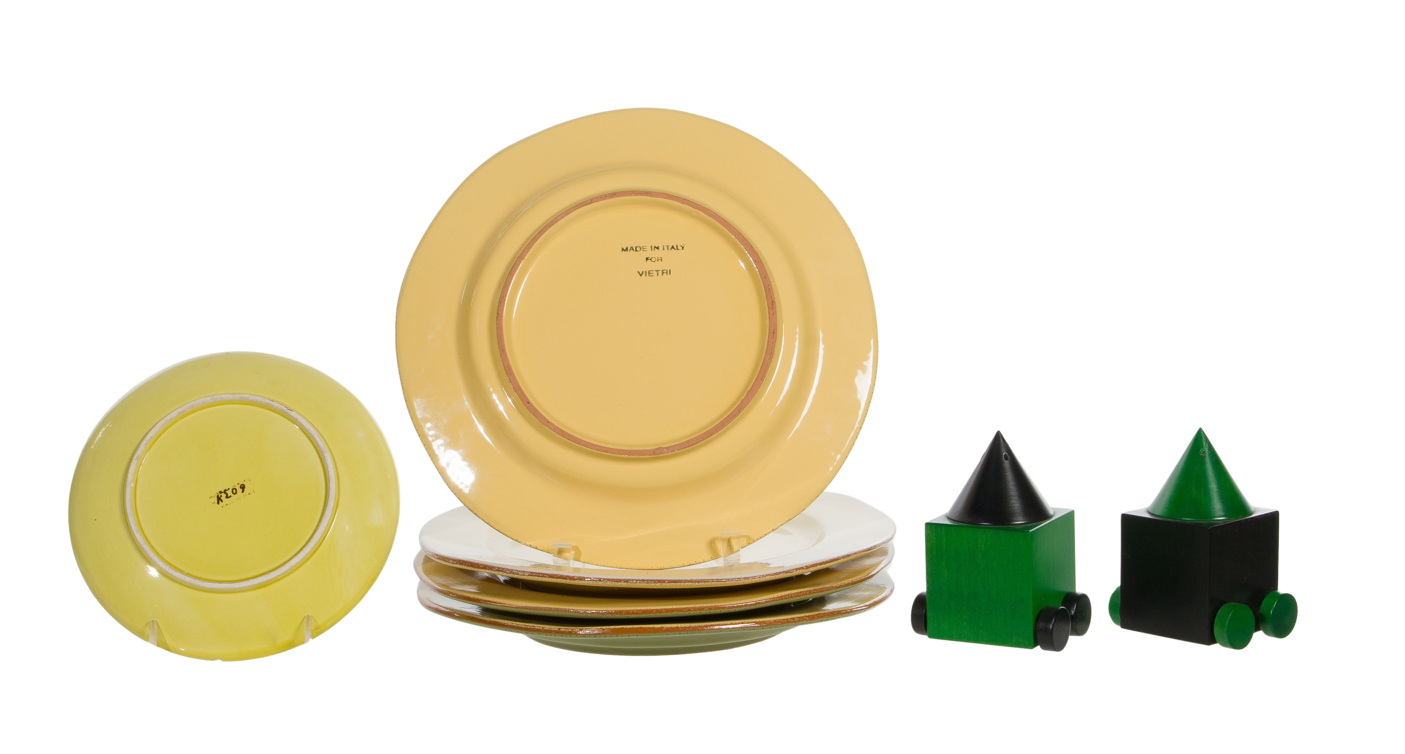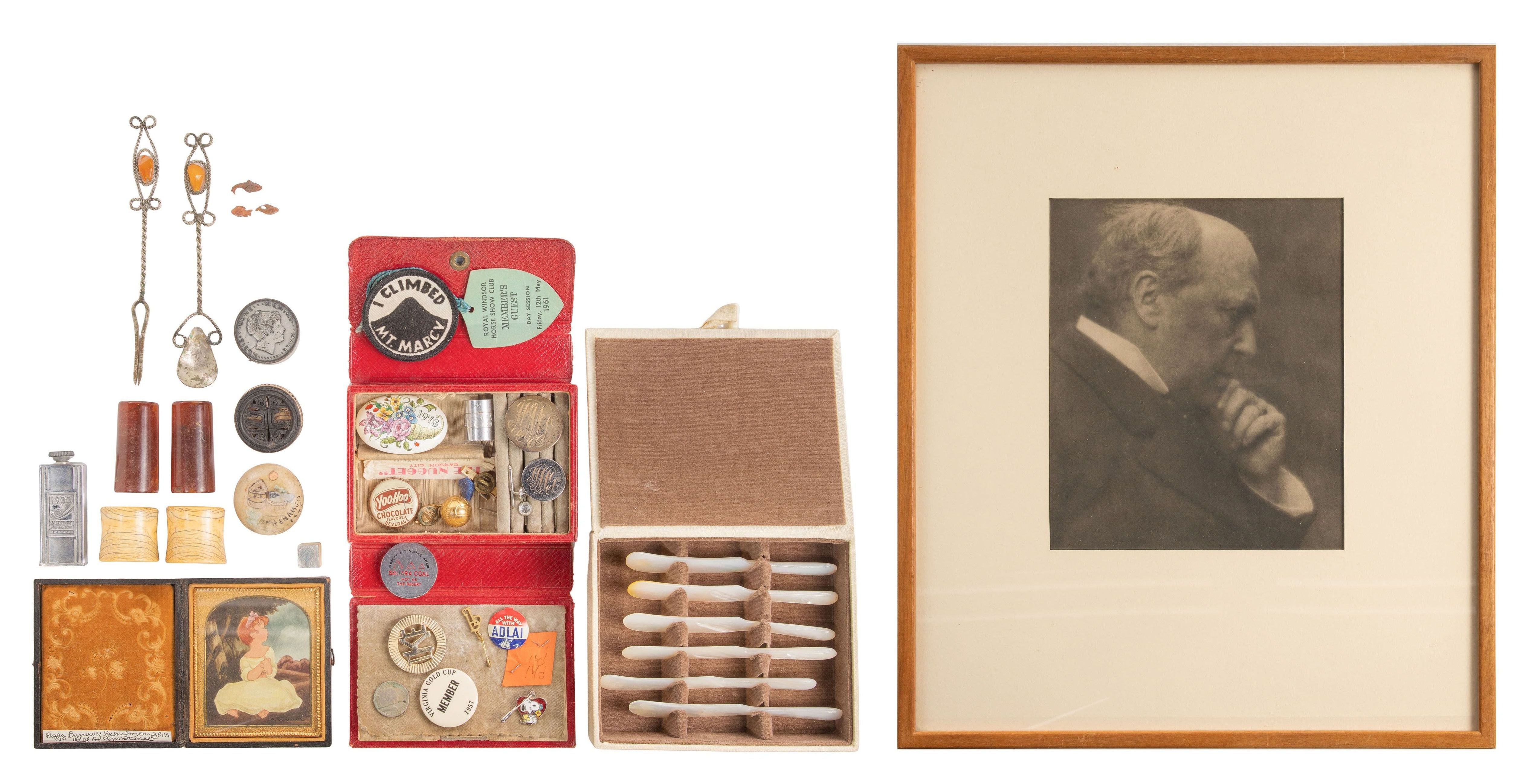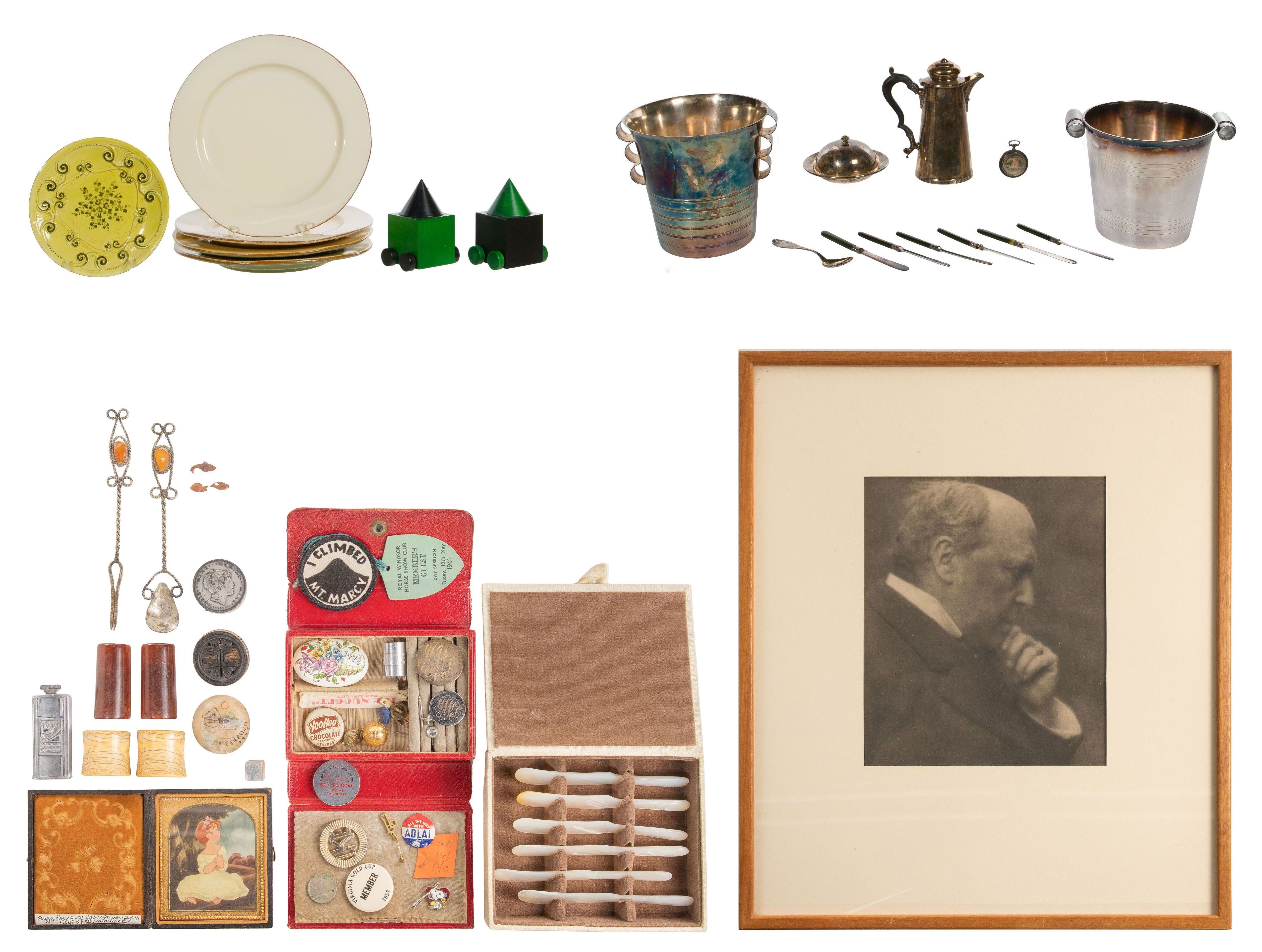 Including a set of (4) plates stamped ‘Vietri’ on underside, a hand painted yellow plate, a pair of salt and pepper shakers stamped ‘Legnomangia’ on underside, (2) champagne buckets, a coffee pot, a covered butter dish, a 6-piece set of hors d’ oeuvres knives, a sugar spoon, a pocket watch case, a set of (6) boxed mother-of-pearl caviar knives, a painting by Peggy Burrows ‘Age of Innocence’ in a travel case, a portrait of Henry James as well as other items including pins, tape measures and flask
