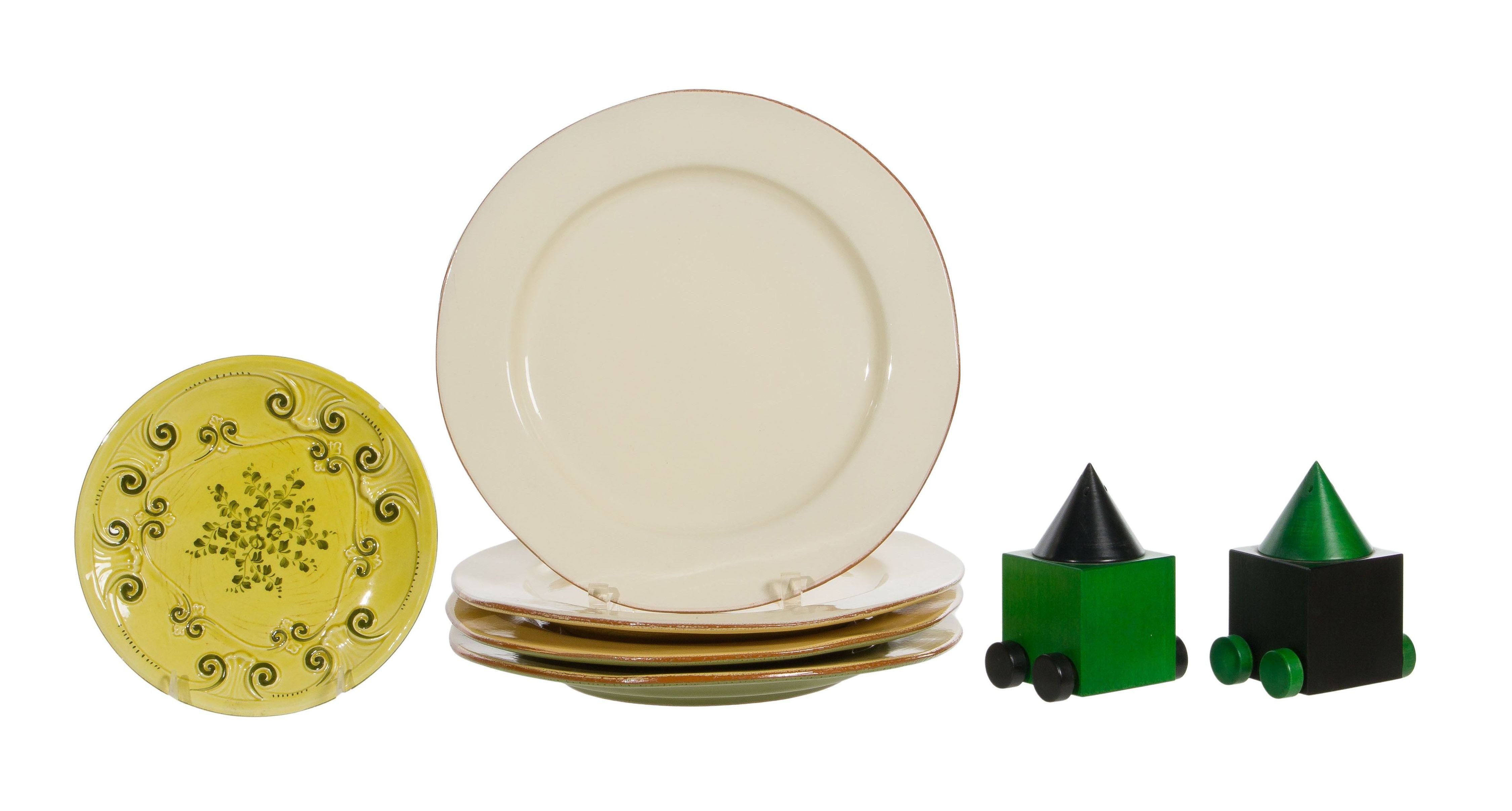 Condition: overall light wear consistent with normal use, yellow plate having a chip on edge and crazing, silverplate having tarnish, object assortment having nicks, chips, scratches, broken pieces, minor dirt accumulation