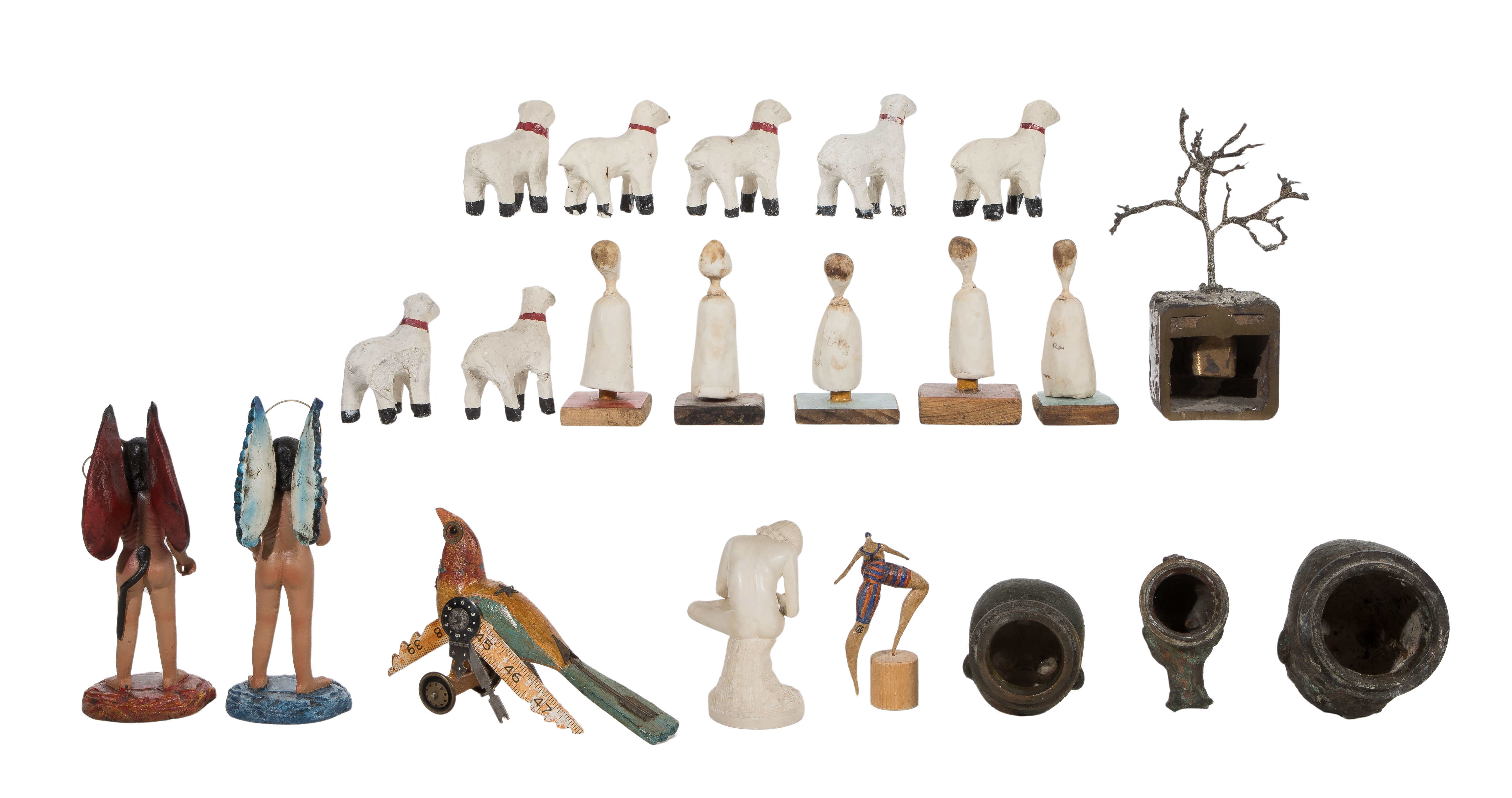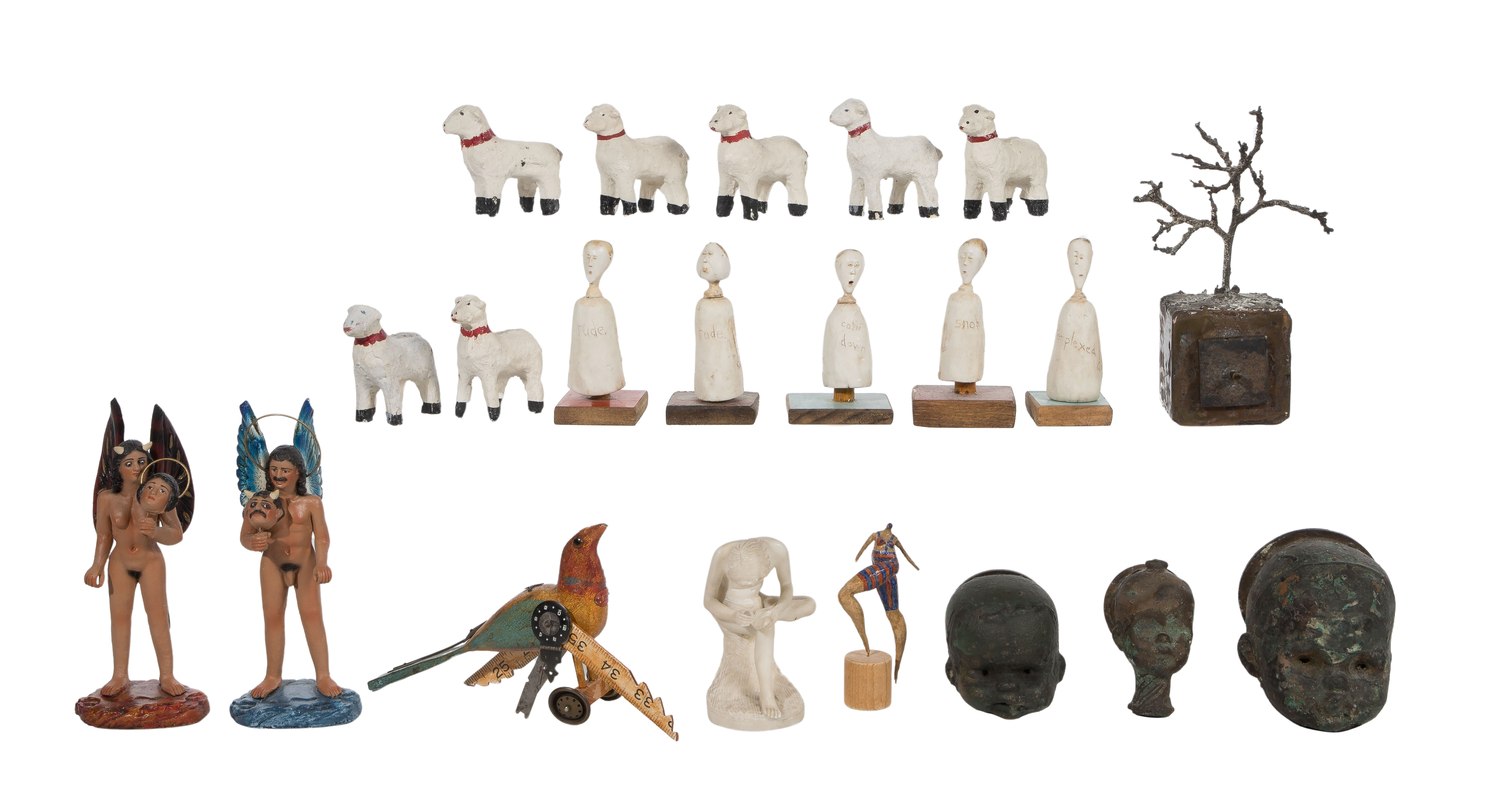 (21) items including (5) ceramic finger puppets signed ‘Rose’, (7) ceramic Sheep, (2) nefarious naked figures holding an angel and devil head signed ‘Goche’, (3) brass and copper doll head molds, a steampunk bird signed ‘Jim and Tori Mullan’ as well as a wood figure, tree sculpture and a marble statue