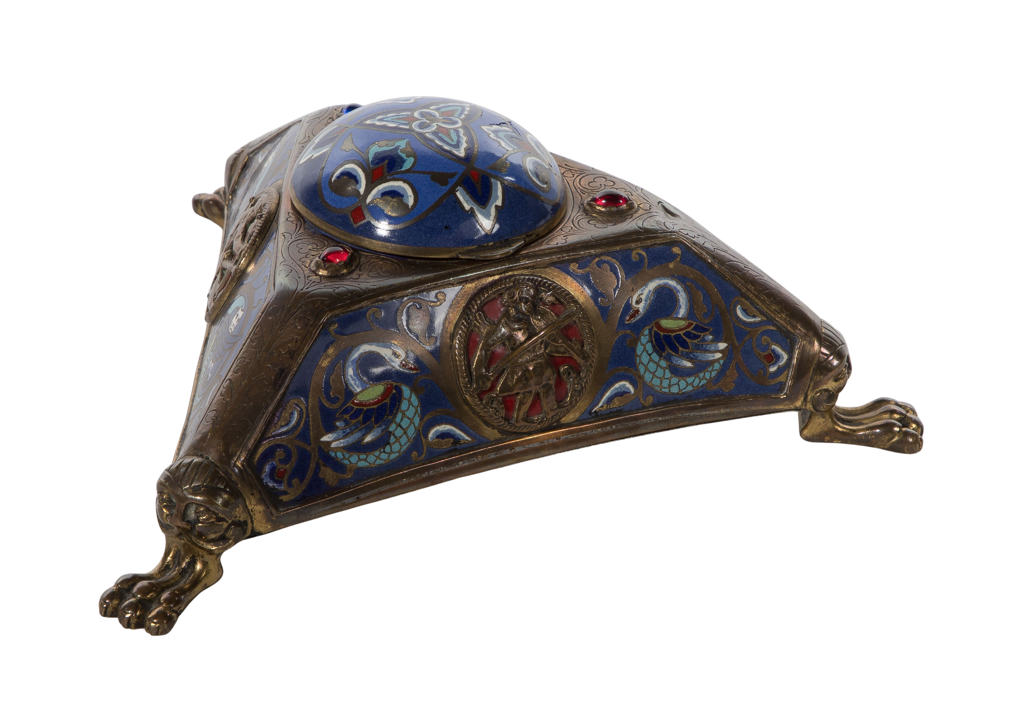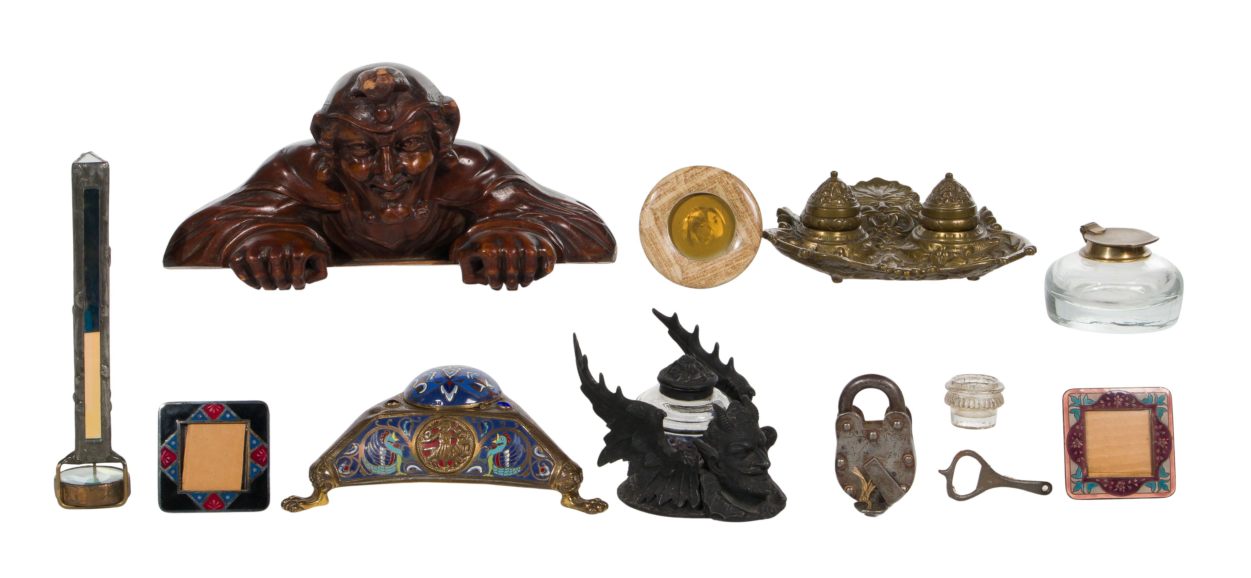 (12) total items including a gilded bronze and champleve enamel, tripod form claw foot ink stand having inset oval cabochon stones having raised figural medallion, marked inside cover ‘E. F. Caldwell & Co. Inc’; together with inkwells, a lock and key, picture frames and a prism