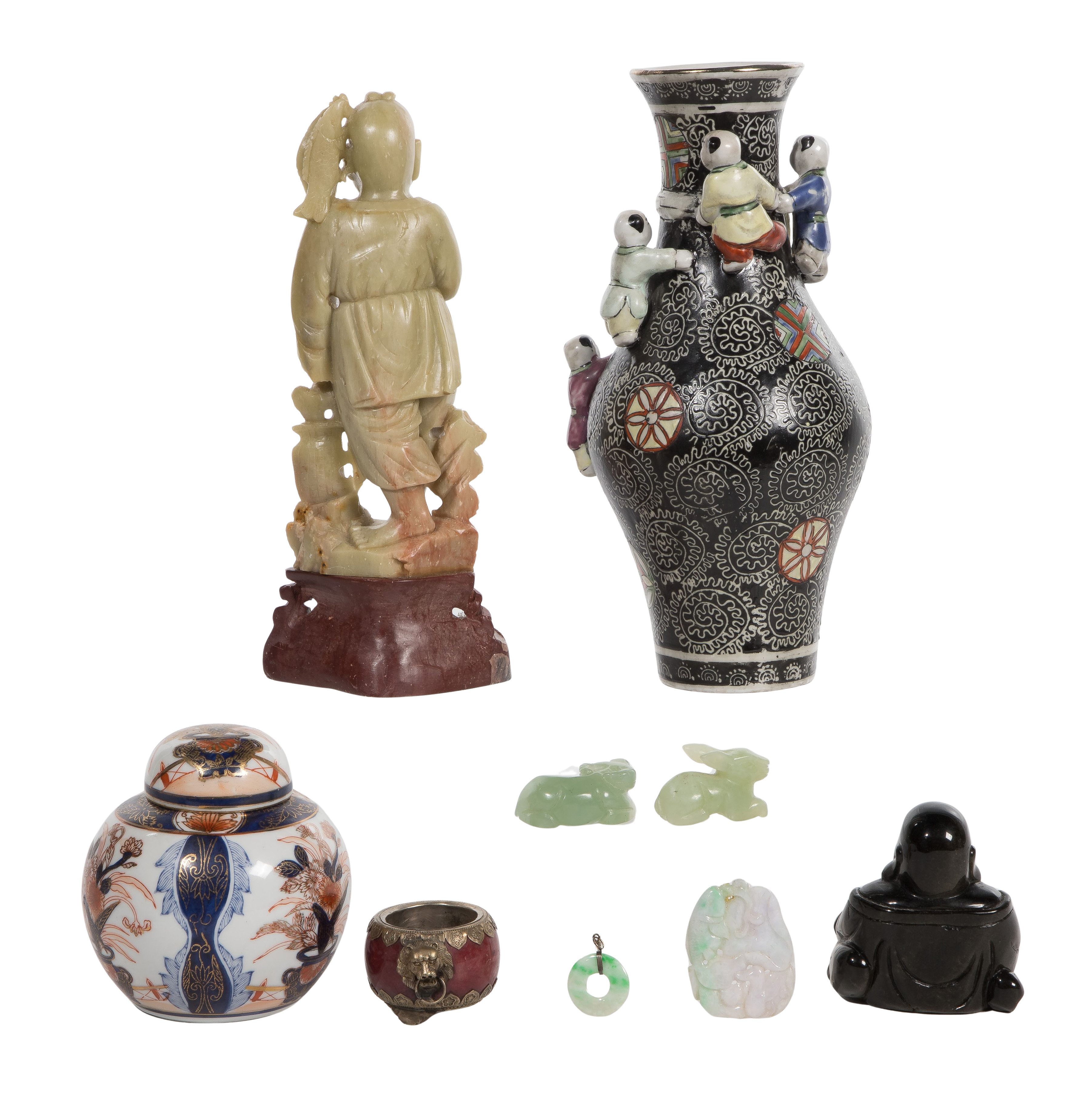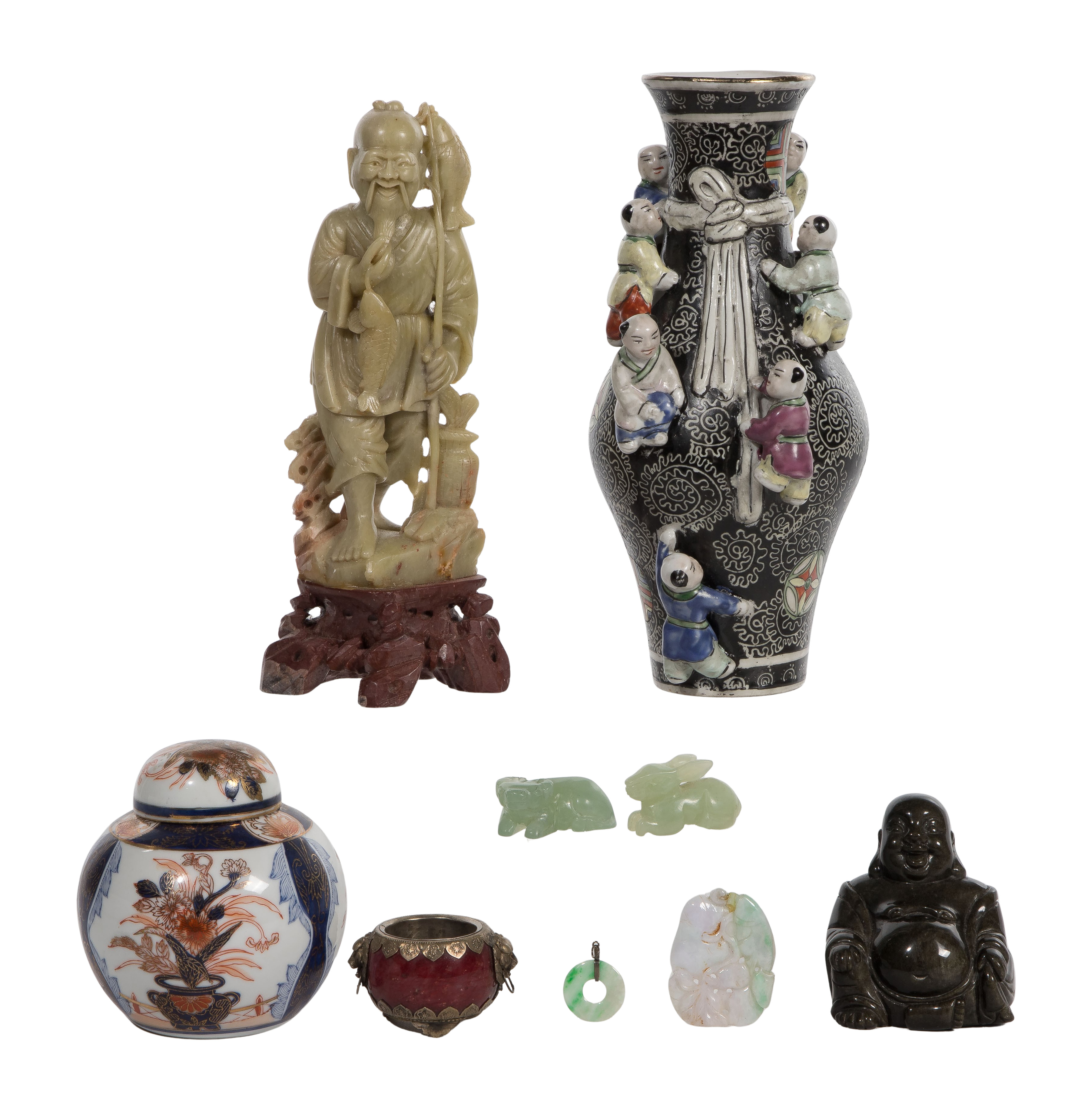 (9) items including a fertility vase, a soapstone fisherman, an Imari lidded ginger jar, a black hardstone Buddha figure as well as jadeite jade figures and a red trinket dish