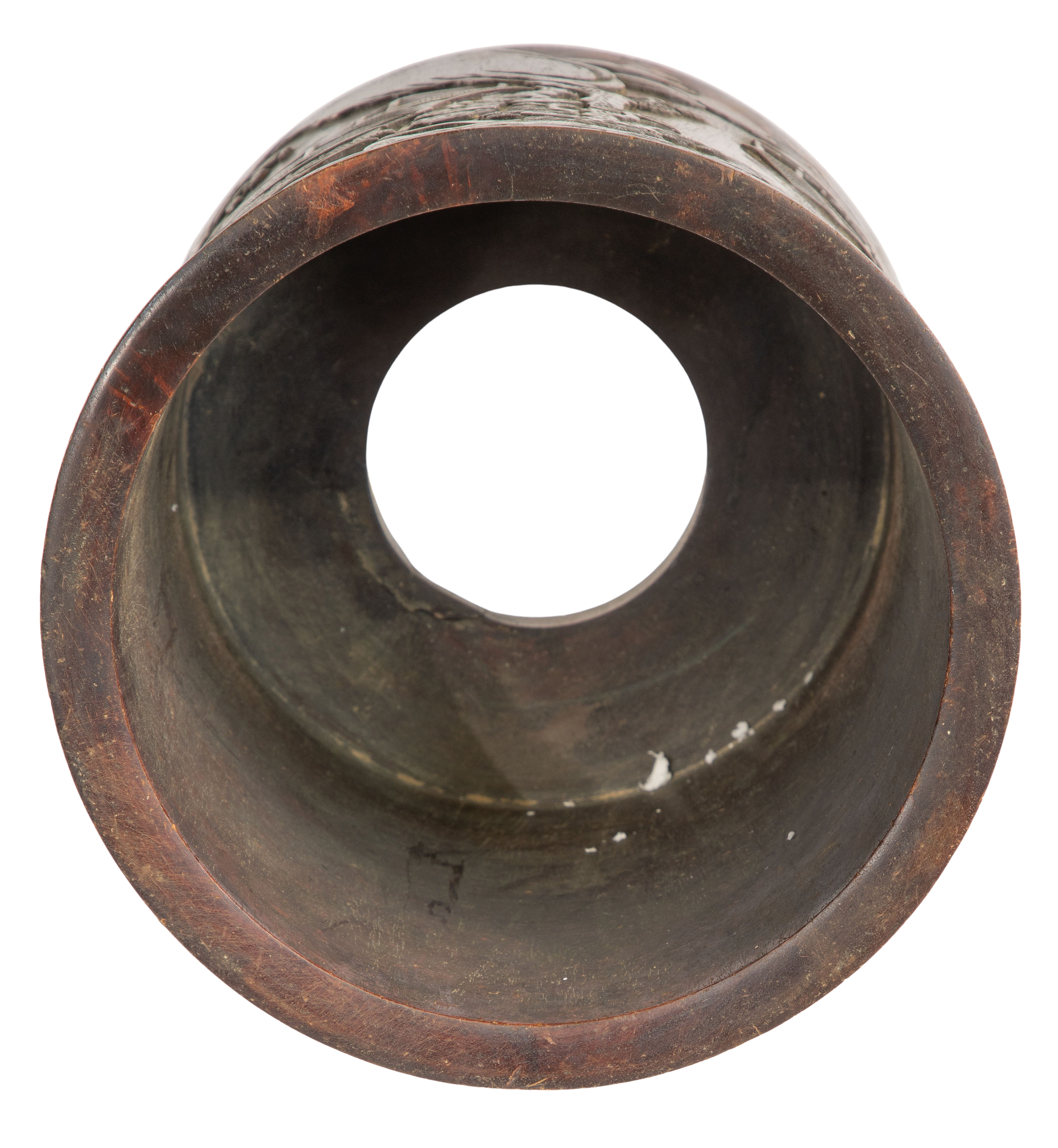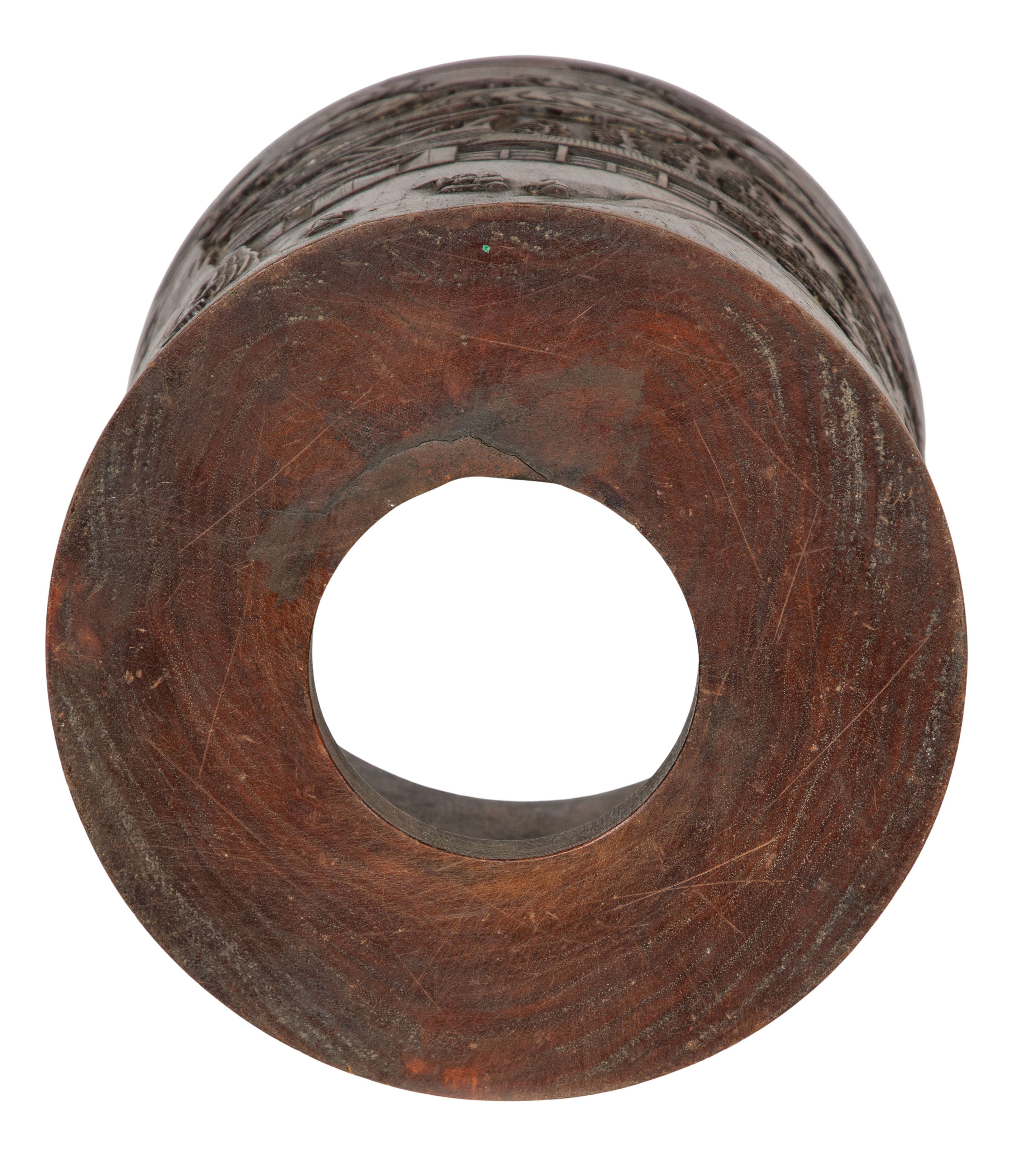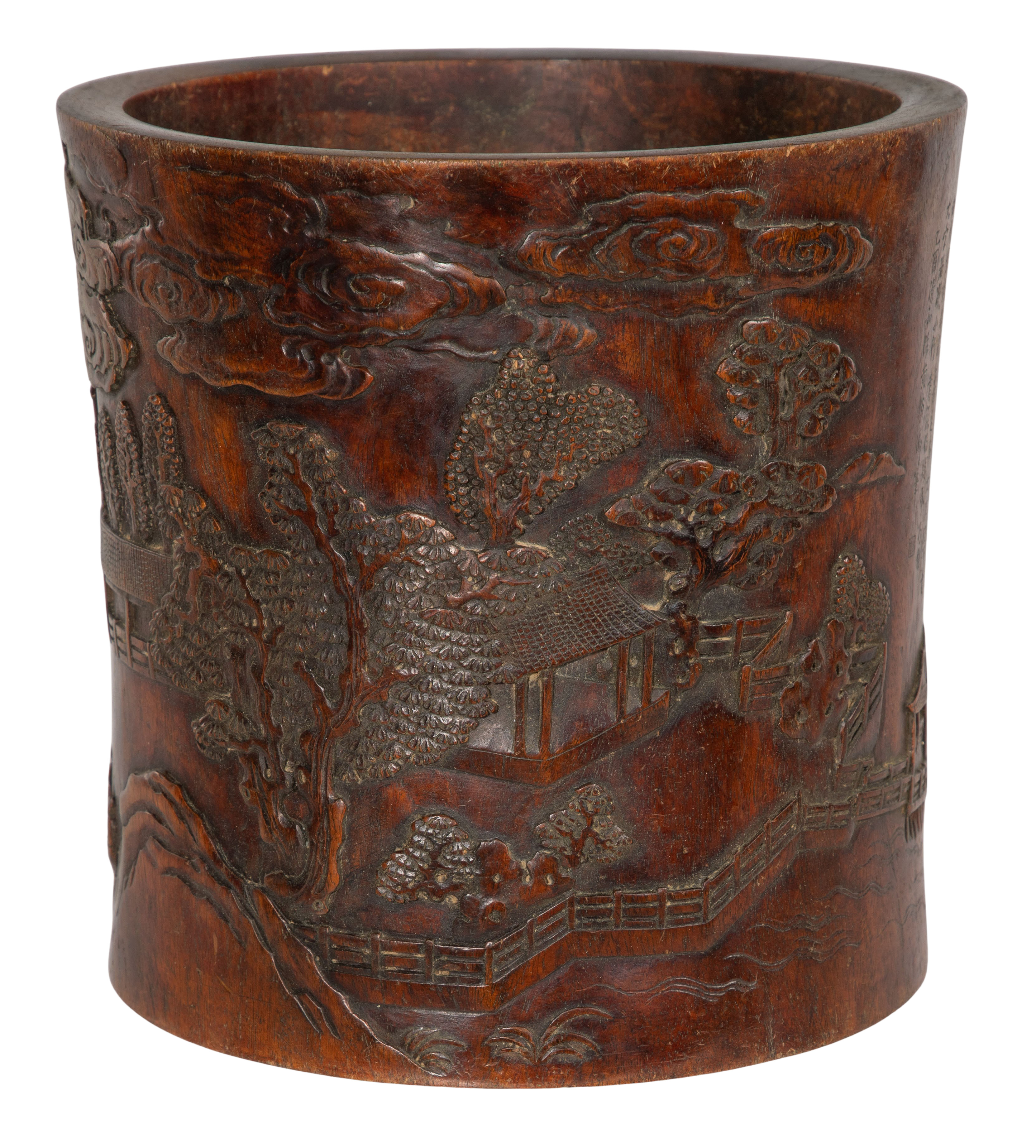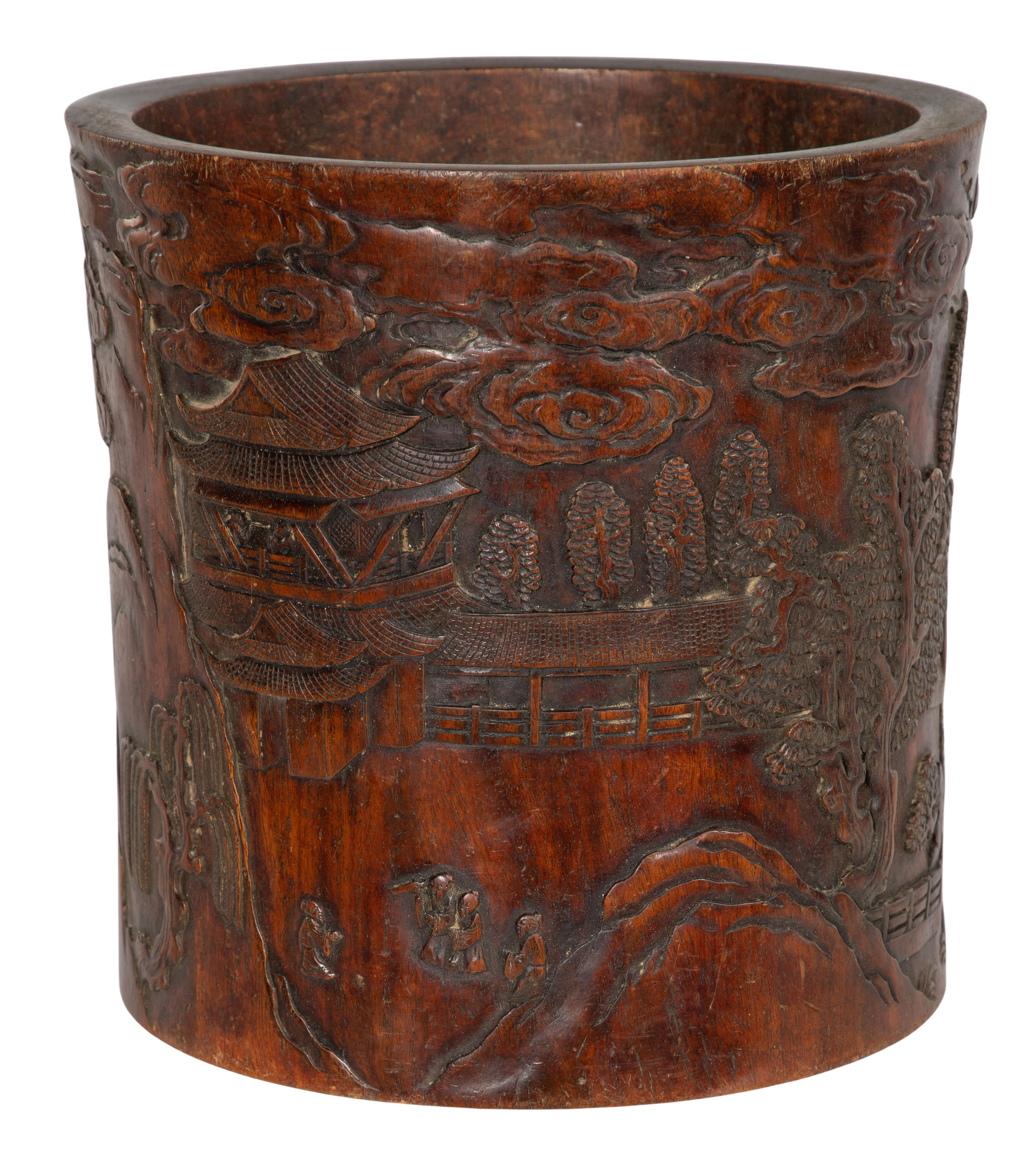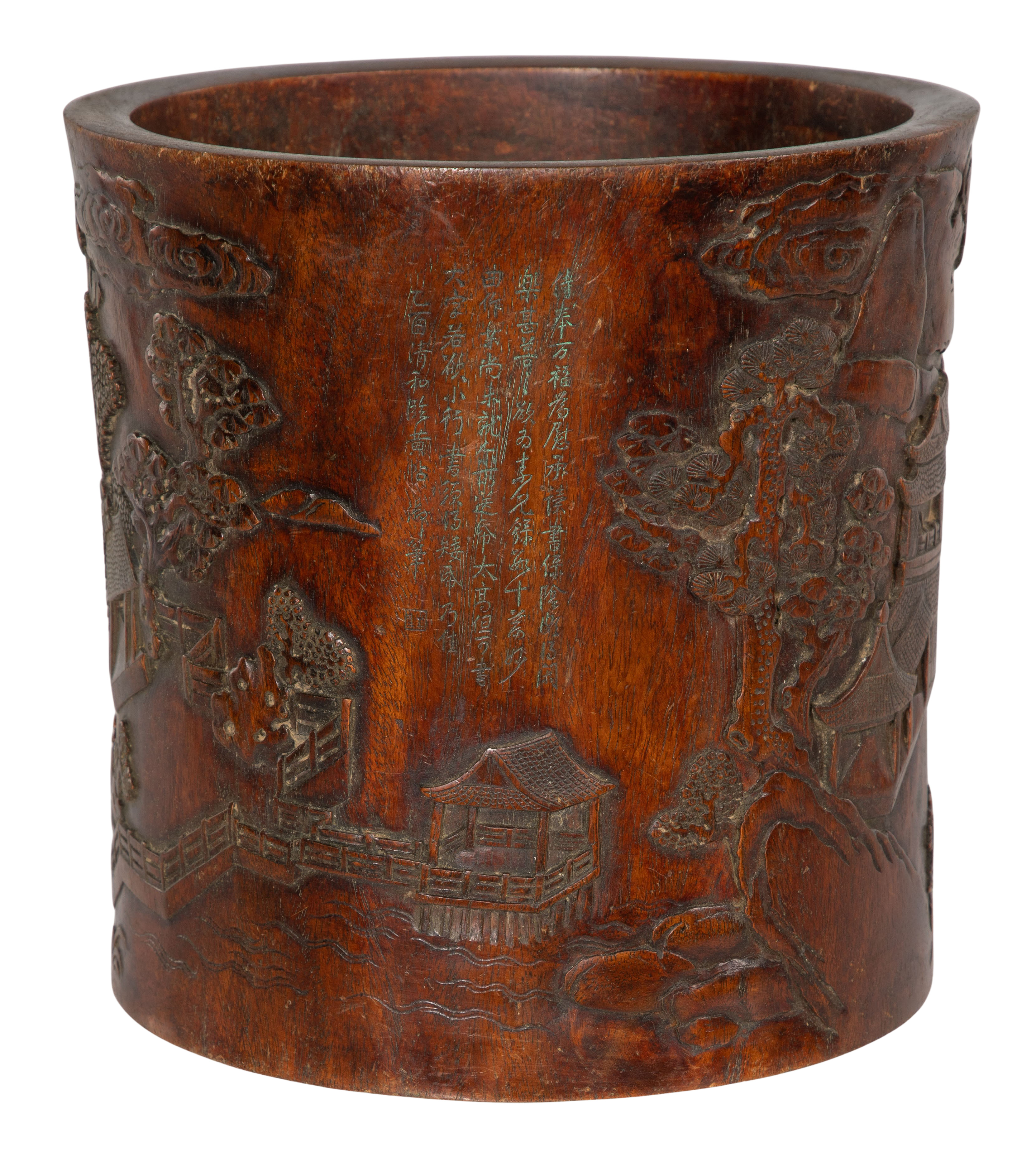 (2) items including a vajra (dorje in Tibet) Buddhist ceremonial object having remains of gilding as well as a carved hardwood brush pot depicting figures and buildings in a landscape, having a carved inscription