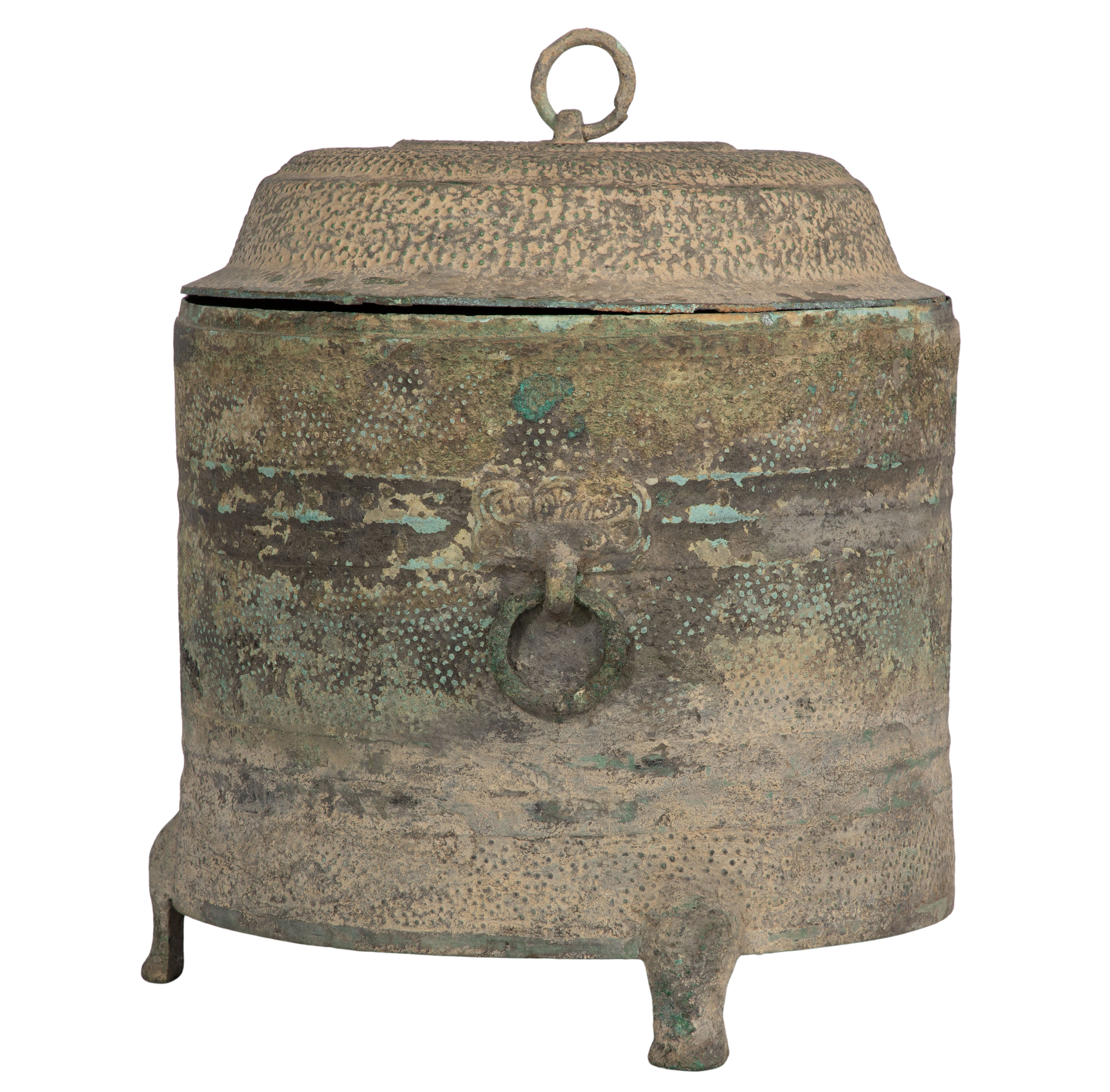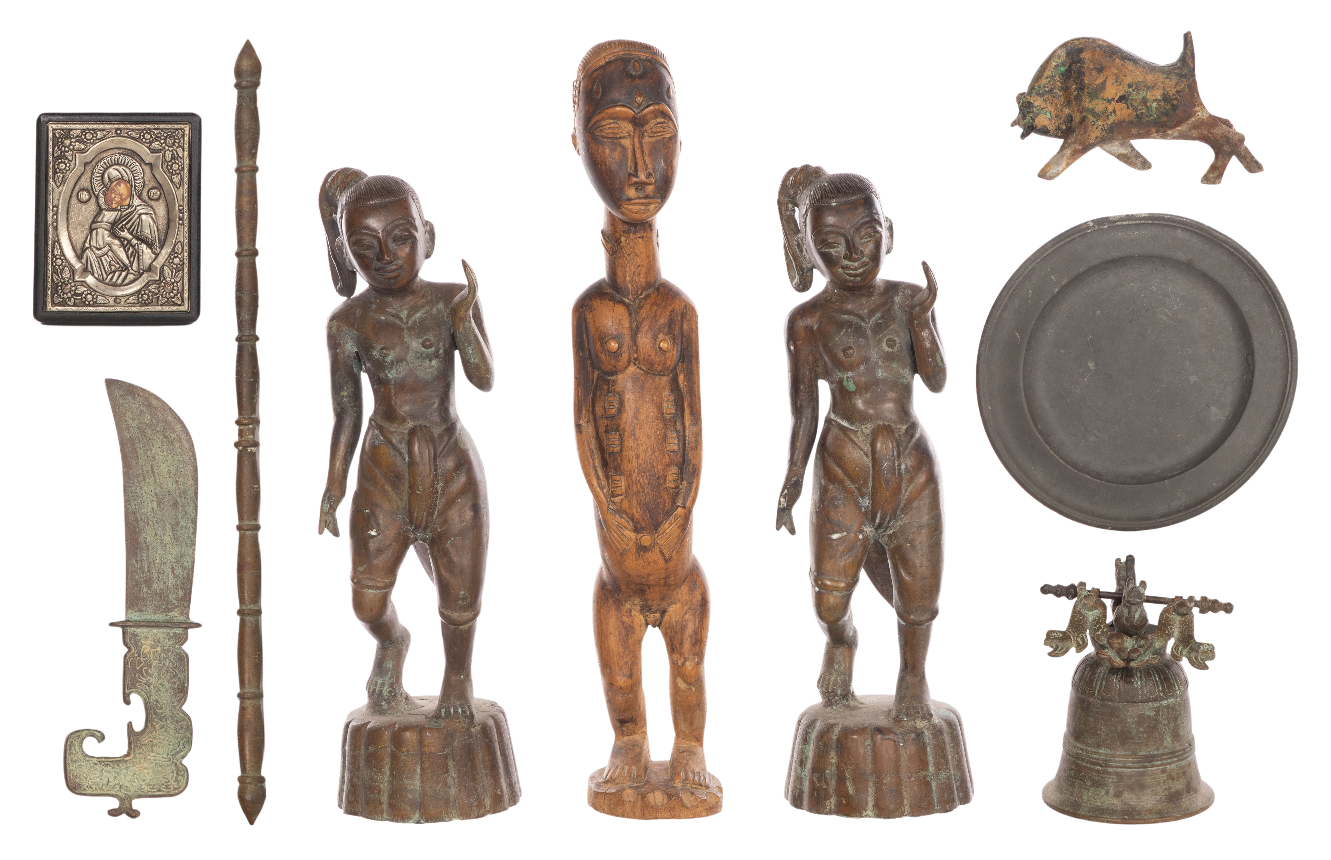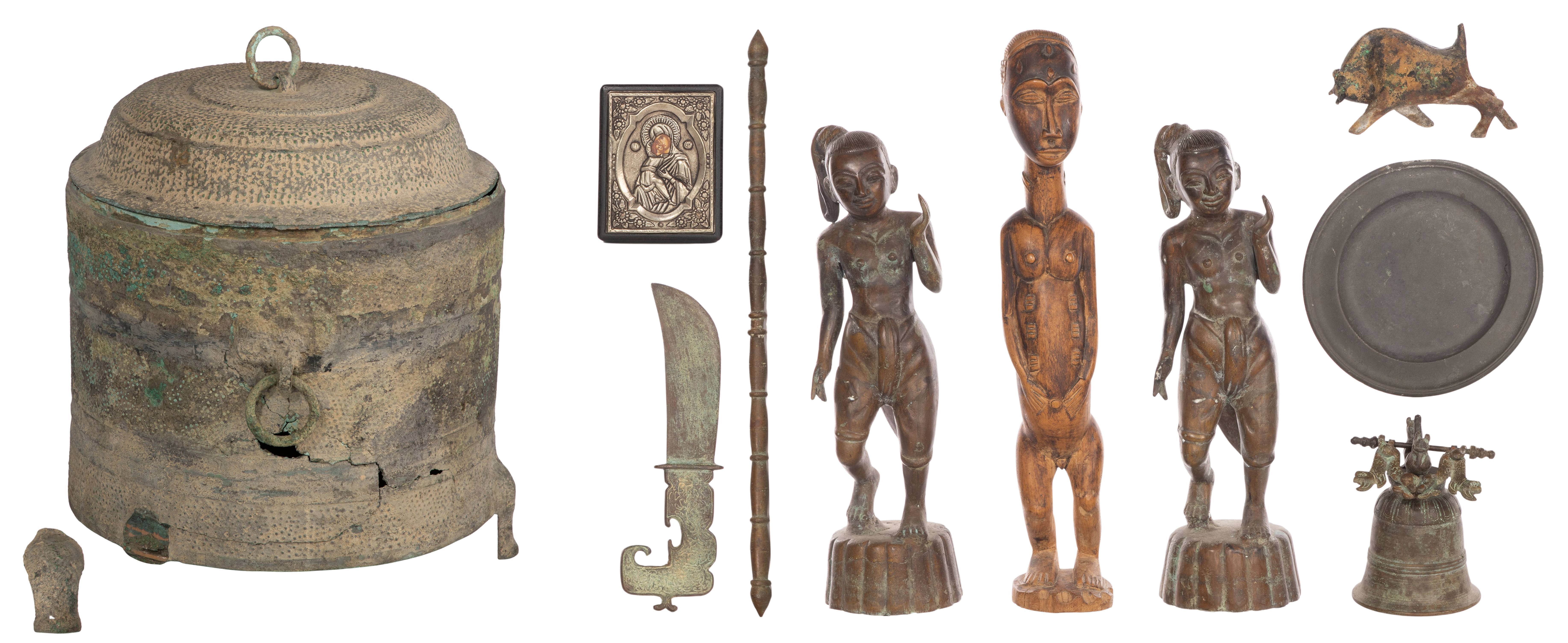 (10) items including a Han Dynasty Style Bronze Lian cylindrical tripod covered vessel having a raised pebble texture exterior surface throughout, loose ring handles suspended from taotie masks at sides, the lid also having a ring handle, accompanied by illustrated sales documents from Senatus Consulto, Copenhagen, Denmark as well as (2) figures, a bull, a knife, a bell, a pointed rod and a plate; together with a wood figure and religious icon
