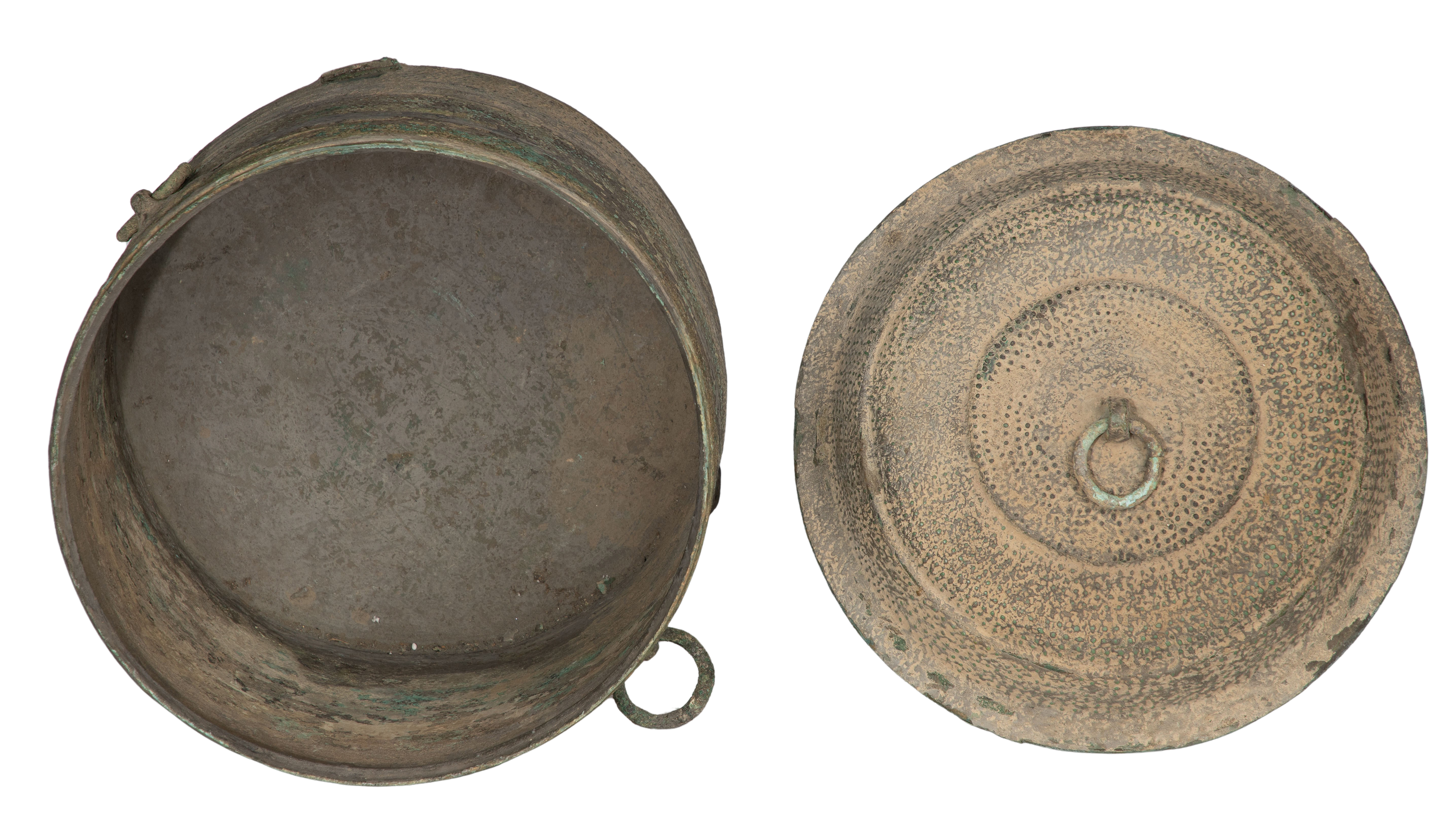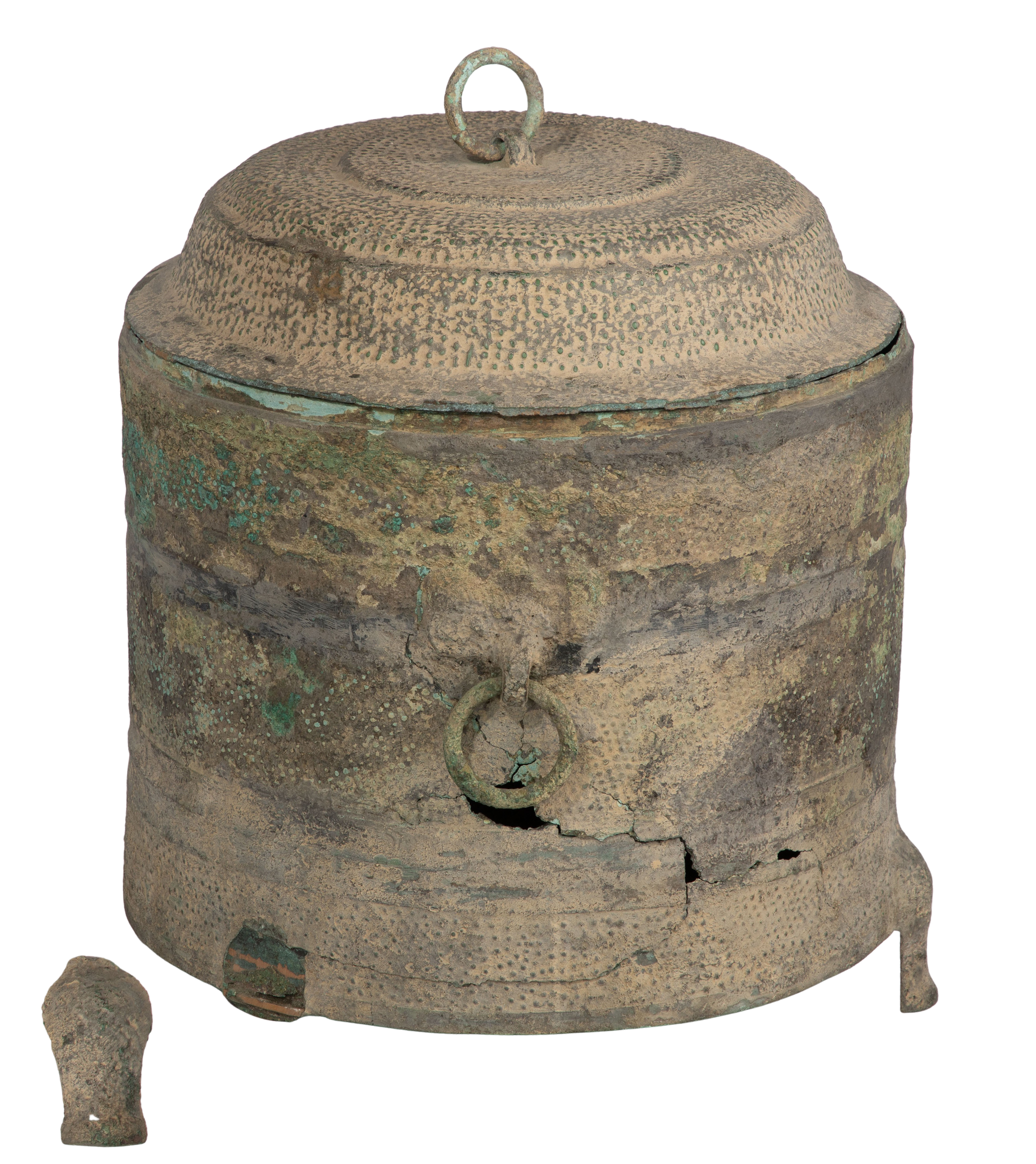 Condition: overall light to heavy wear, vessel having heavy greenish-gray patina, a leg detached revealing shiny metal within, cracks and holes to side near a handle, possible fill repair above and left of that handle, some having chips, nicks, cracks, rust, verdigris
