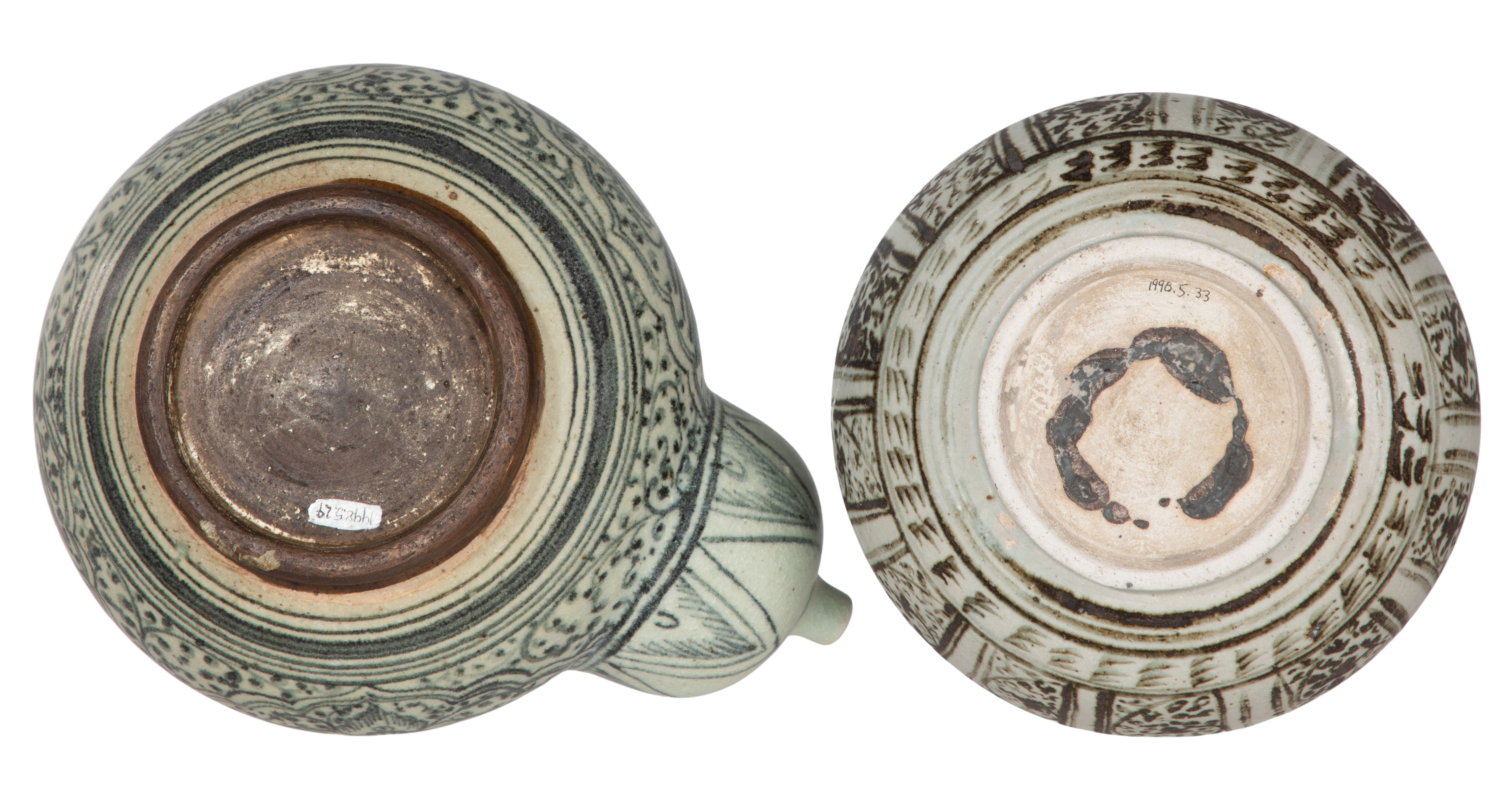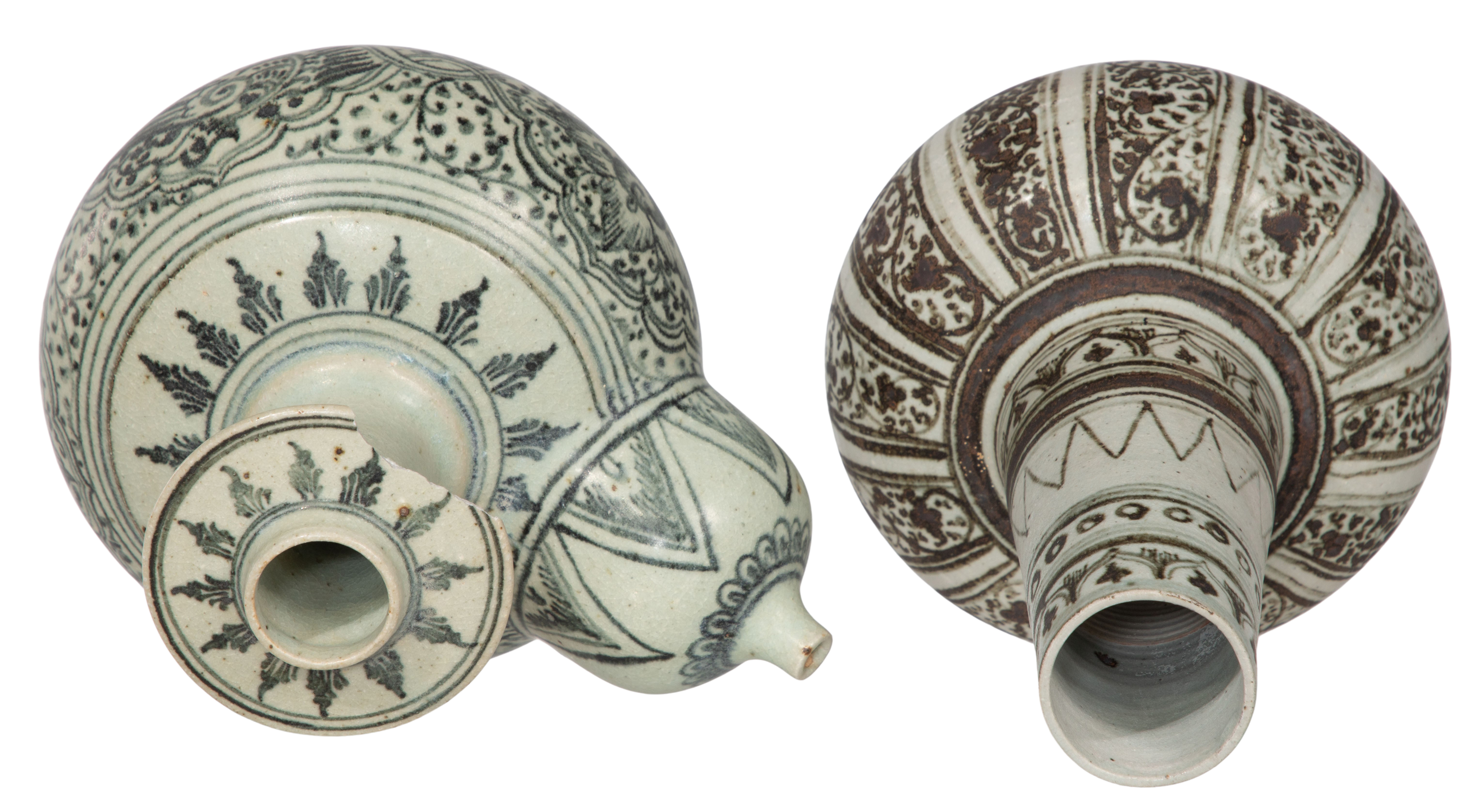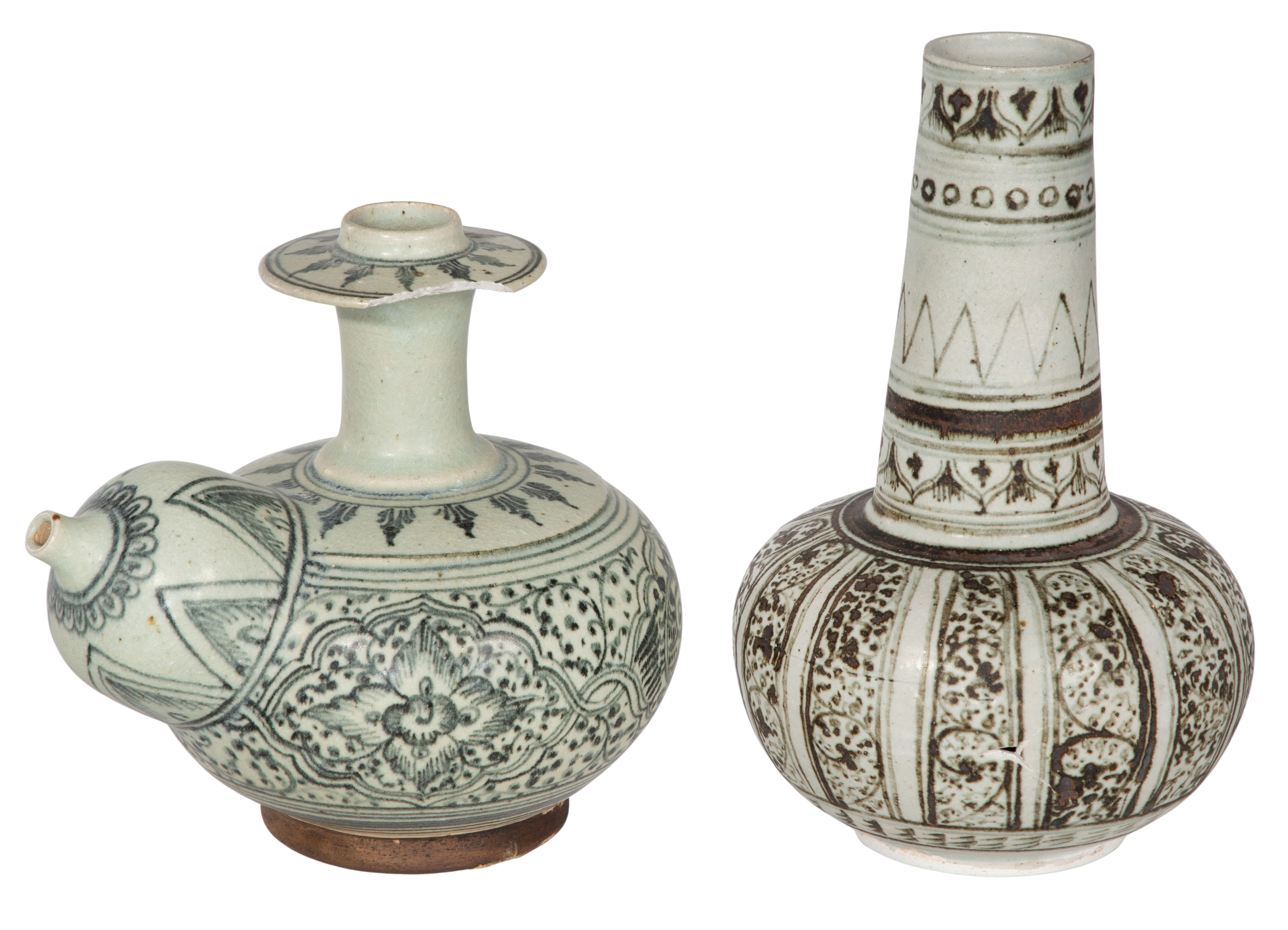 Condition: overall light to moderate wear consistent with age and normal use, minor nicks overall, top of Kendi broken, vase having hole and crack on side