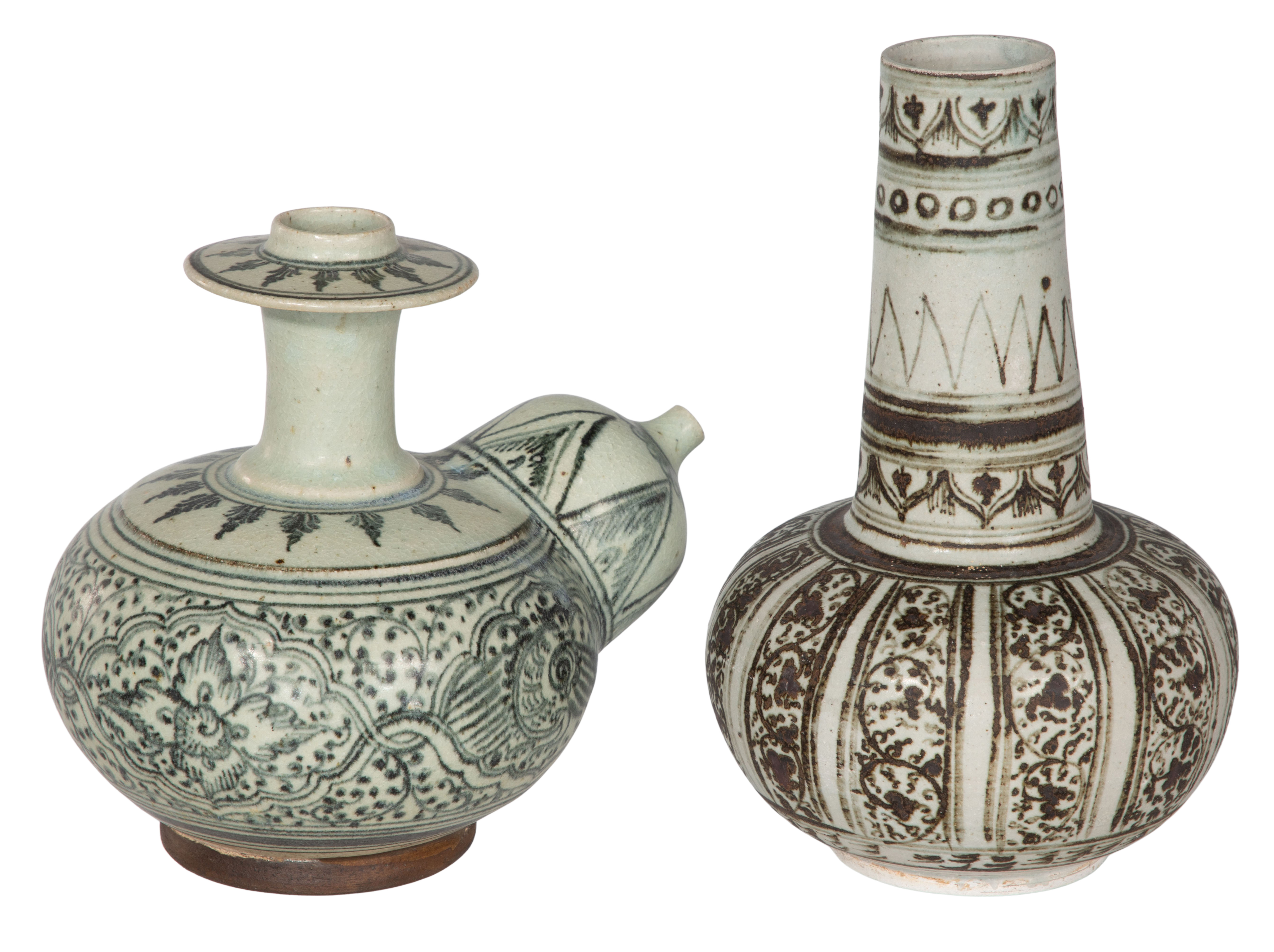(2) items including a Kendi water dropper and a pottery bulbous vase