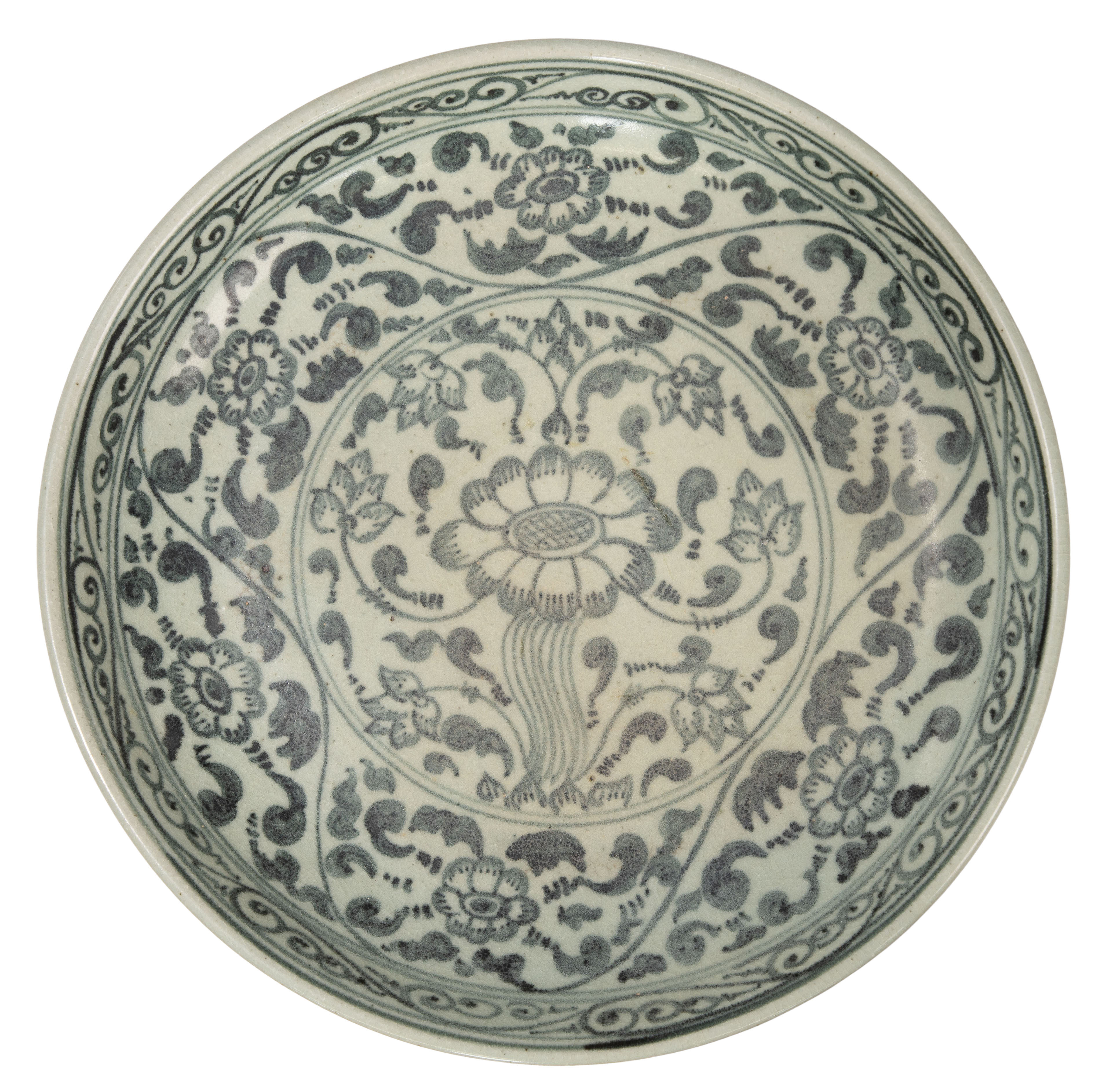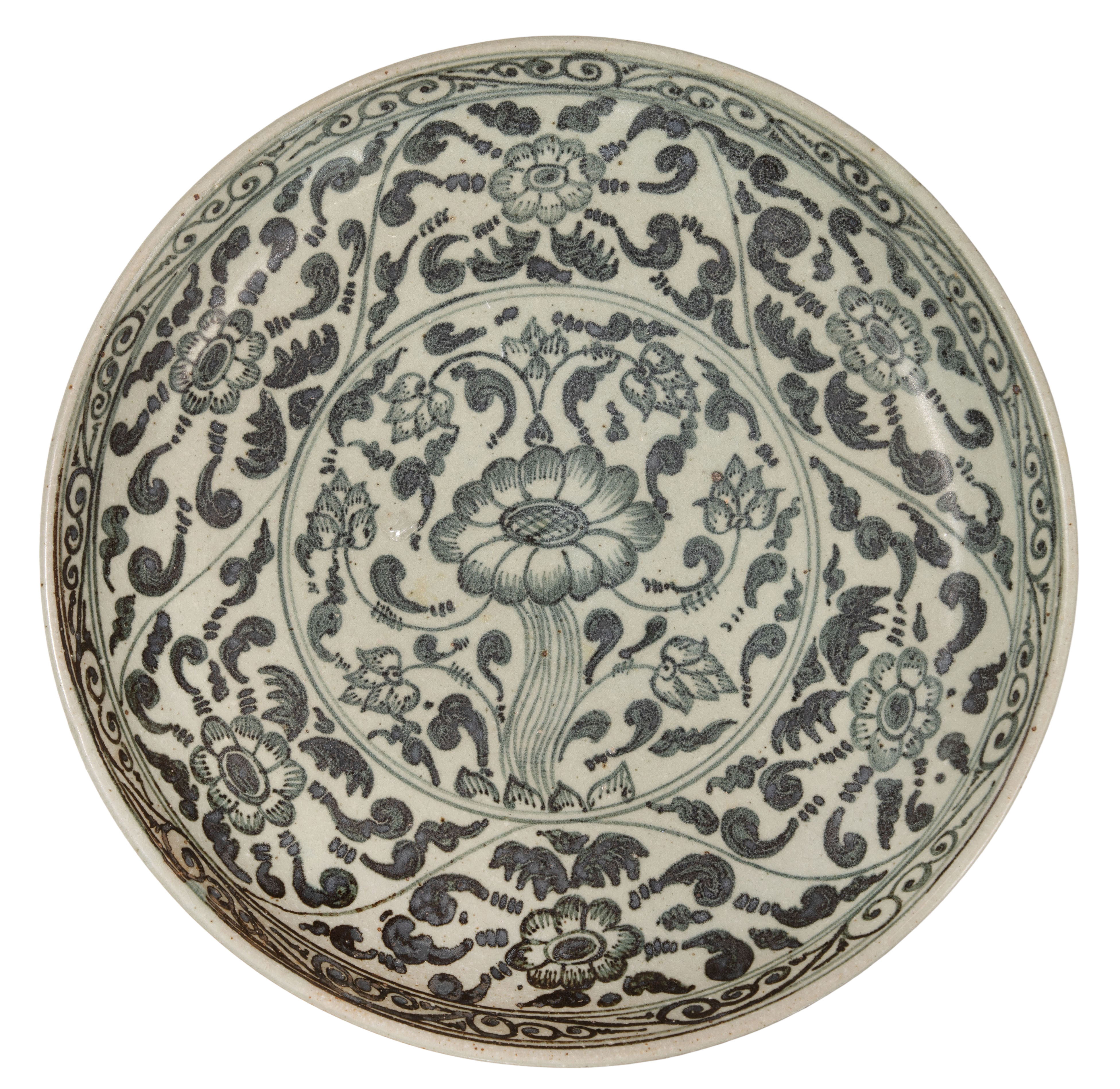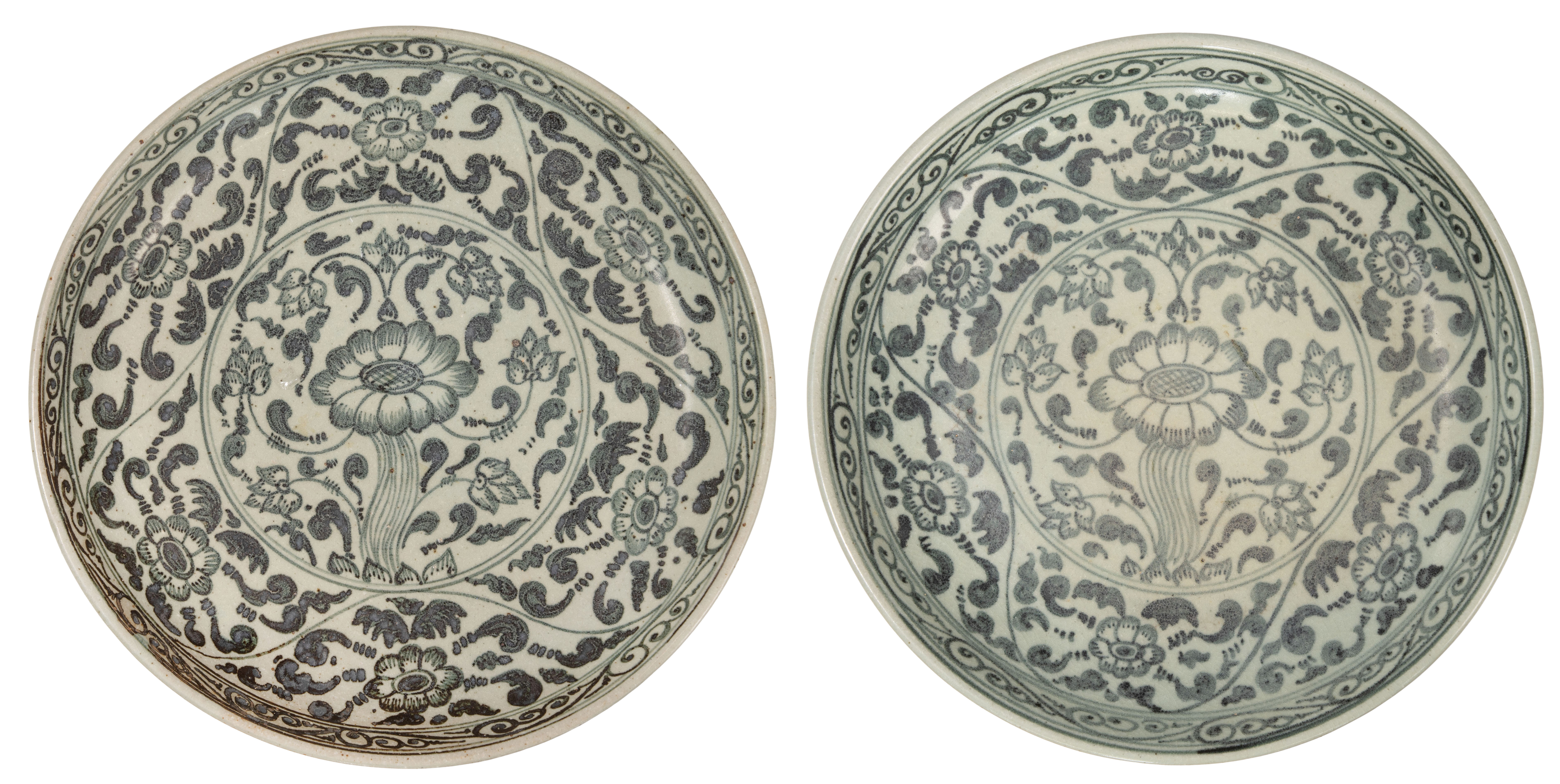 (2) items including similar blue and white chargers having a stoneware body painted in underglaze blue, a central design of a stylized lotus blossom, scrolling lotus blooms and leaves