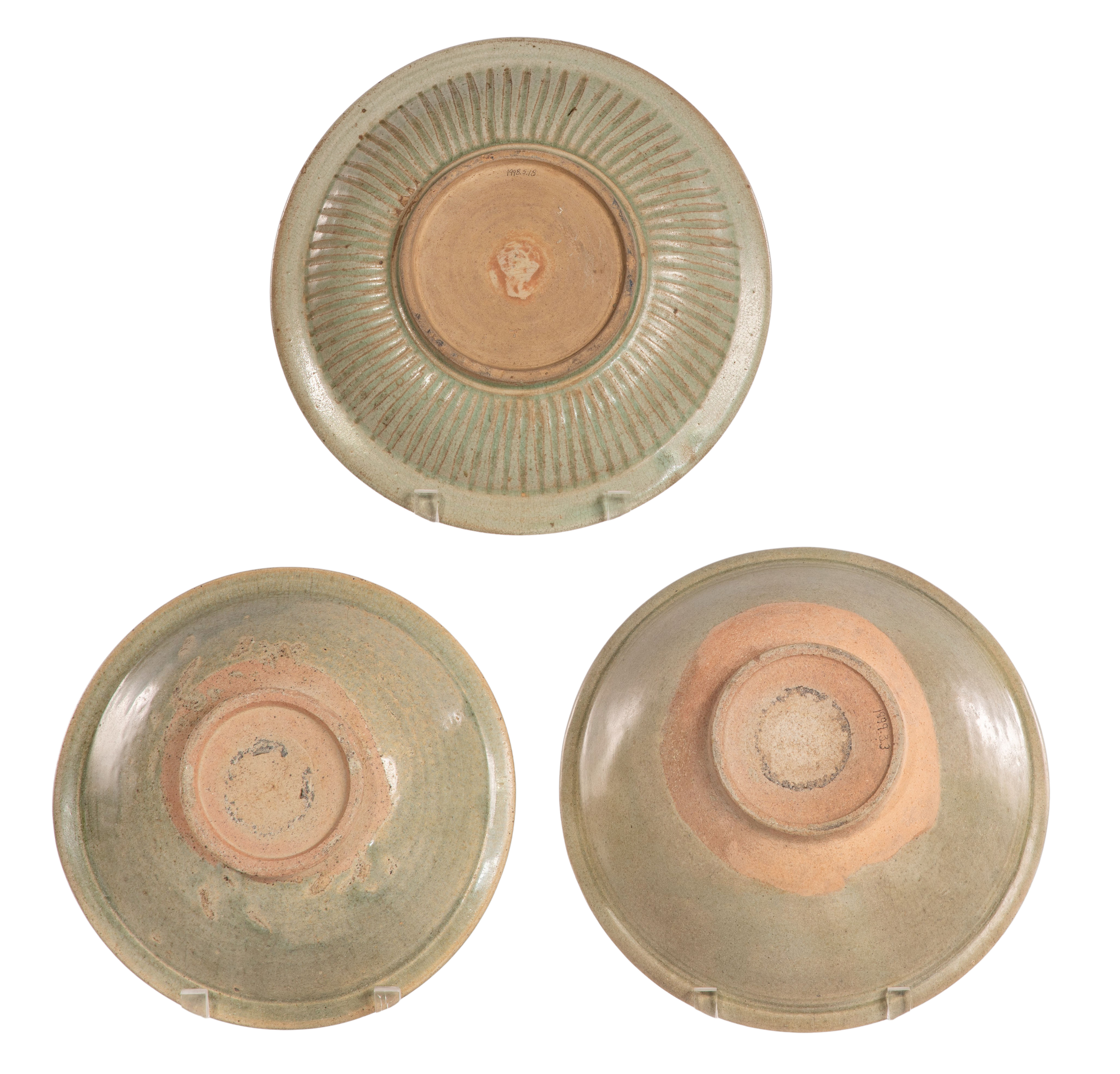 (3) celadon items including a plate having a fish pattern, a bowl having a diamond pattern and another bowl