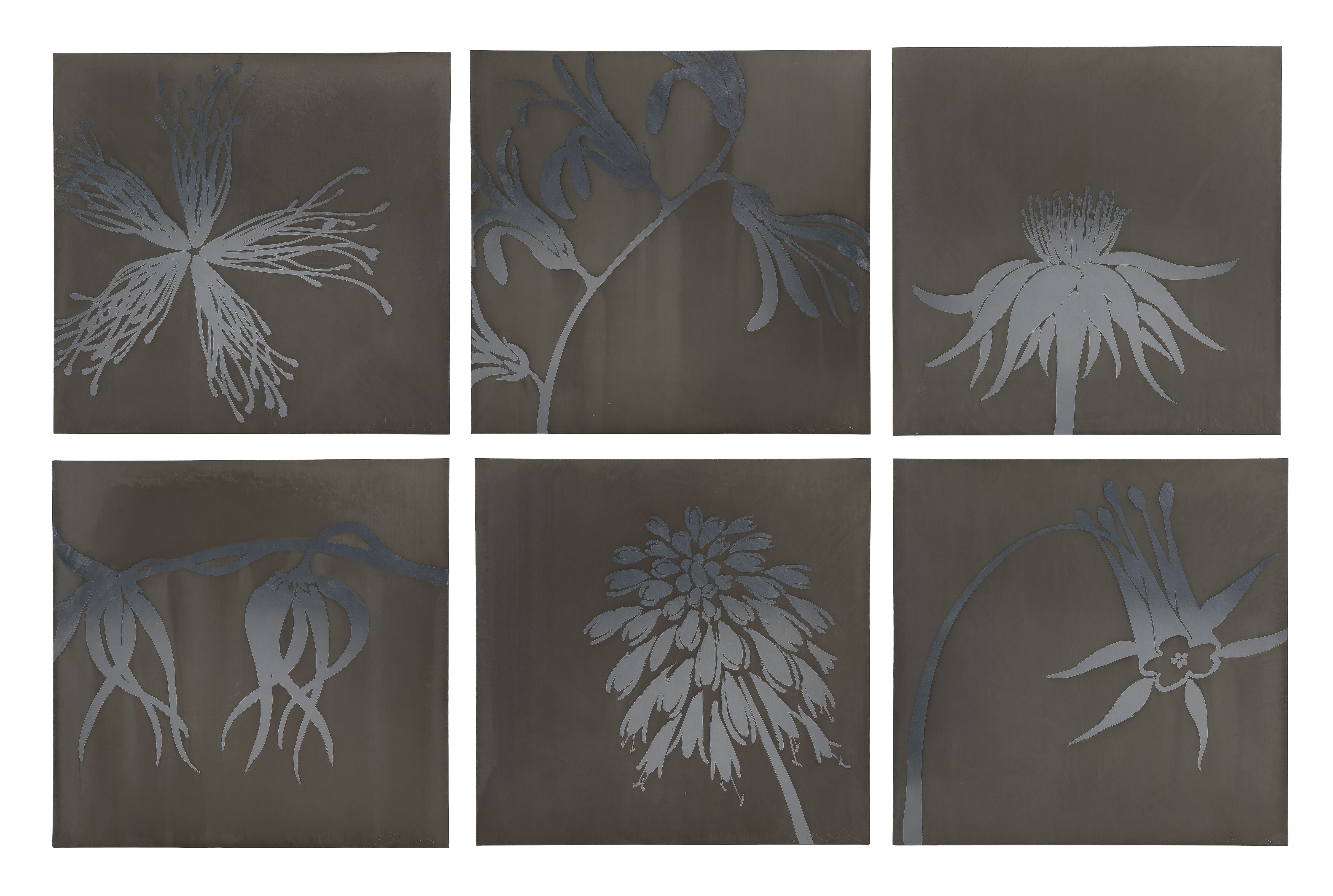 (6) items, each signed, dated 2008 and titled on artist’s labels verso, all being etched metal depictions of flowers, uniformly on thin sheets mounted to plywood boards on Baltic birch plywood support frames, including ‘Columbia’, ‘Hydra’, ‘Carina’, ‘Volan’, ‘Cetus’ and ‘Vela’