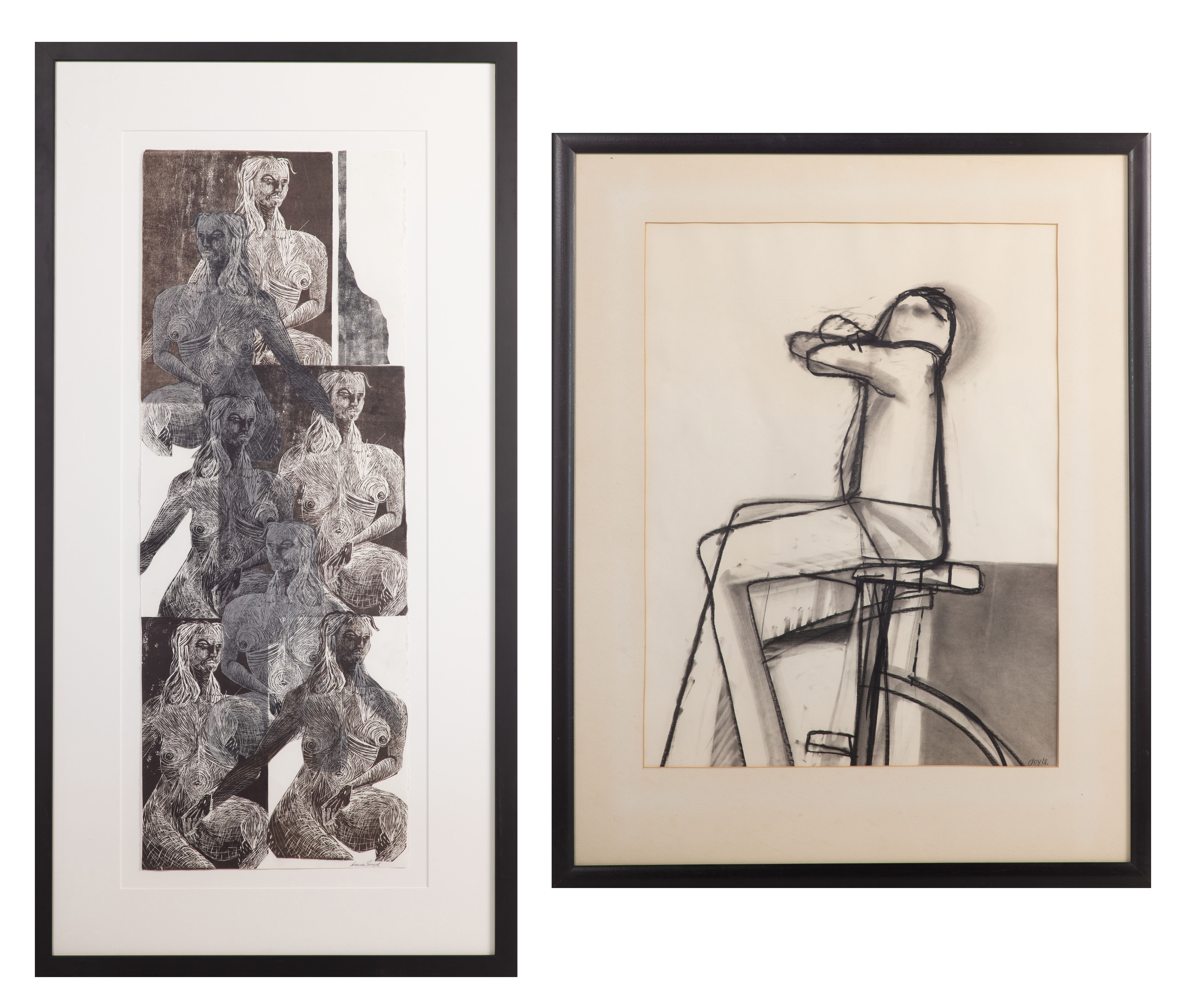 (2) total items including an undated, signed monotype study of form; together with a black and white drawing signed ‘Doyle’, depicting a seated figure, both matted in black wood frames under acrylic