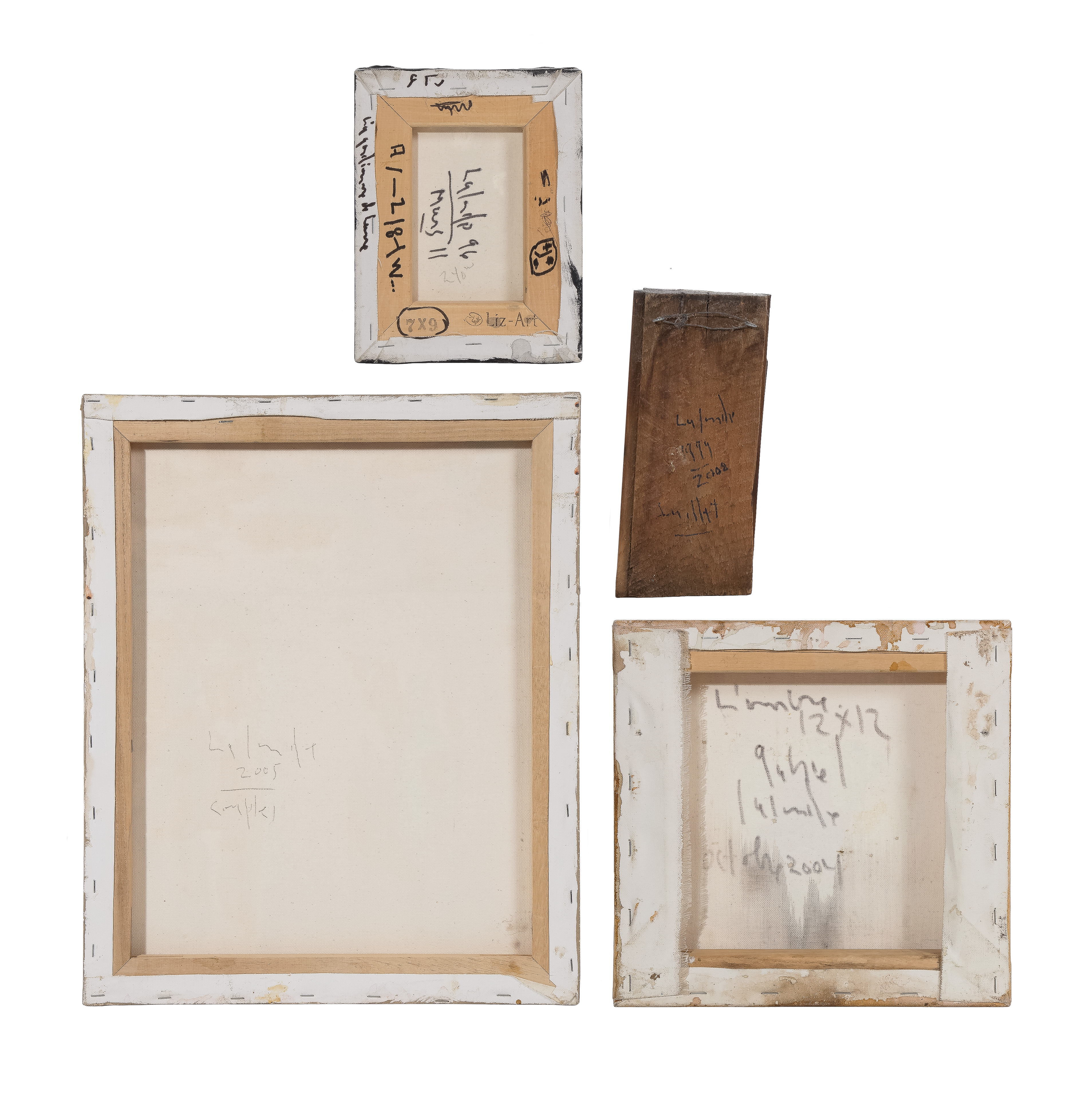 (4) signed works, dated to 1994, 2004, 2005 and 2008, mixed media of pigments, ash, dirt, plaster, fabric and recycled objects, (3) gallery wrapped, all having illegible titles verso