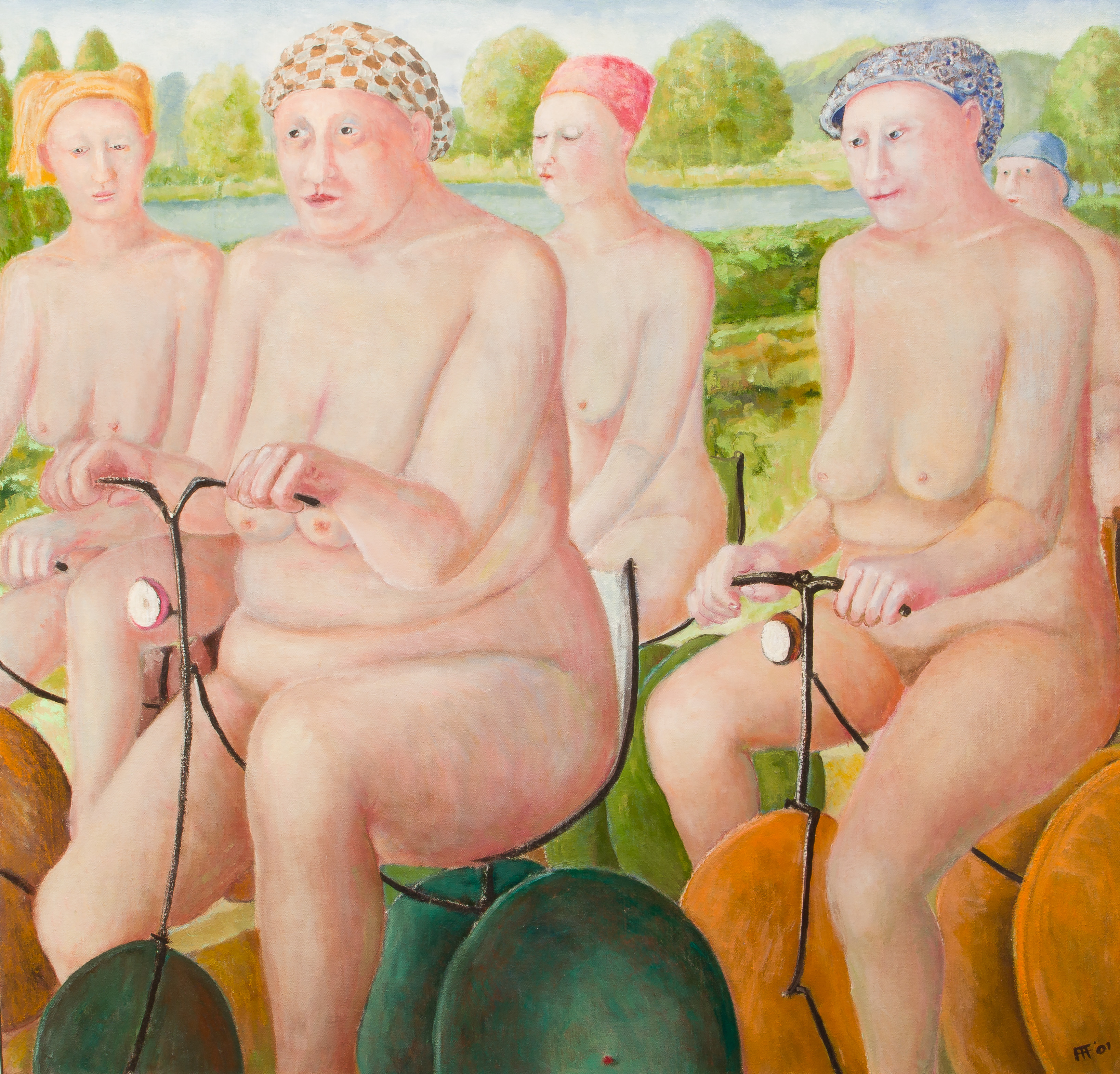 2001, signed and dated, depicting Rubenesque nudes on tricycles, having a painted wood frame