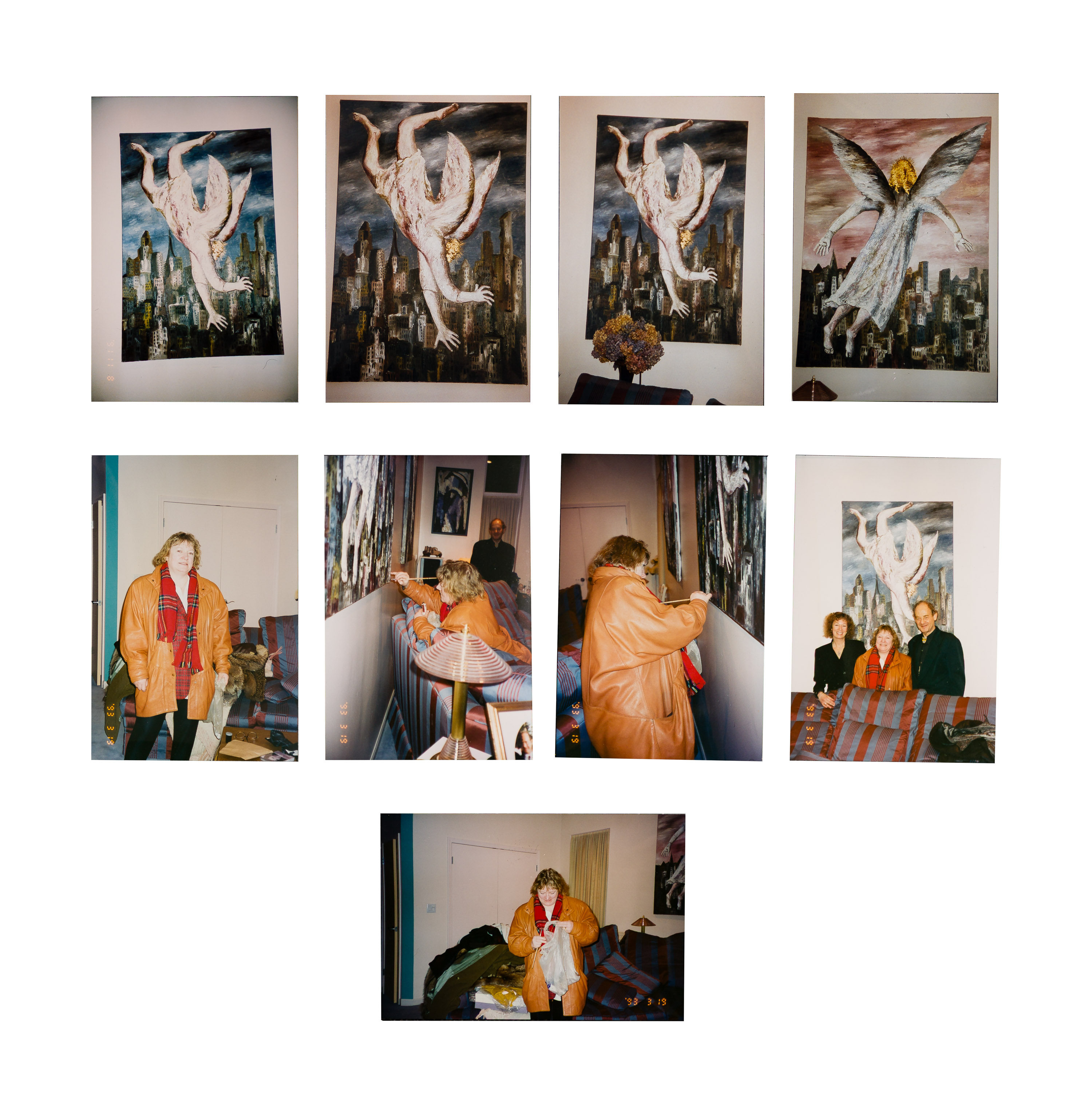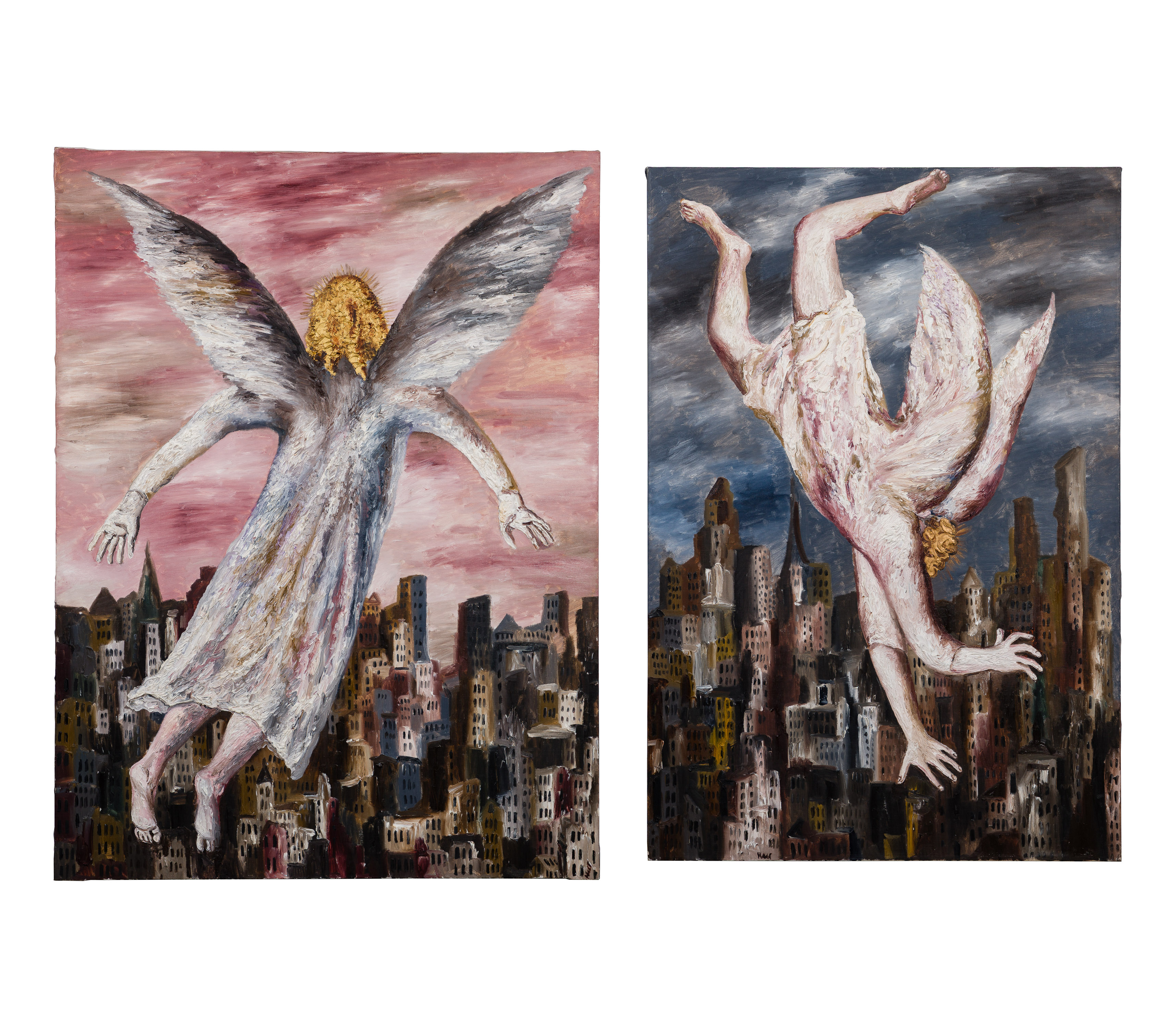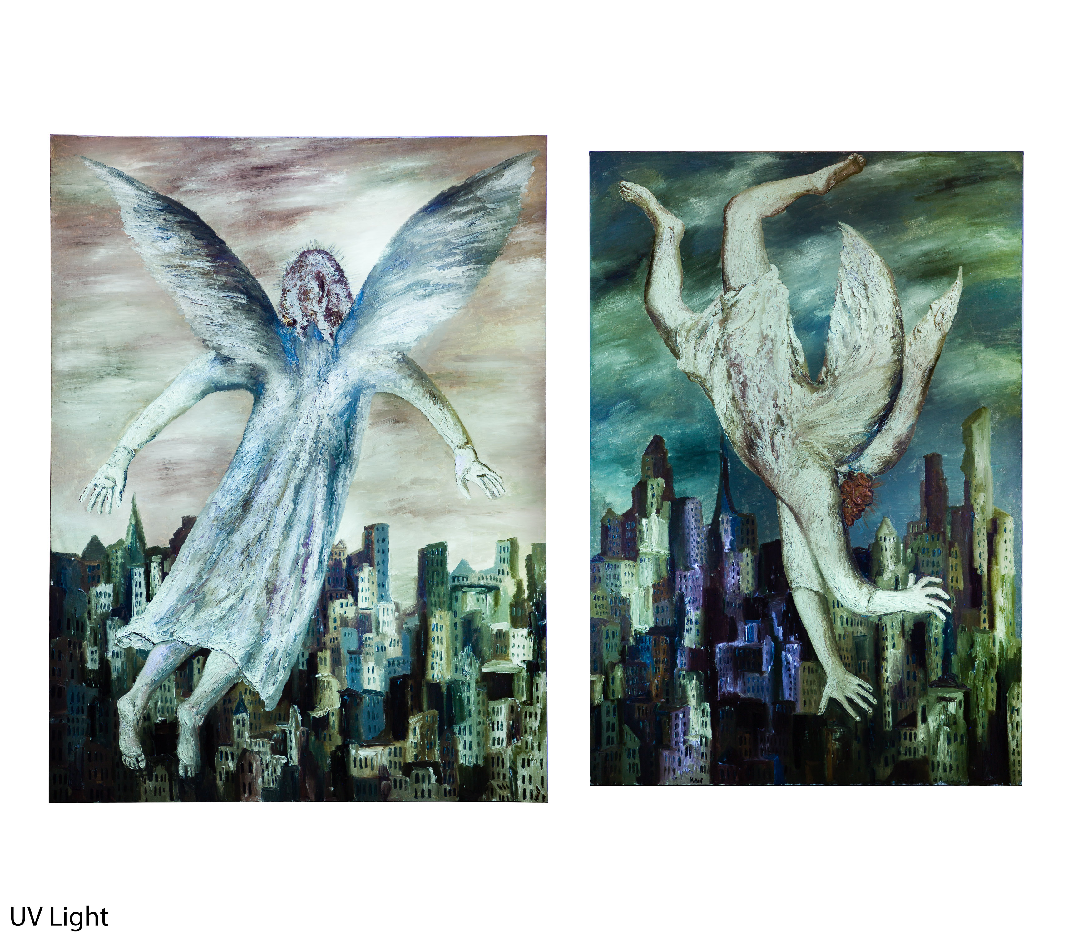 (2) oils on canvas, 1990, depicting angels ascending and descending over a city, signed and inscribed verso, including photographs of artist creating paintings, gallery wrapped canvas, retaining studio label