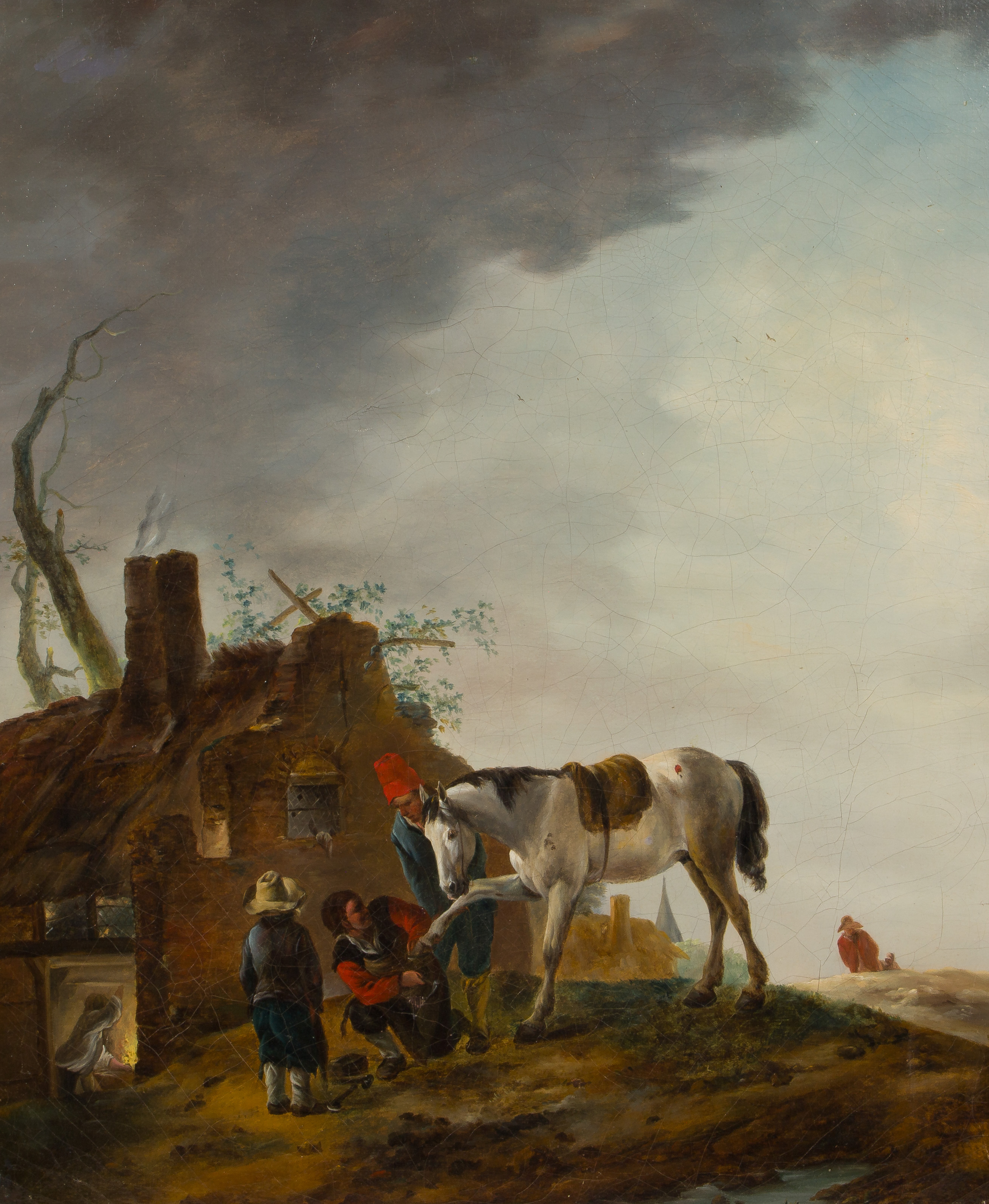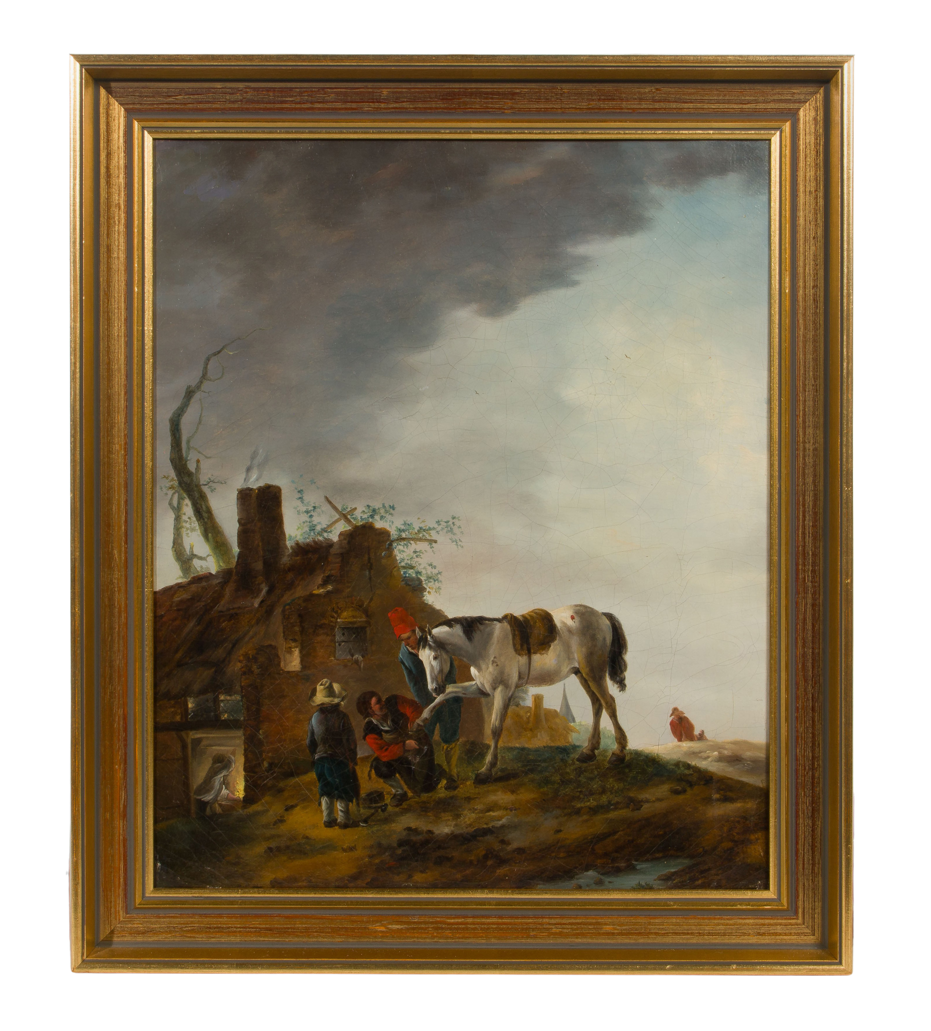 Undated and unsigned, depicting a horse being shod, verso of canvas retaining a red wax export seal reading ‘BERLIN’ under a crowned ‘R’, stretcher having a partial paper label in Cyrillic, in a gold-tone wood frame