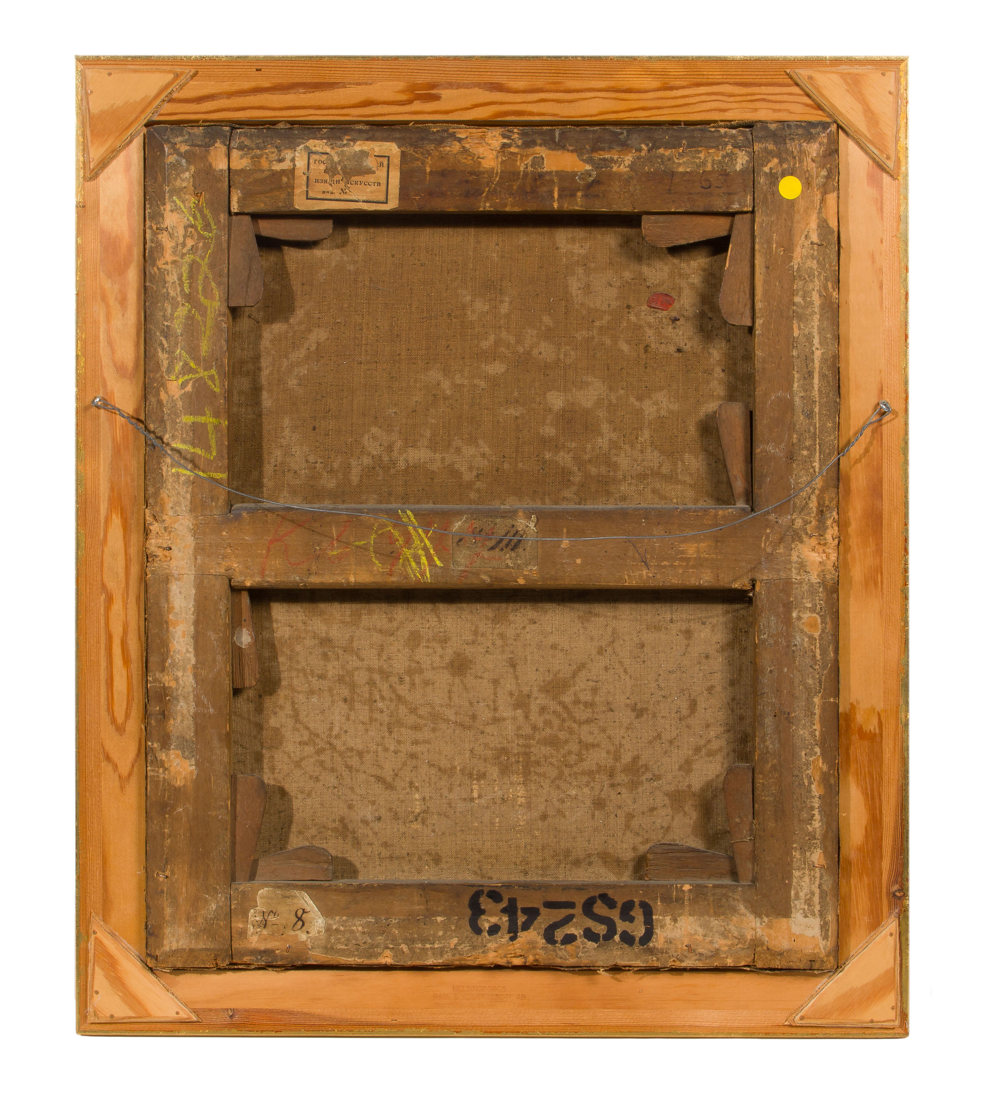 Condition: craquelure overall, light dirt accumulation, frame having wear including scratches, chips and nicks