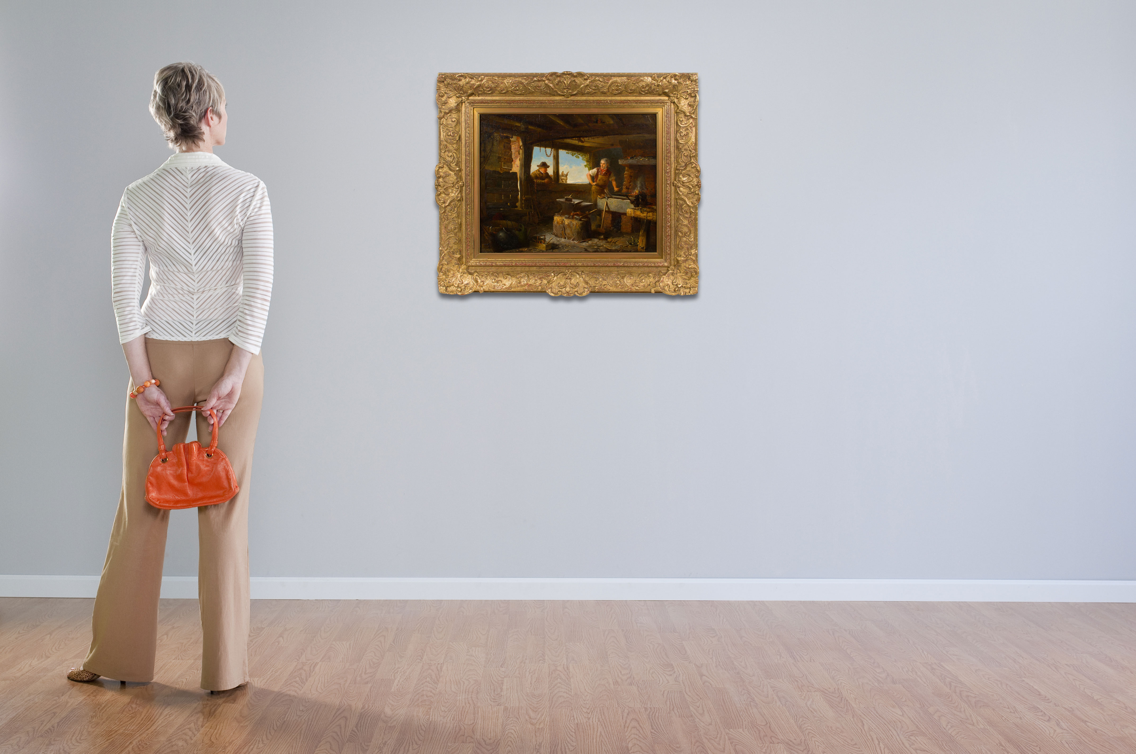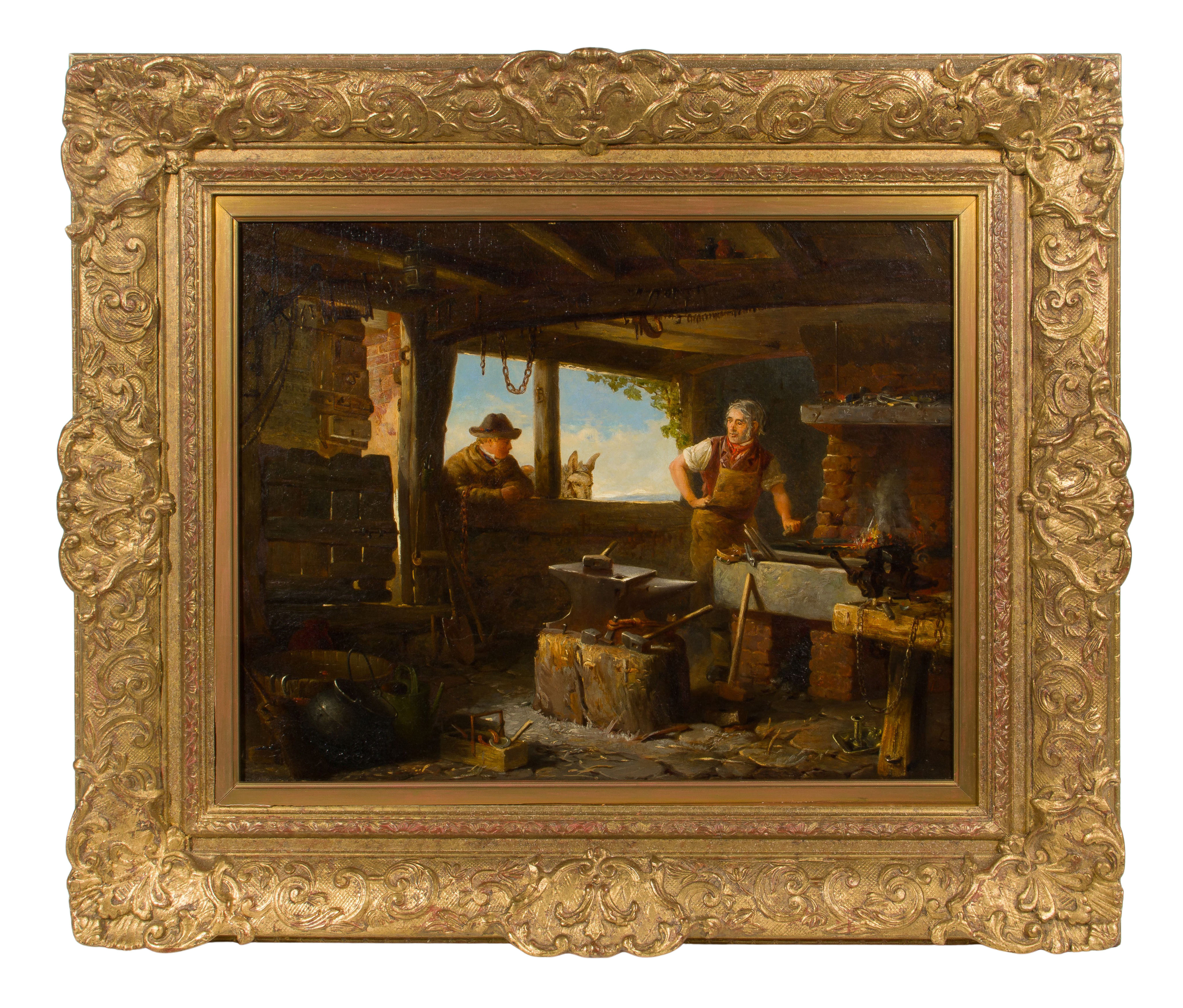 Undated and unsigned depiction of a blacksmith shop, in a gold-tone gesso on carved wood frame, a Dixon & Dixon of Royal, Inc., New Orleans COA giving attribution