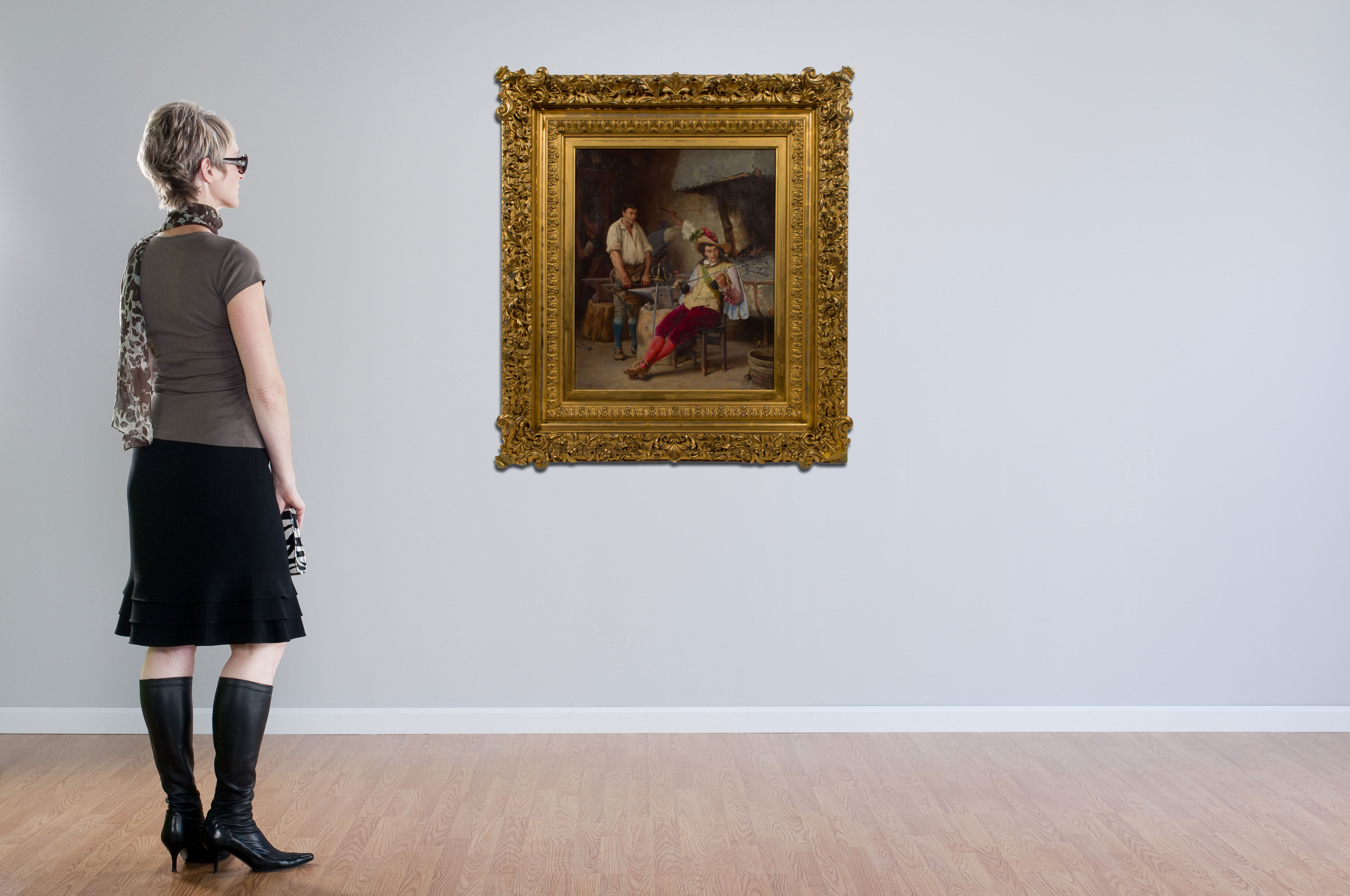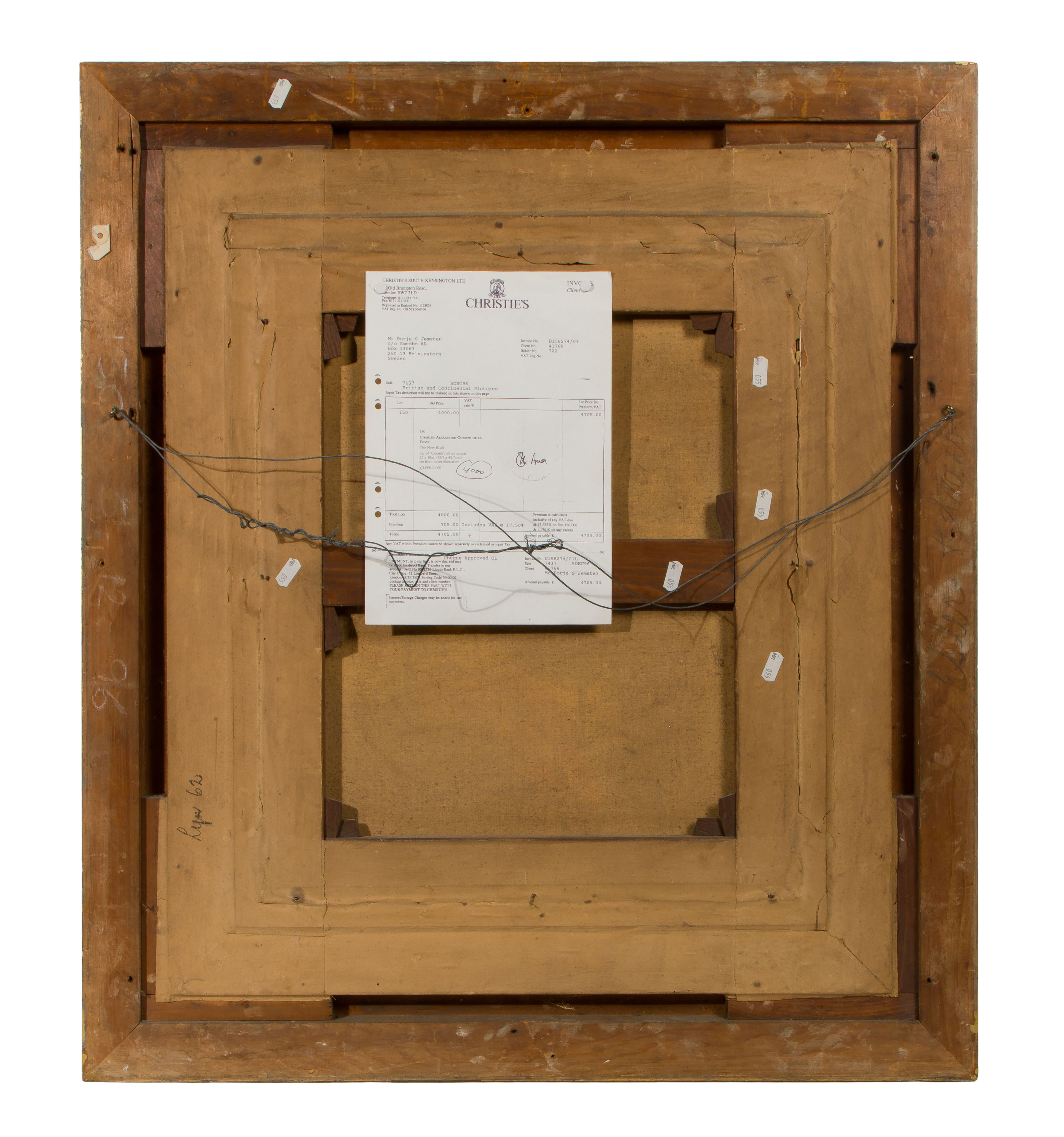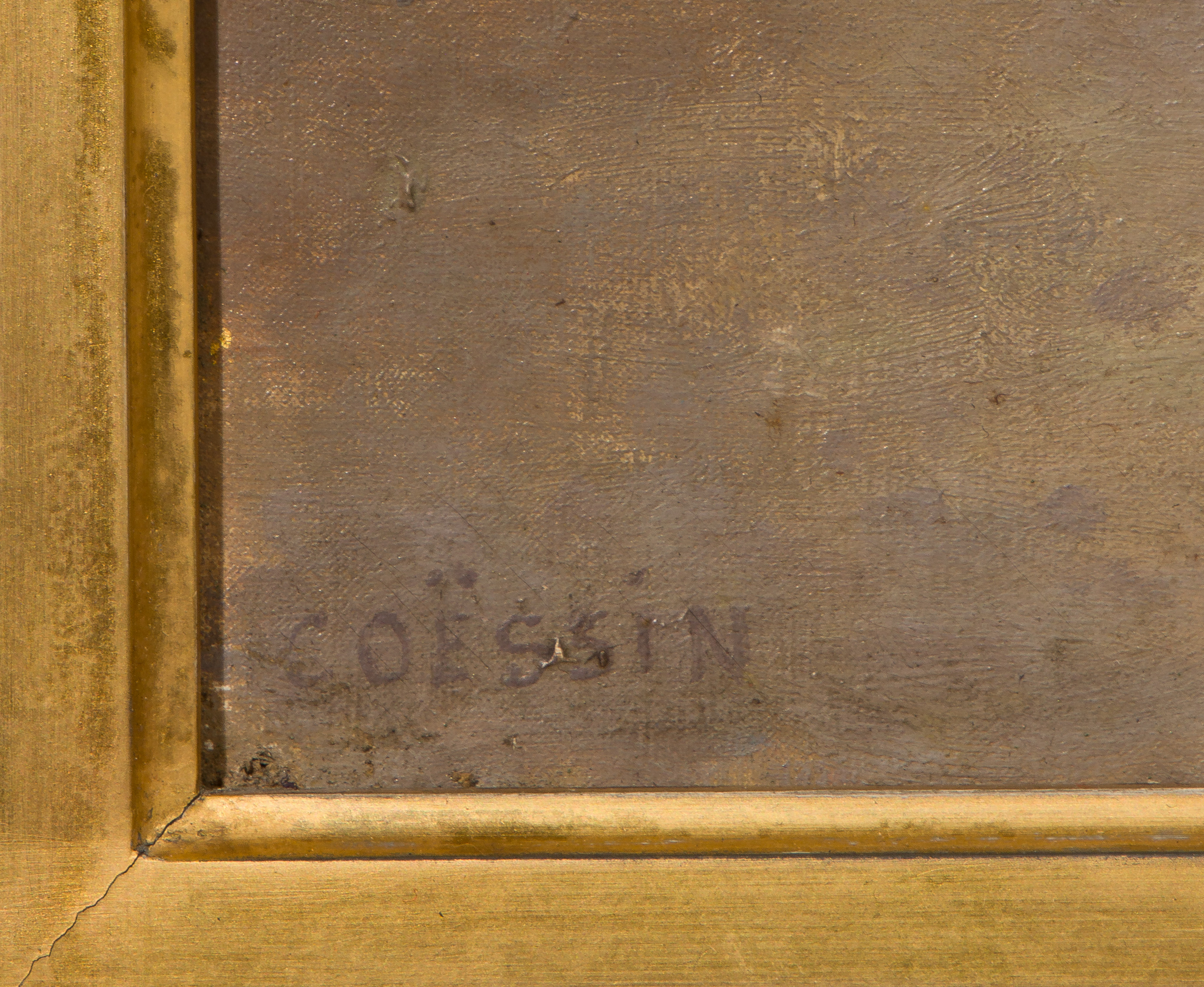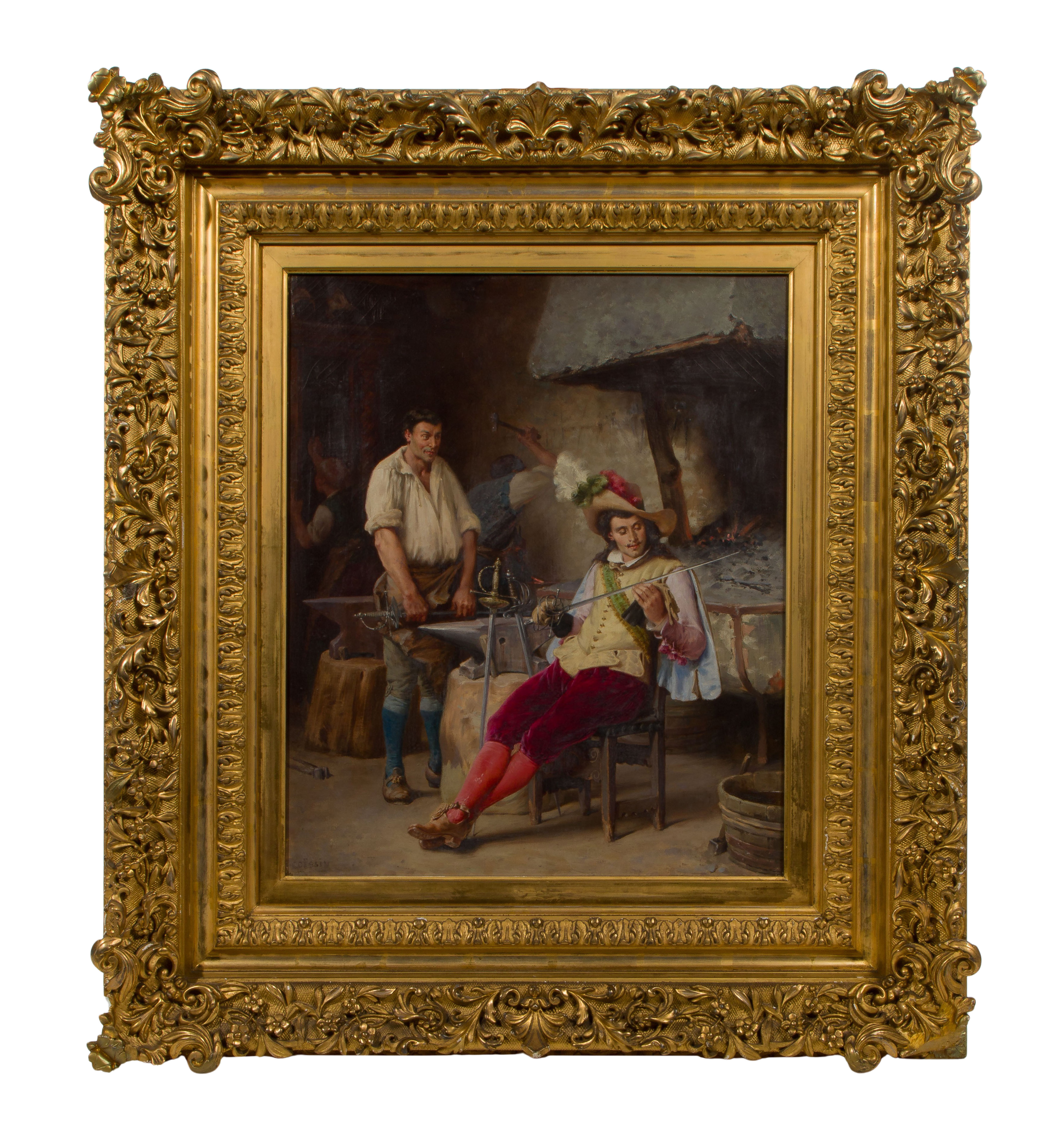 Undated, signed ‘Coessin’, depicting a cavalier inspecting a sword, in a gold-tone gesso on carved wood frame, a Christie’s, London receipt
