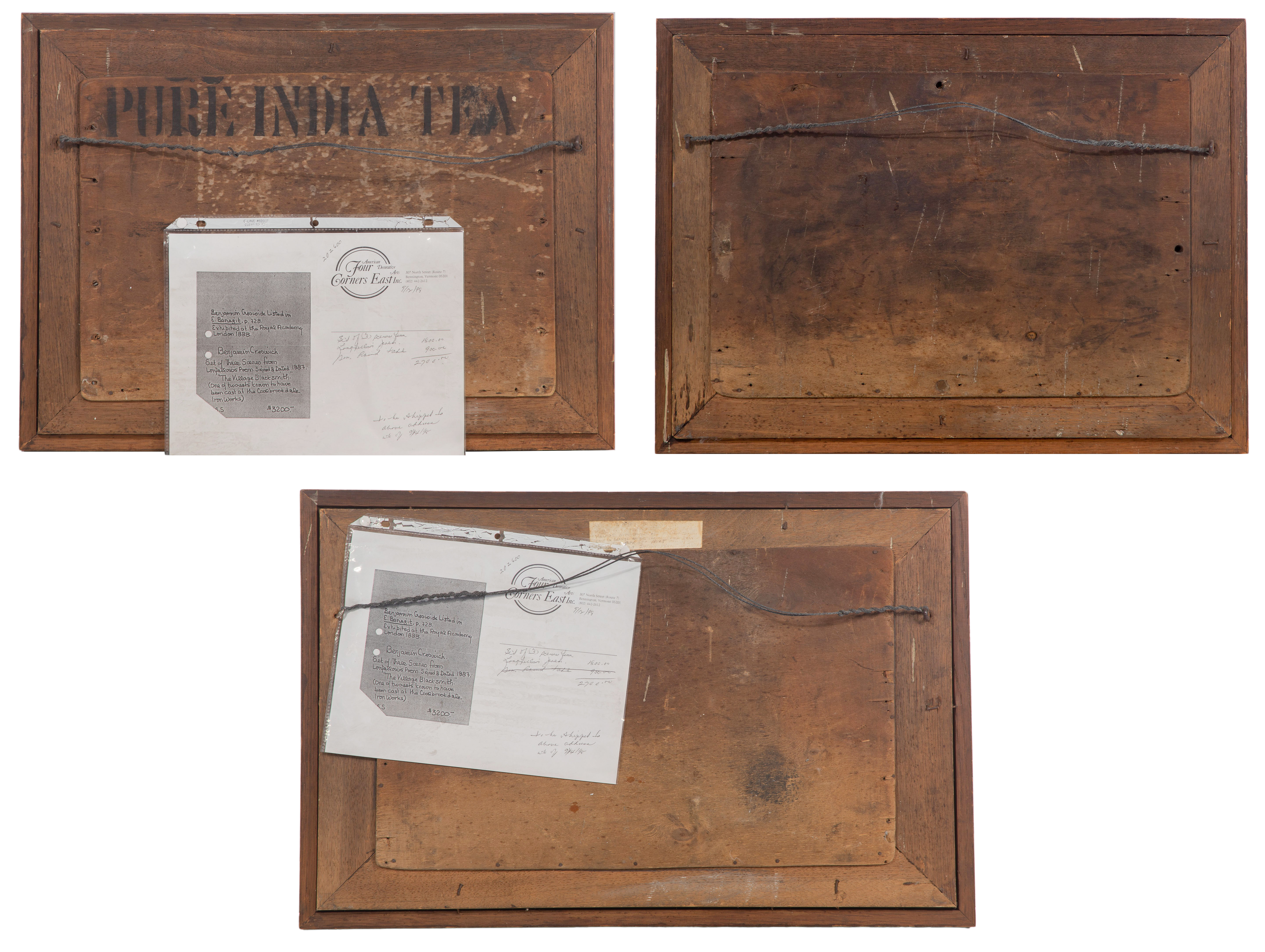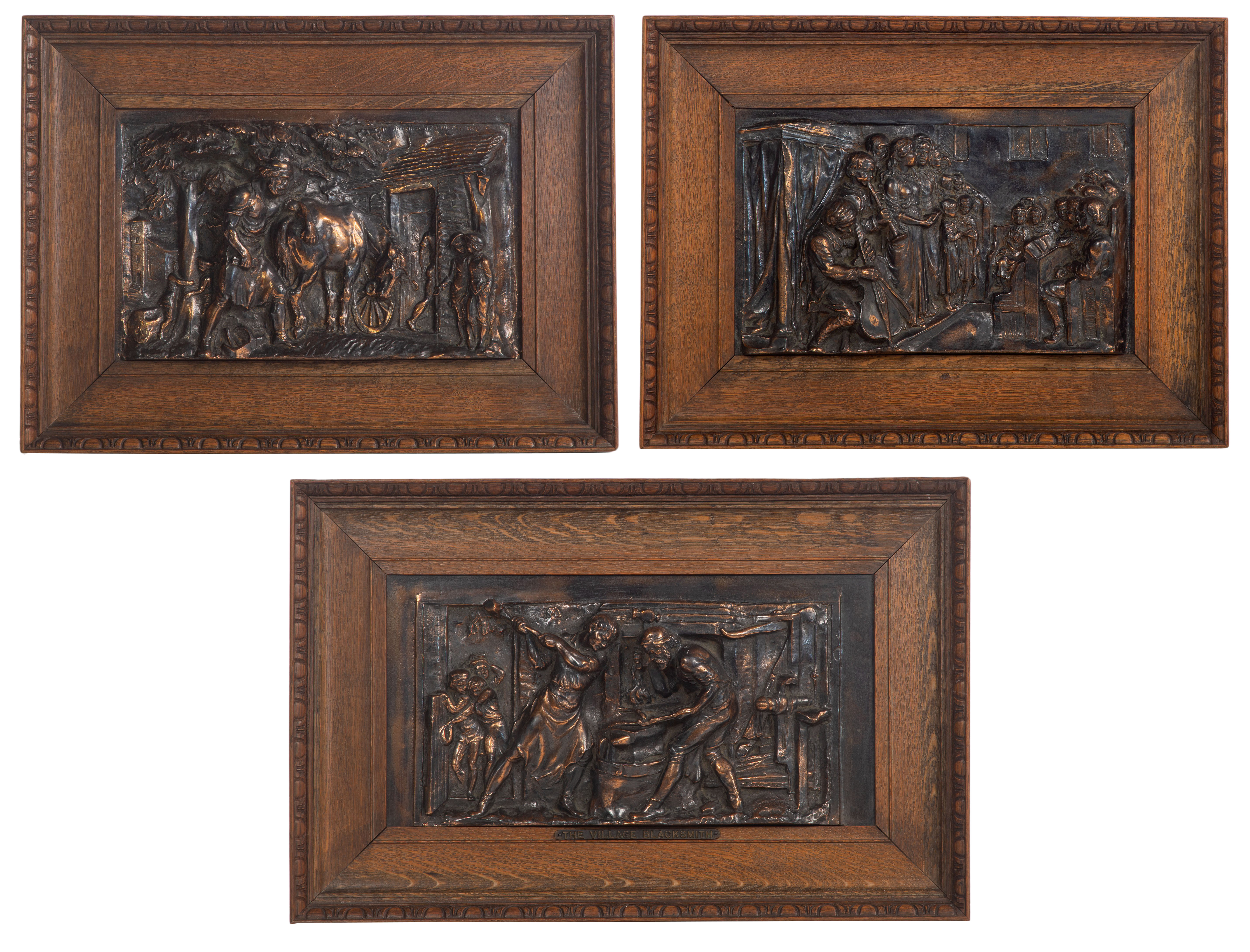 (3) similar items, 1887, signed and said to be forged in Coalbrookdale, all bronze patinated cast iron based on Longfellow’s poem ‘The Village Blacksmith’, framed, (2) having attribution verso