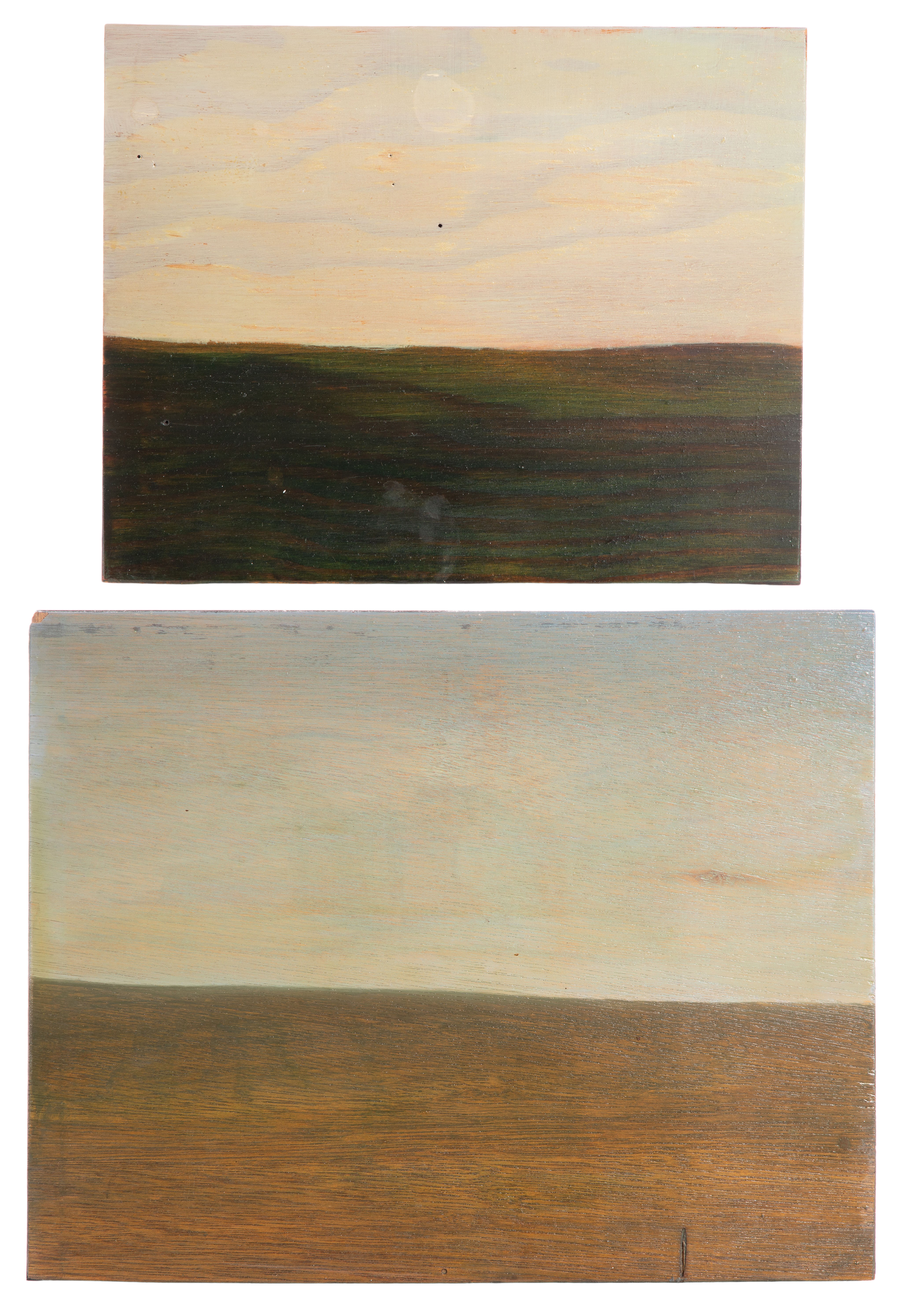 (2) undated and unsigned items, a merging of color creating a blank landscape, unframed, retaining original gallery label giving artist attribution