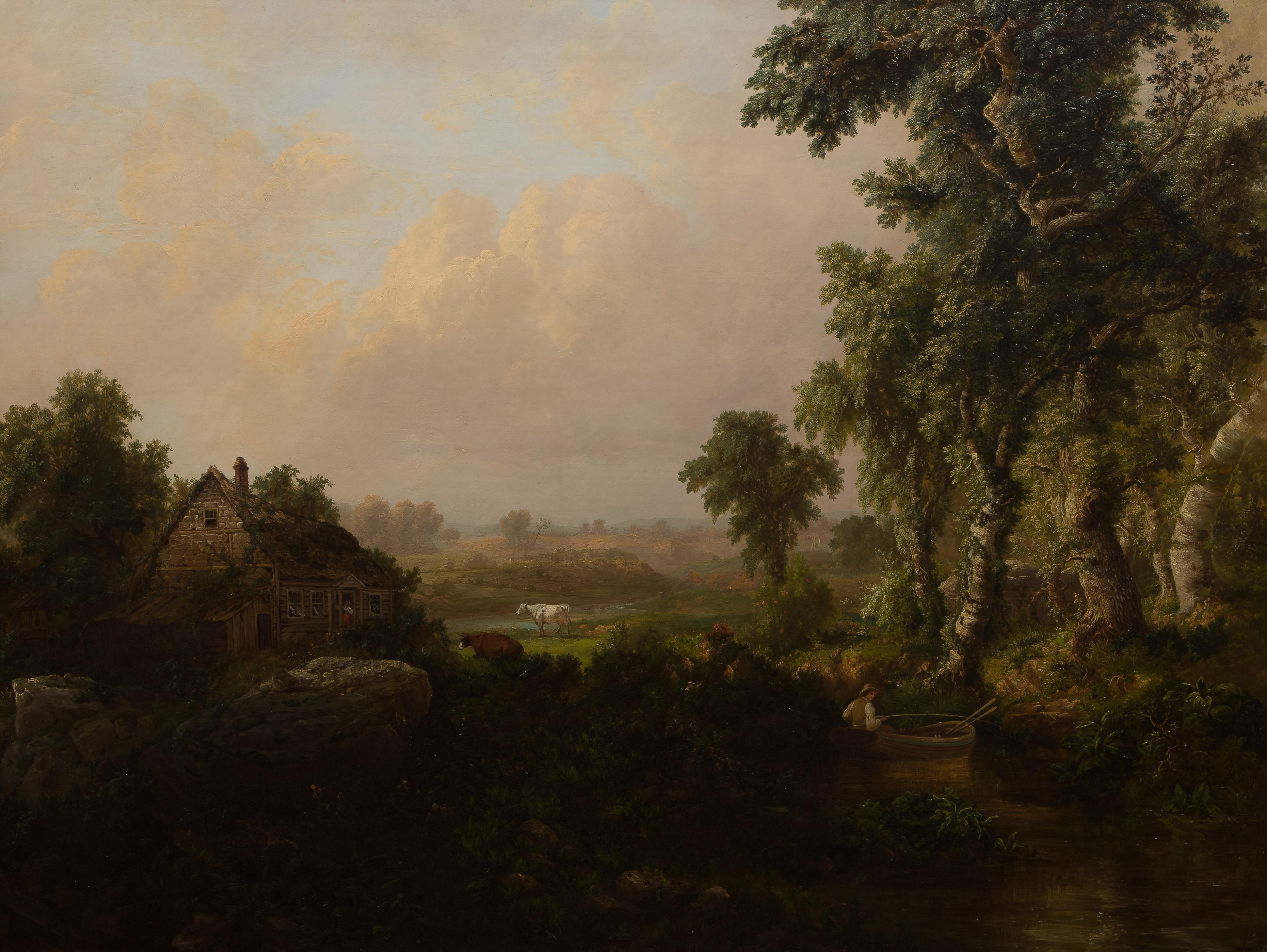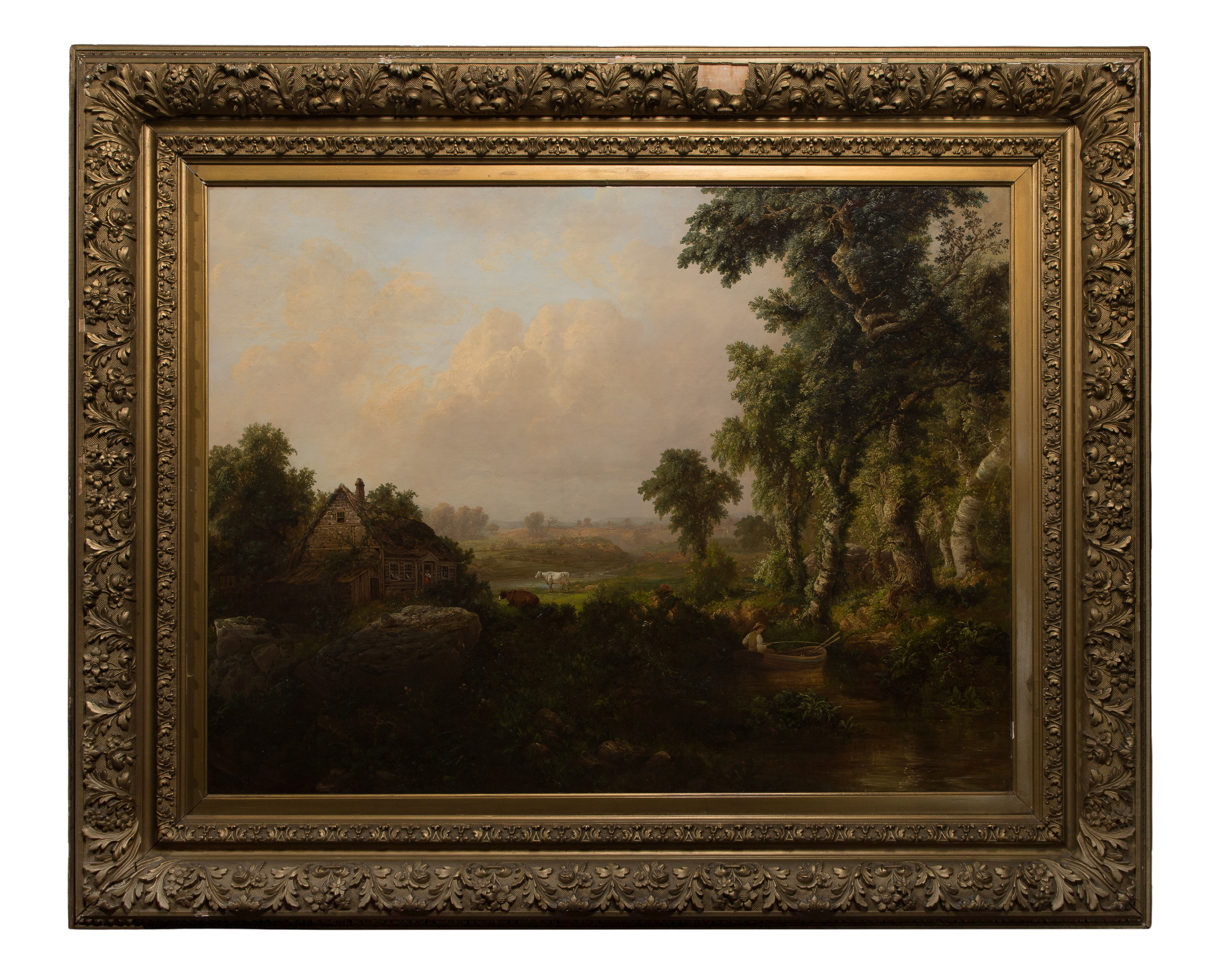 Undated, signed lower left, a landscape having an angler in a rowboat, a cottage in the wooded foreground, a cow visible in the sunlit clearing beyond, in a gold-tone gesso on carved wood frame