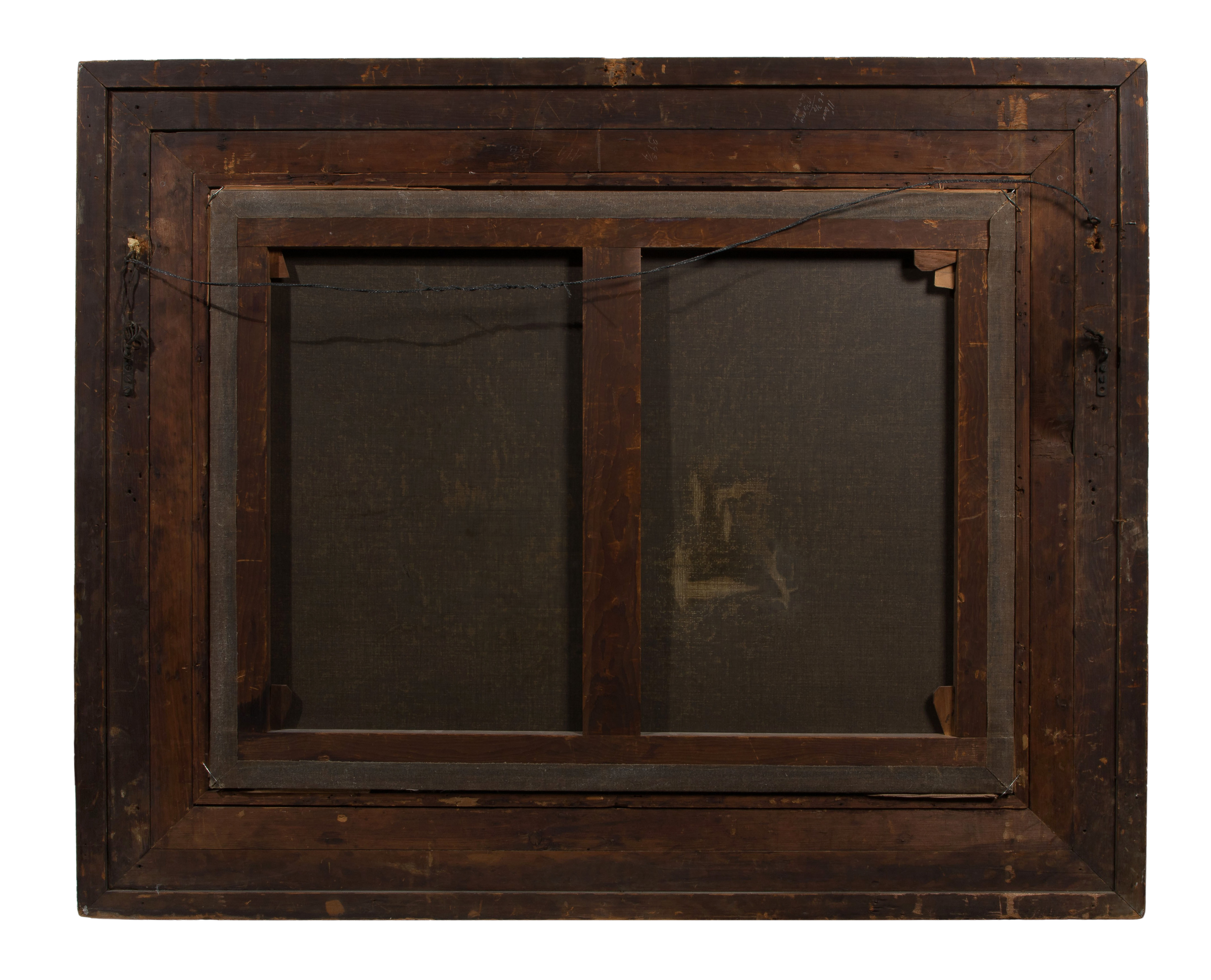 Condition: inspected under UV light, in-painting at a scrape in clouds upper left quadrant, a few small losses to paint near top and right edges, frame having light to moderate wear, chips and losses (some present and bagged)