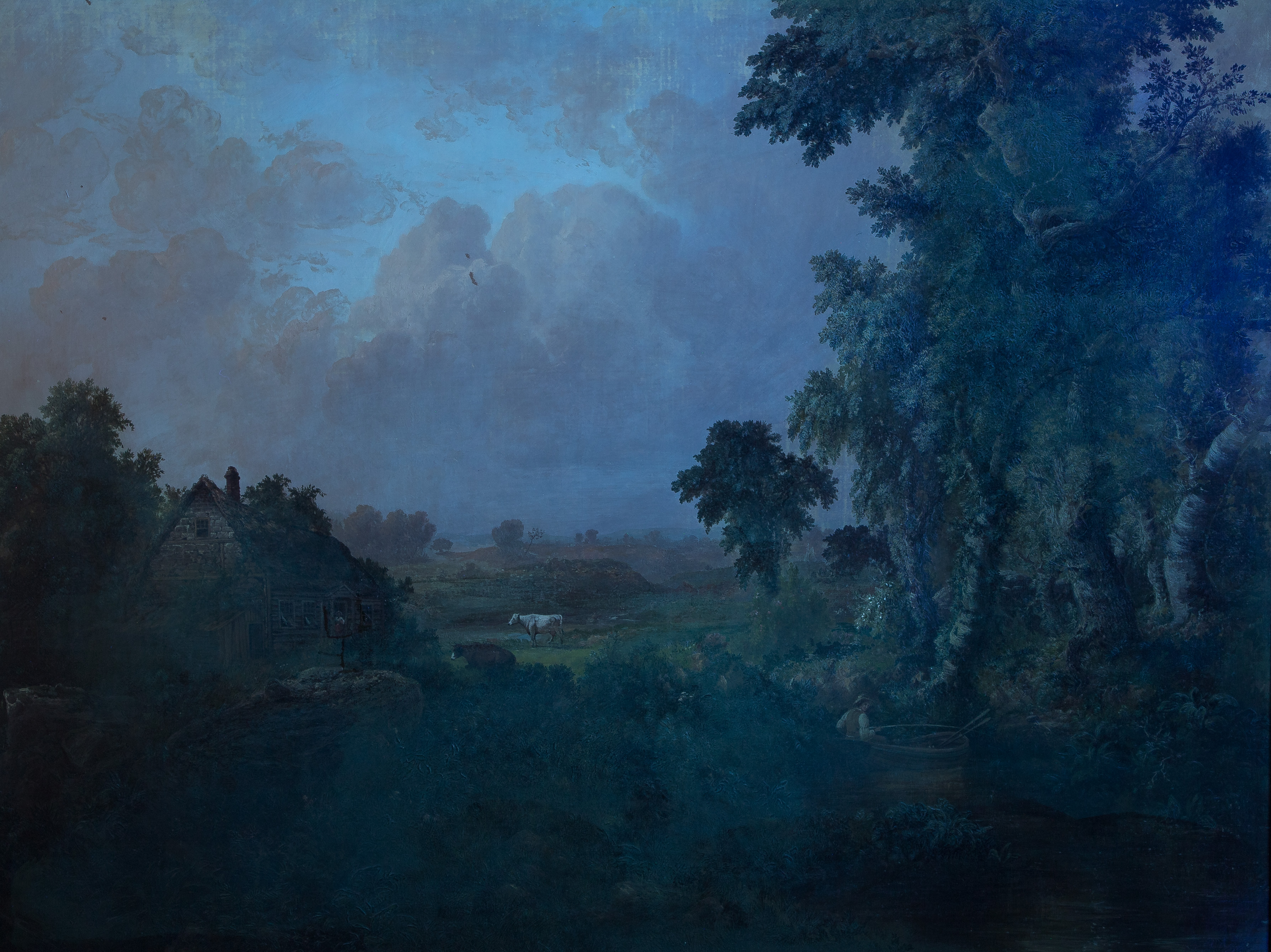 inspected under UV light, in-painting at a scrape in clouds upper left quadrant, a few small losses to paint near top and right edges, frame having light to moderate wear, chips and losses (some present and bagged)