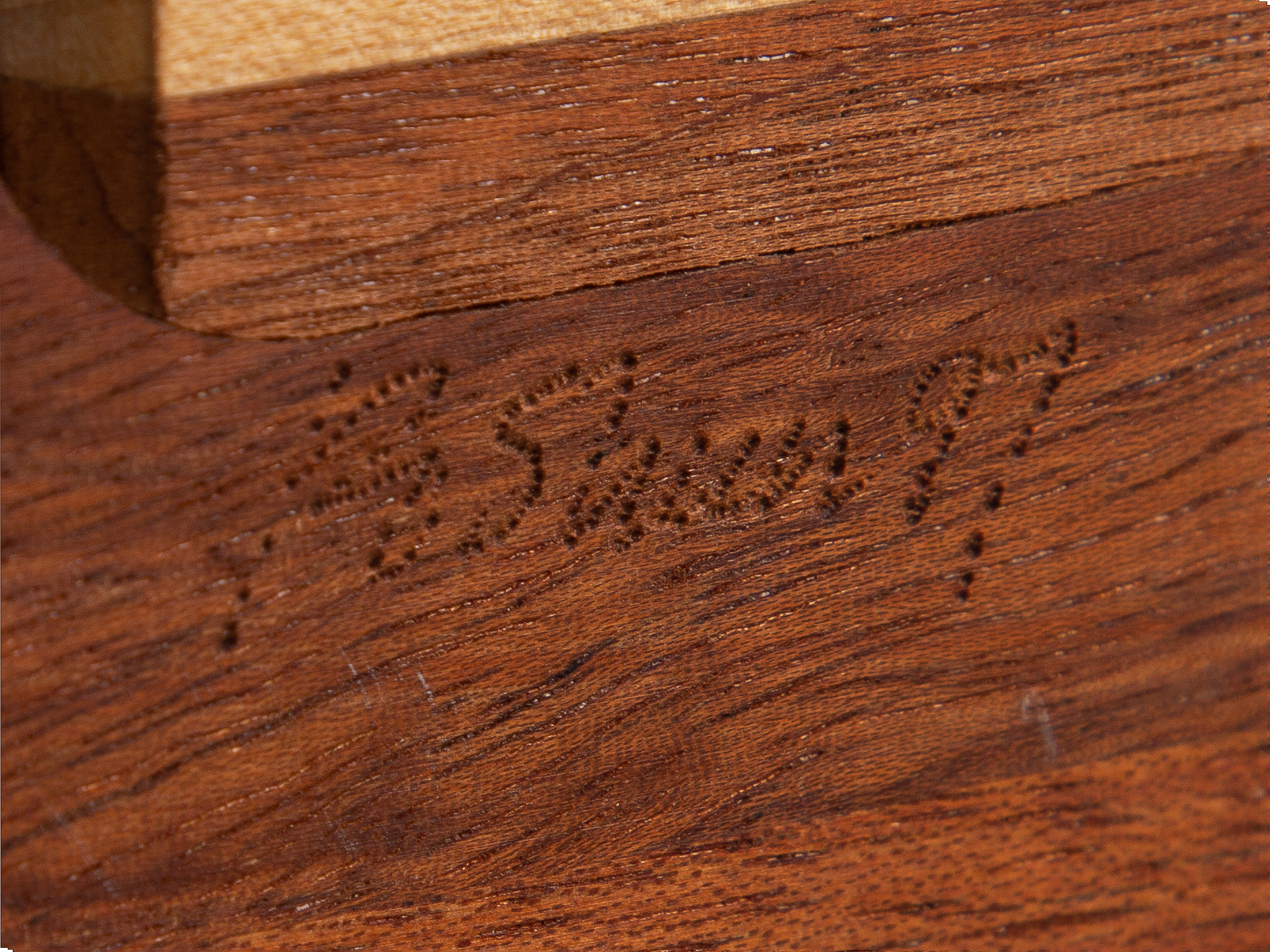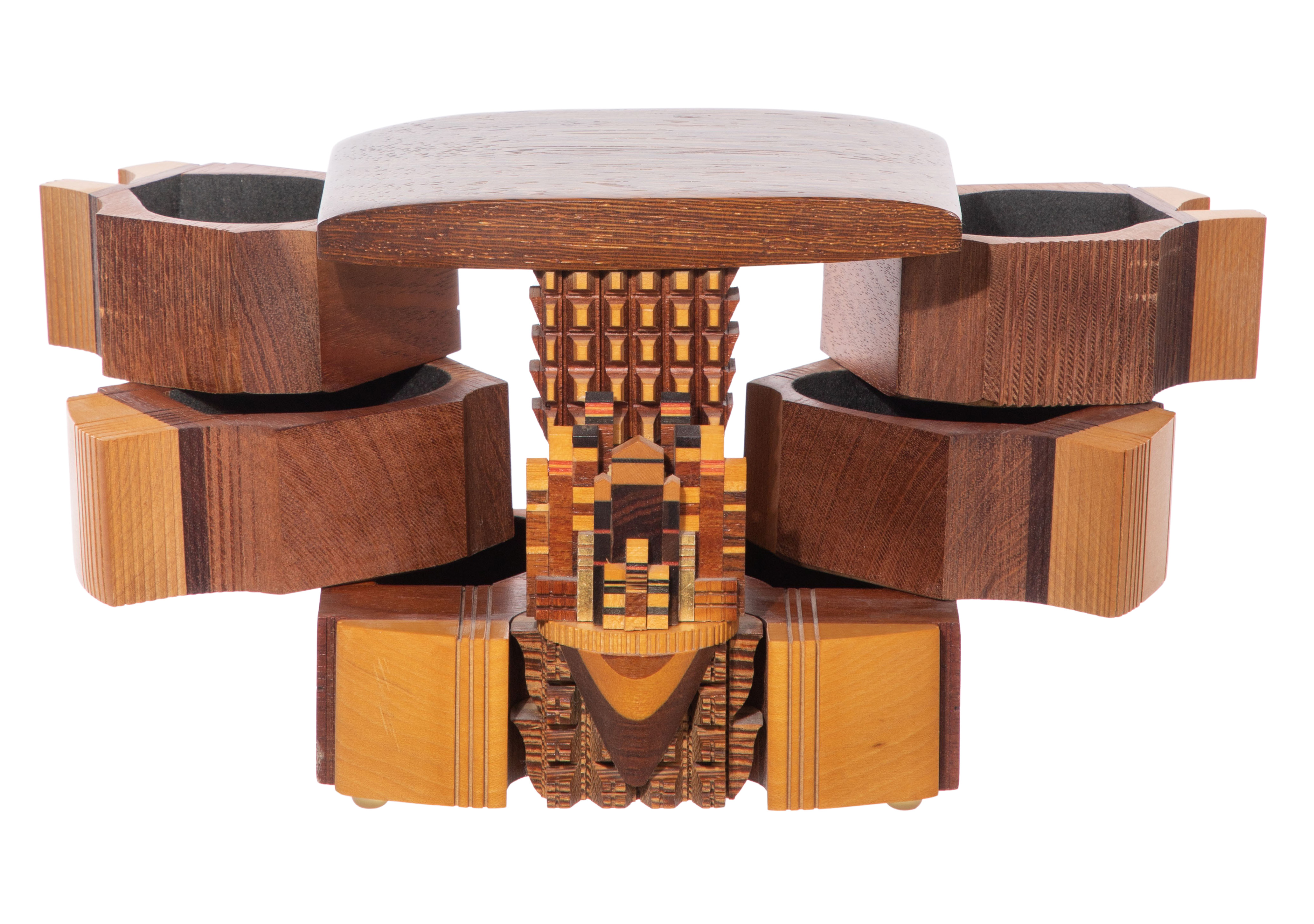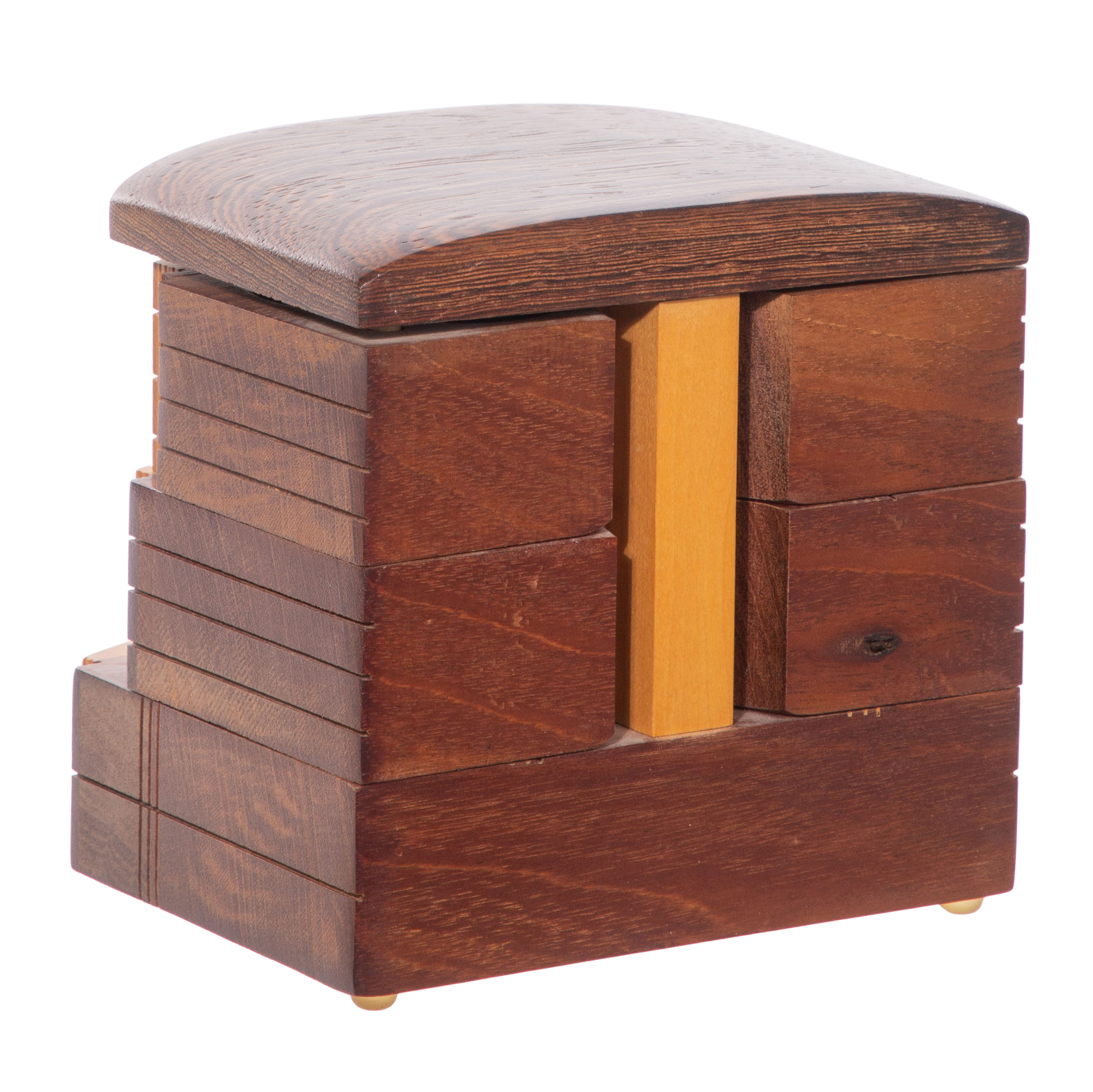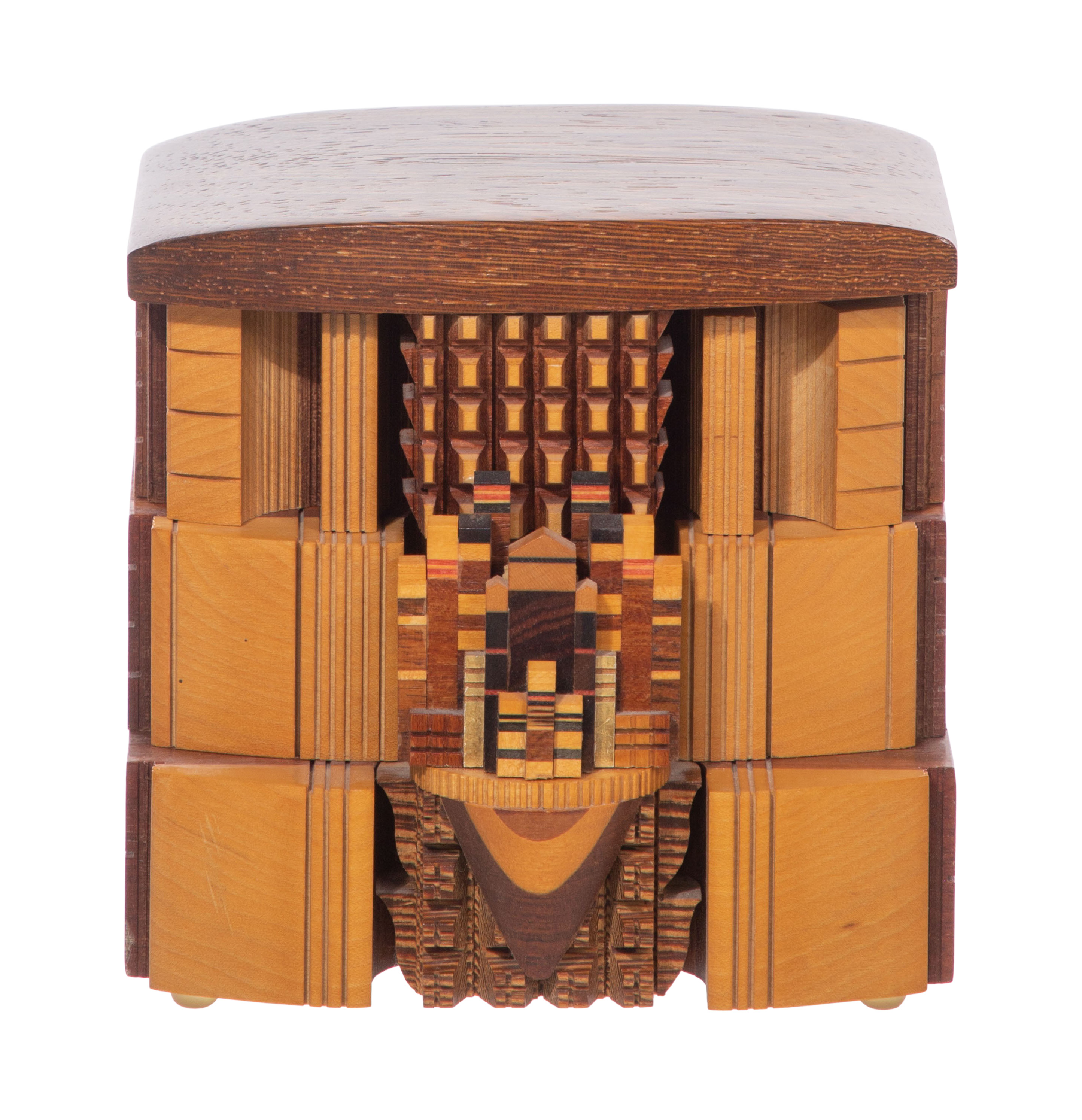 1995, signed, a wooden puzzle box made in maple, mahogany and other woods having hand carved landscape motif