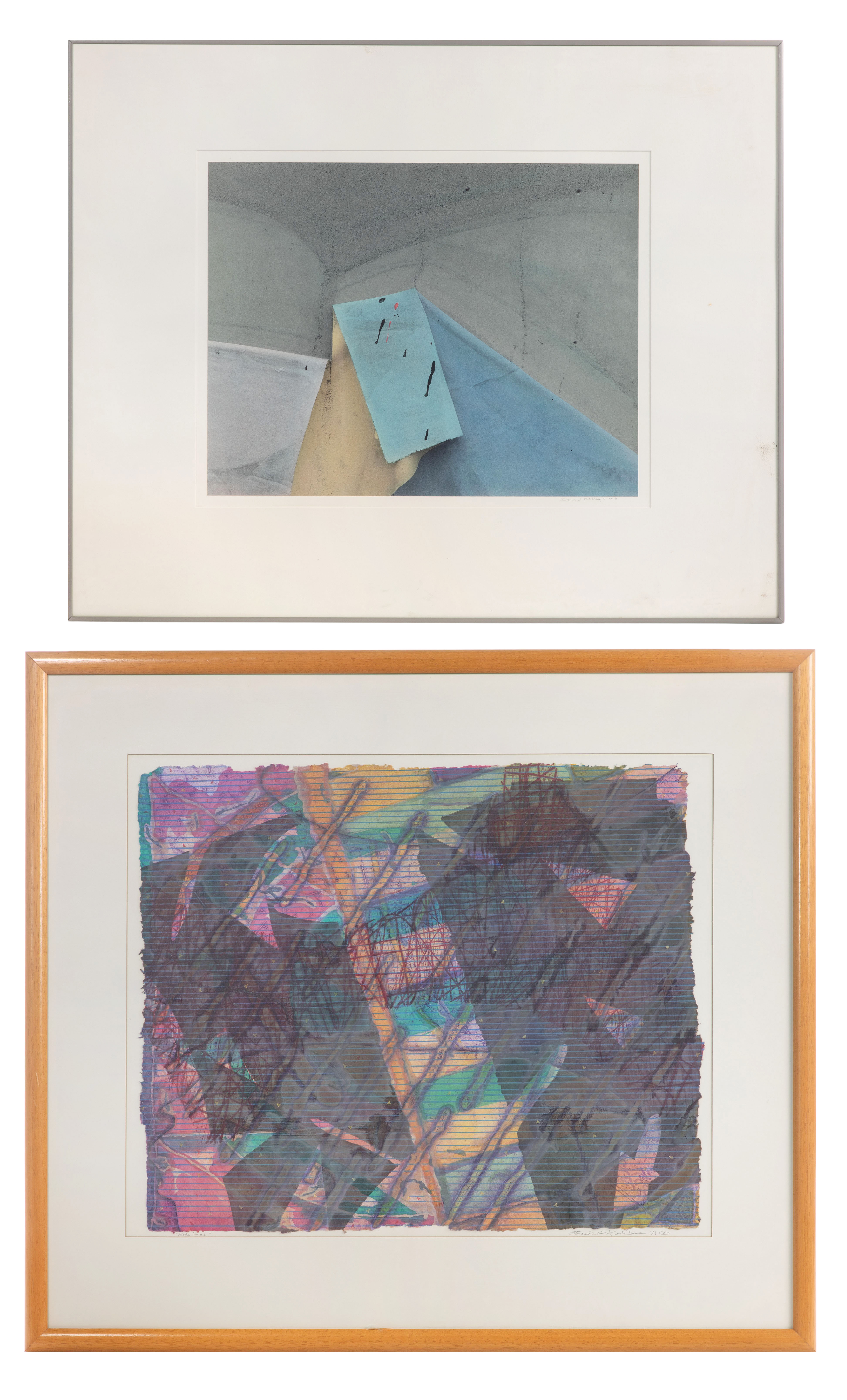 (2) total items including a 1987 abstract Markley lithograph, pencil signed; together a 1991 illegibly signed abstract lithograph, both matted under acrylic in wood frames