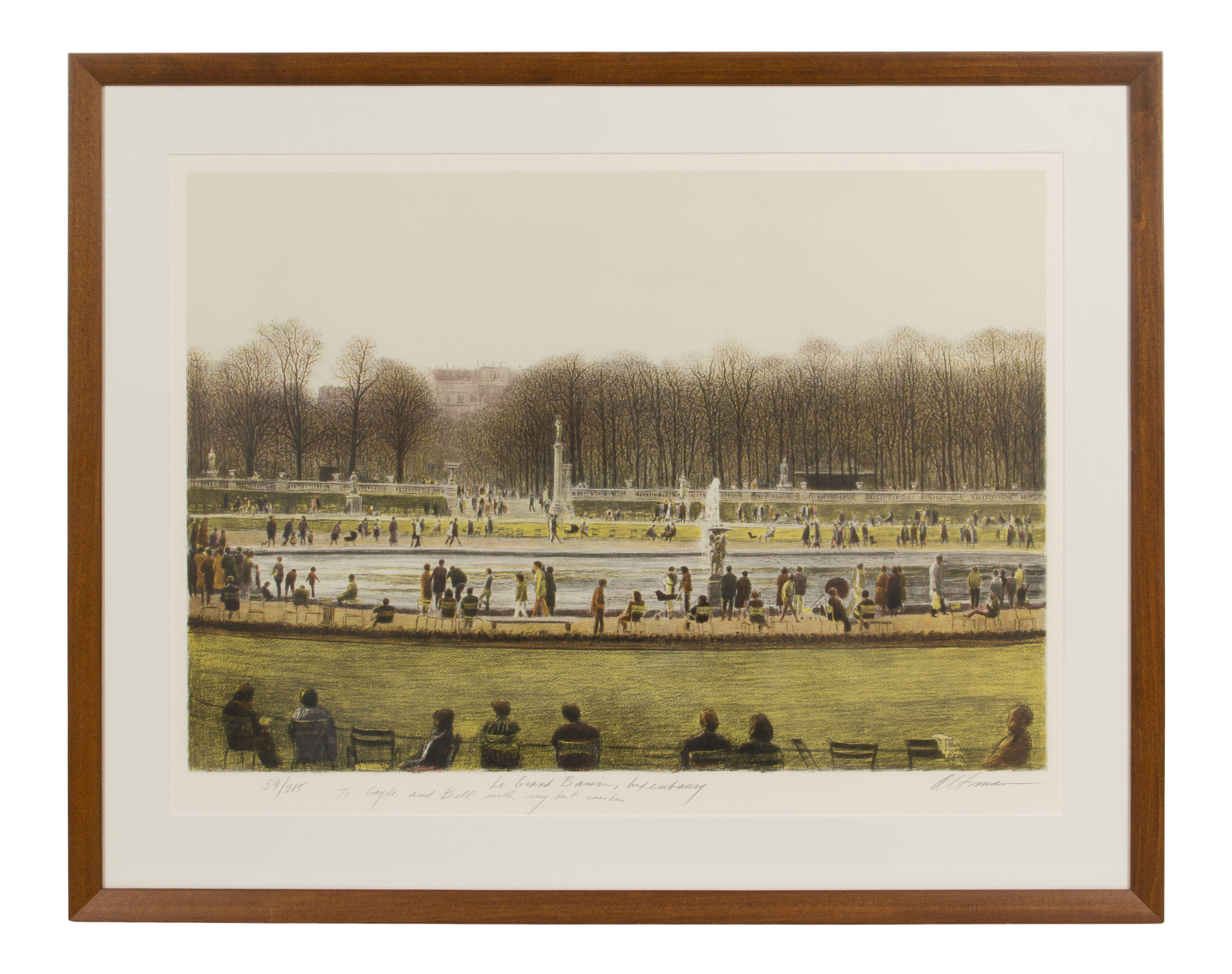 Undated, pencil signed lower right margin and #59/285, title and personal inscription center margin, blind stamp lower left, depicting a busy day in a park, matted under glass in a wood frame