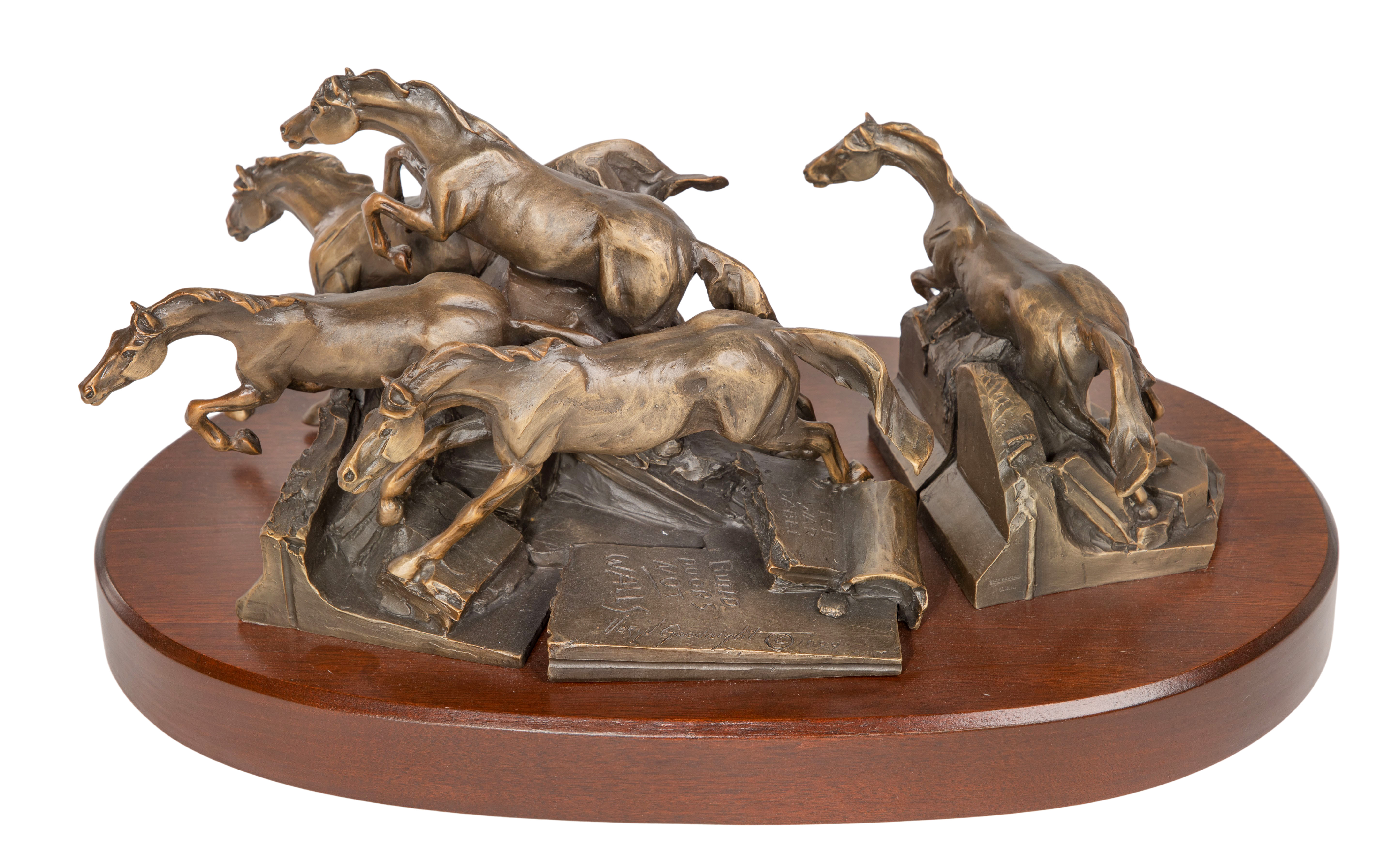 1999, signed in casting, depicting jumping horses, on a wooden base