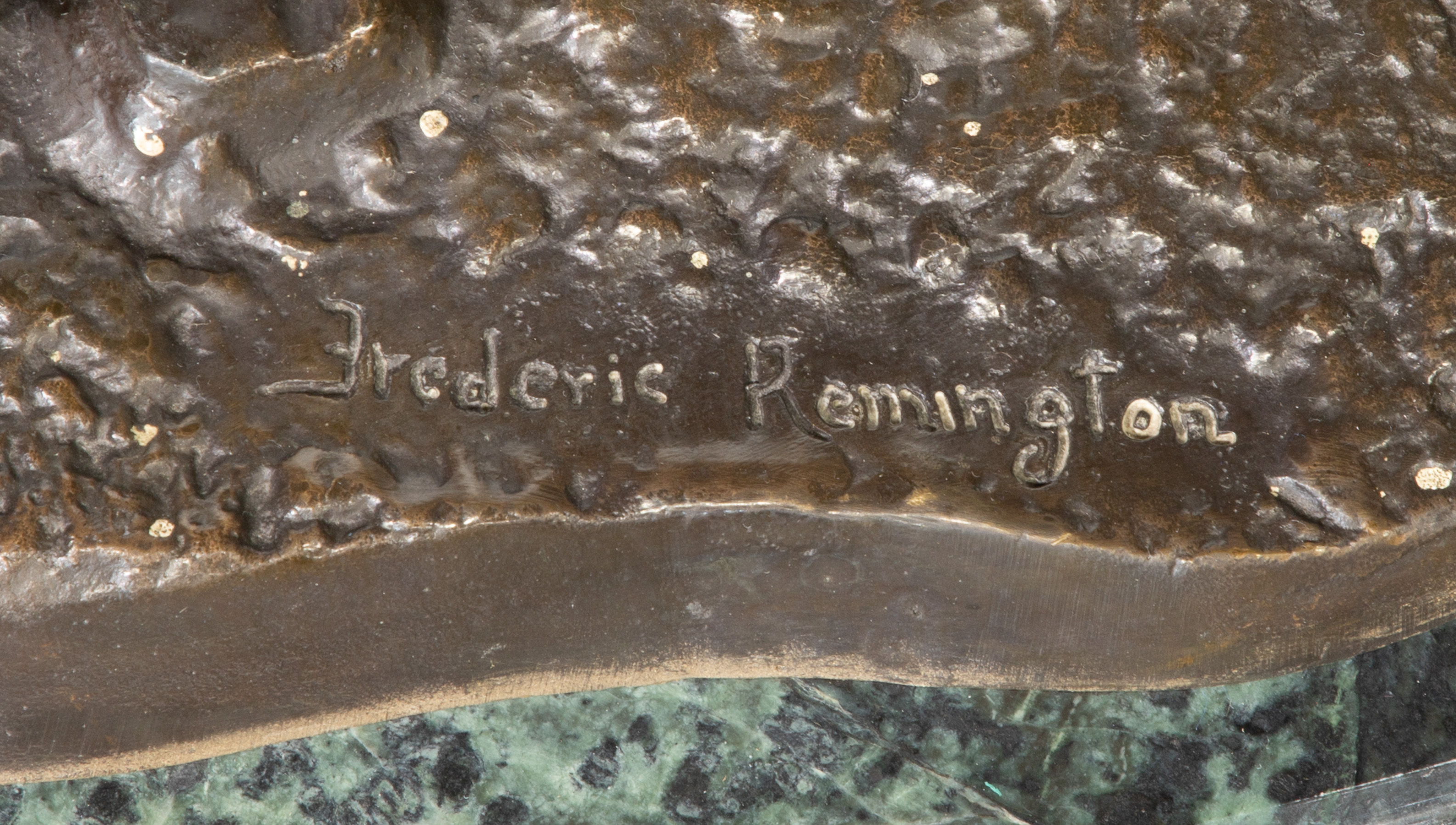 Undated, signed in casting base, depicting an armed rider on horseback, on green stone base