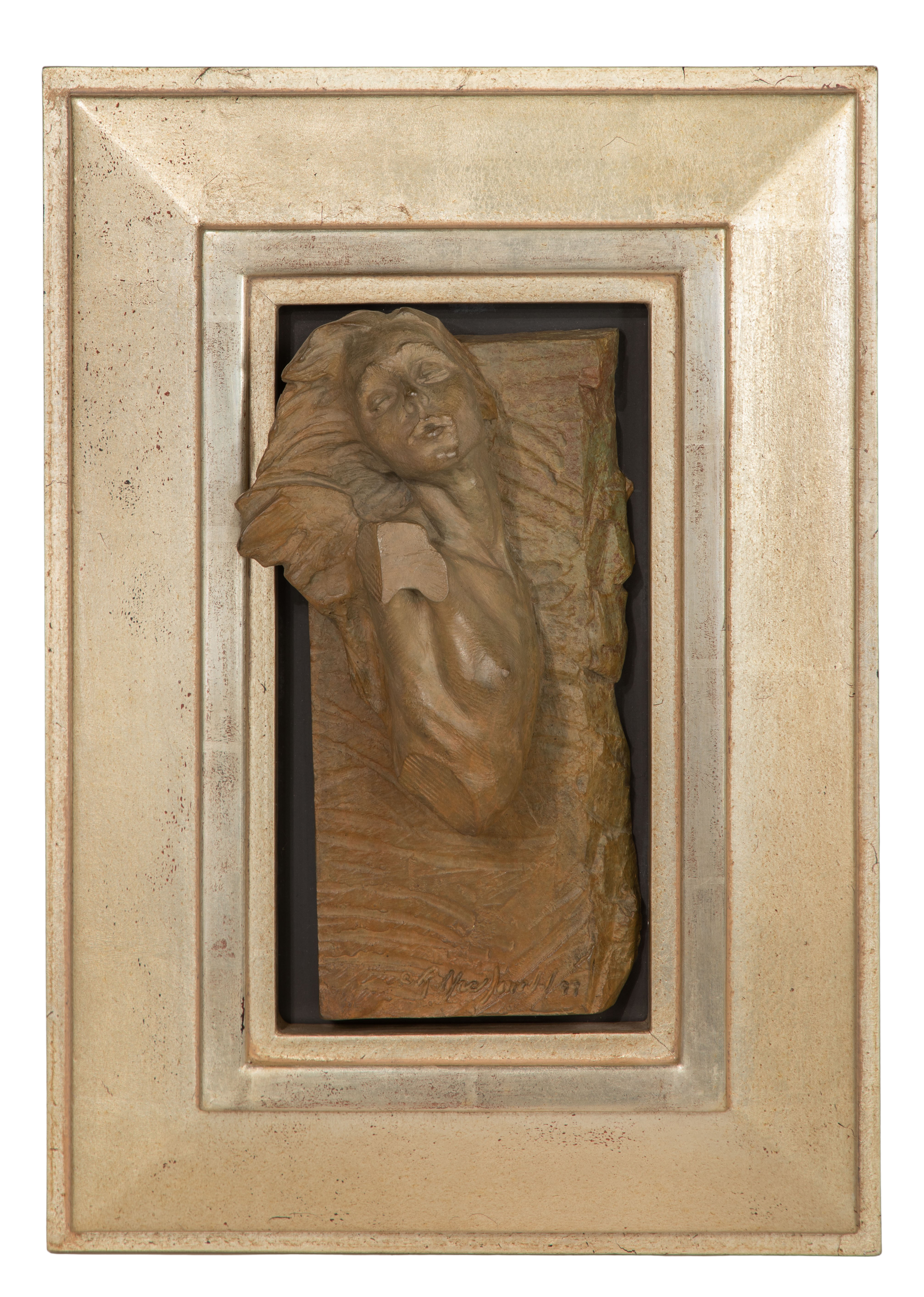 1999, incise signed, depicting a feminine form, mounted in a gold-tone wood frame