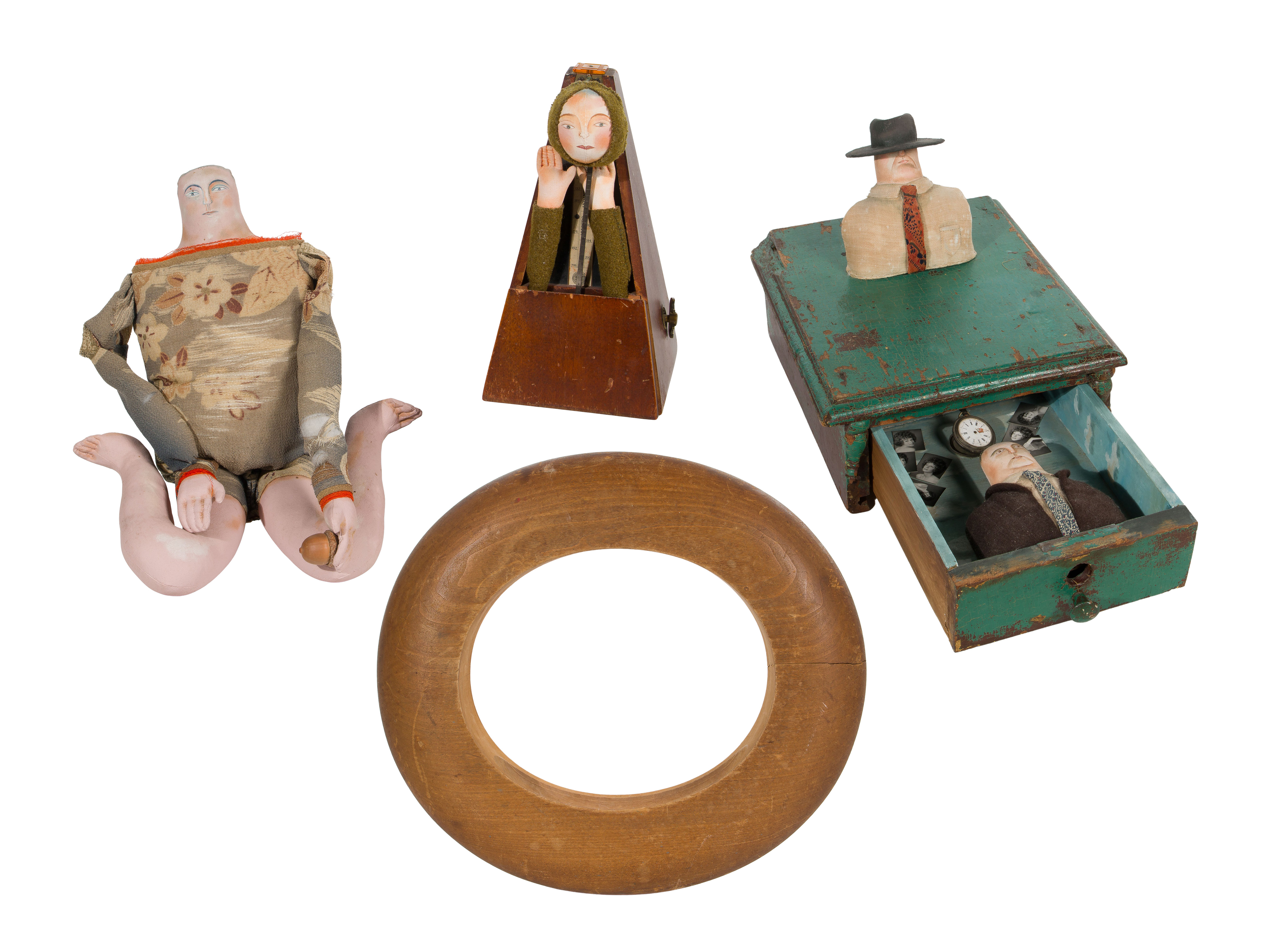 (4) items using up-cycled items and hand painted fabric heads, dated 1992, (2) having illegible signatures