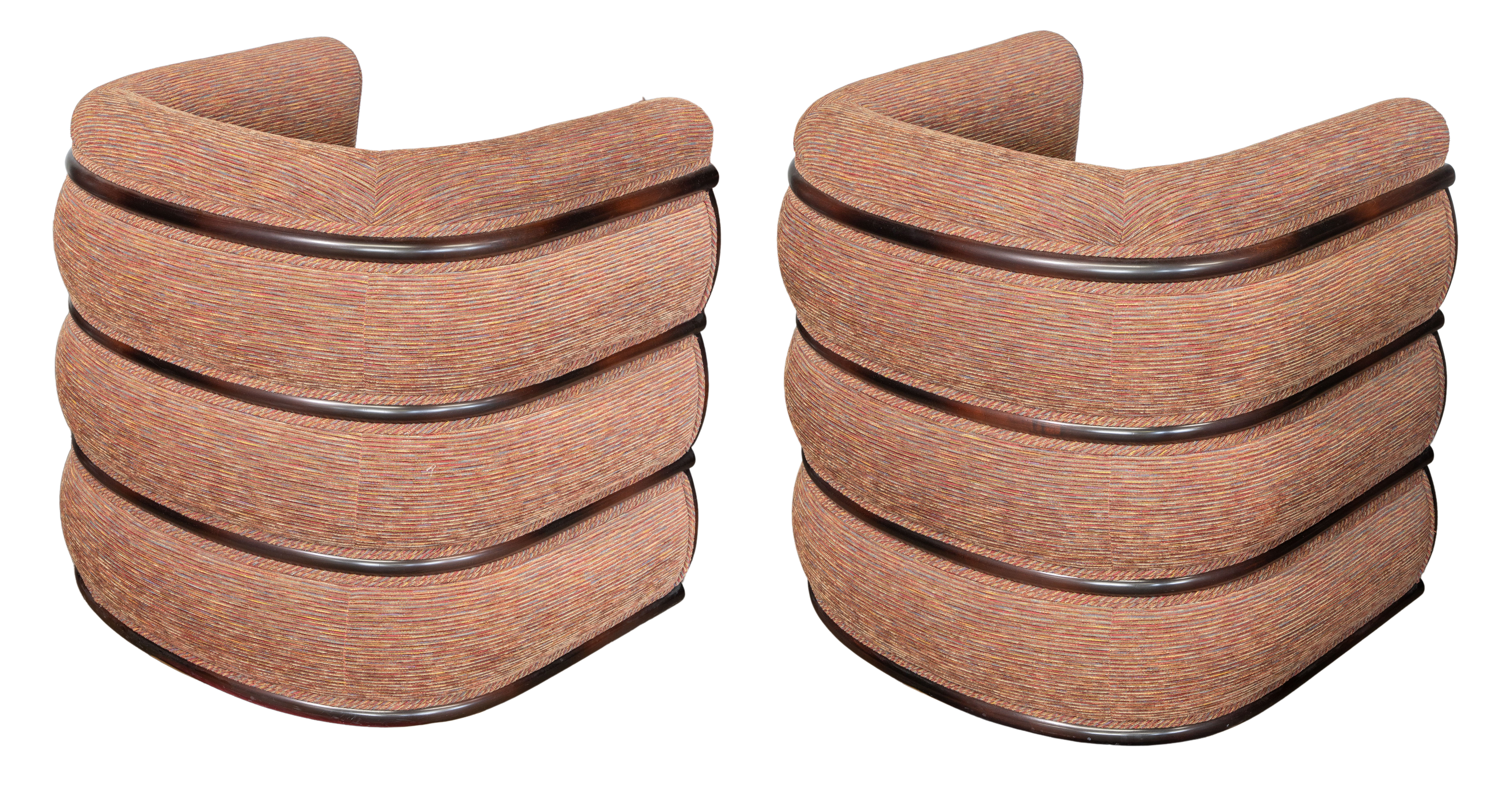 A pair of upholstered, swiveling barrel form club chairs, wood accents on front and curved wood strips around backside